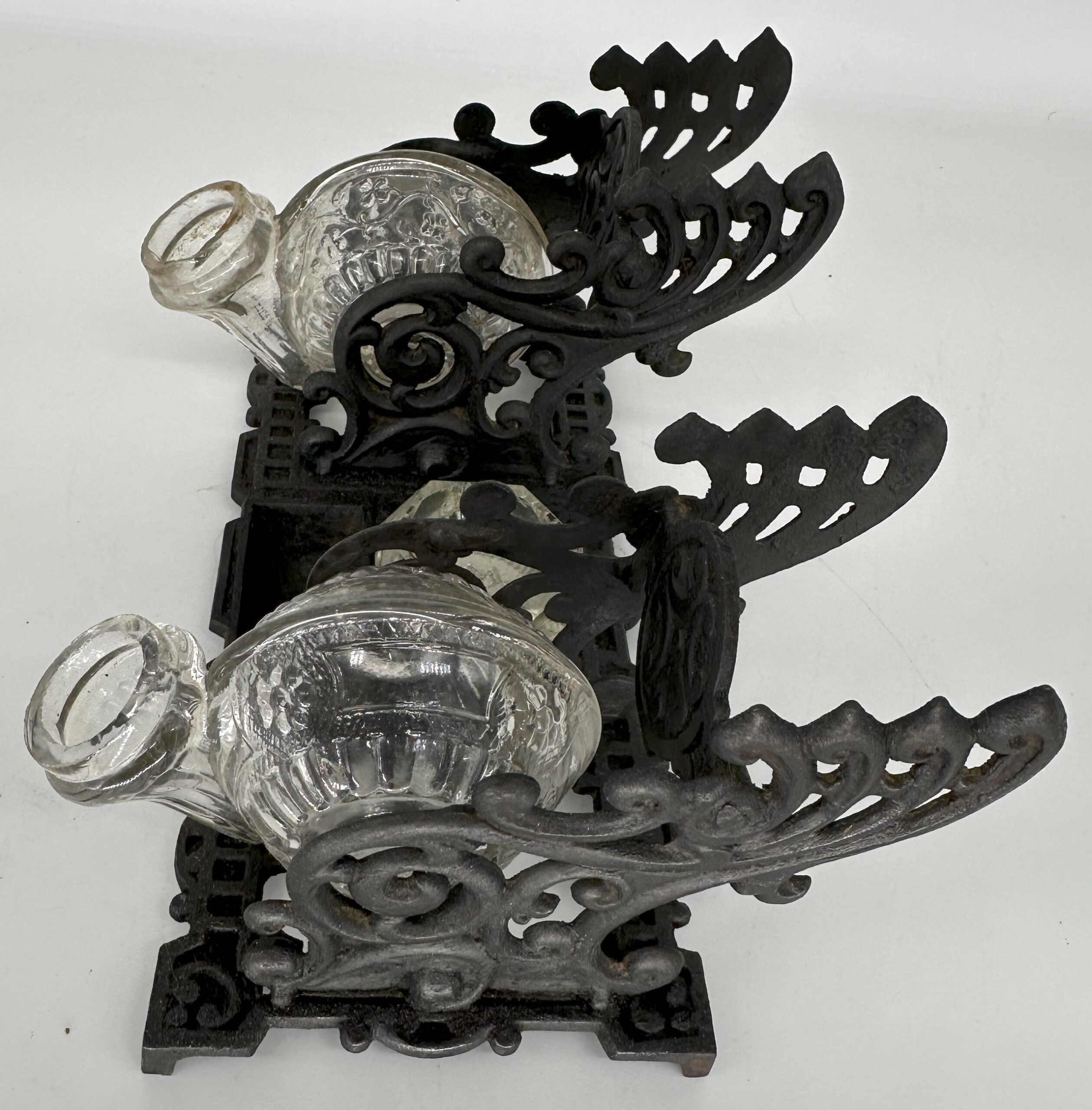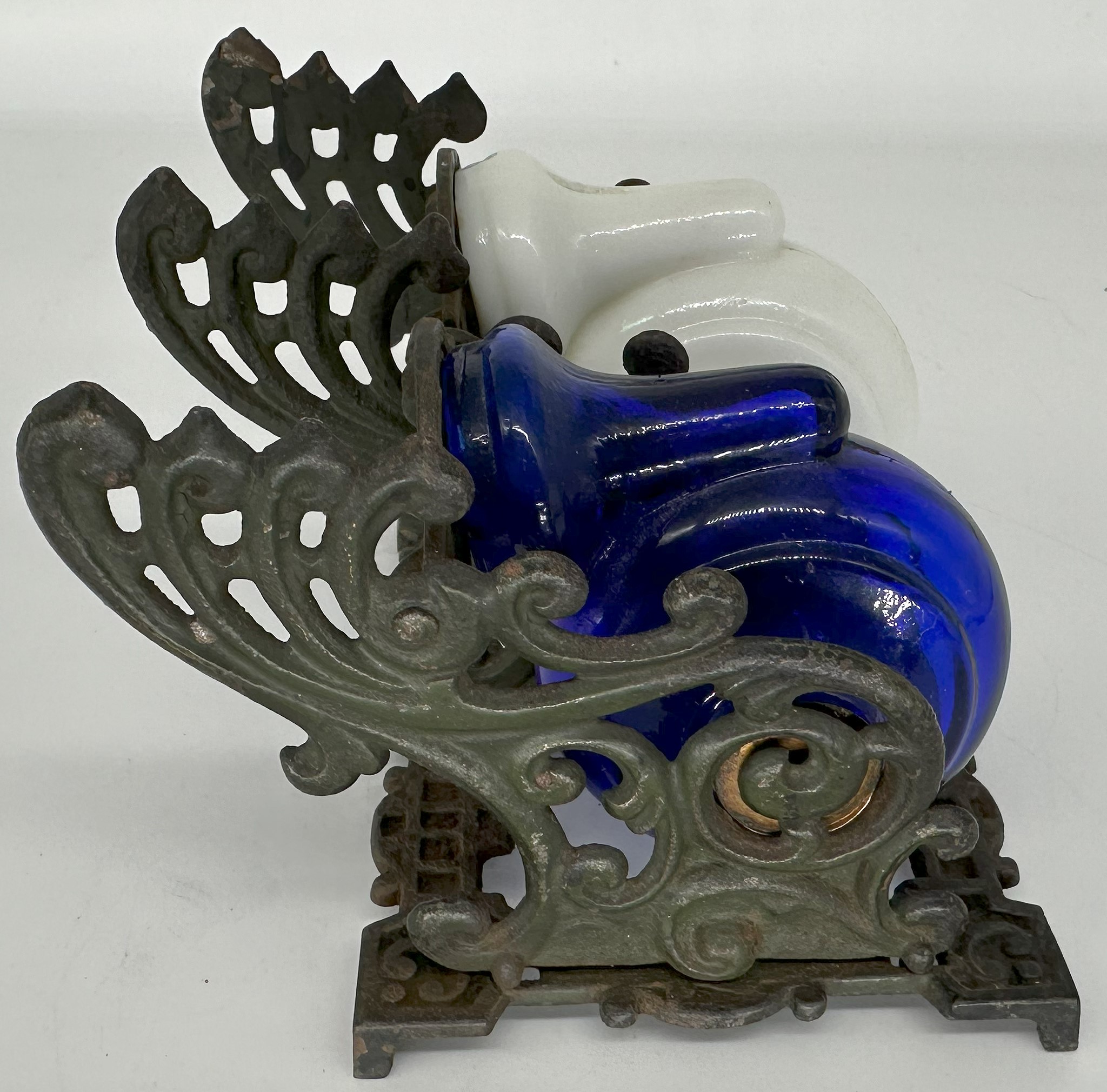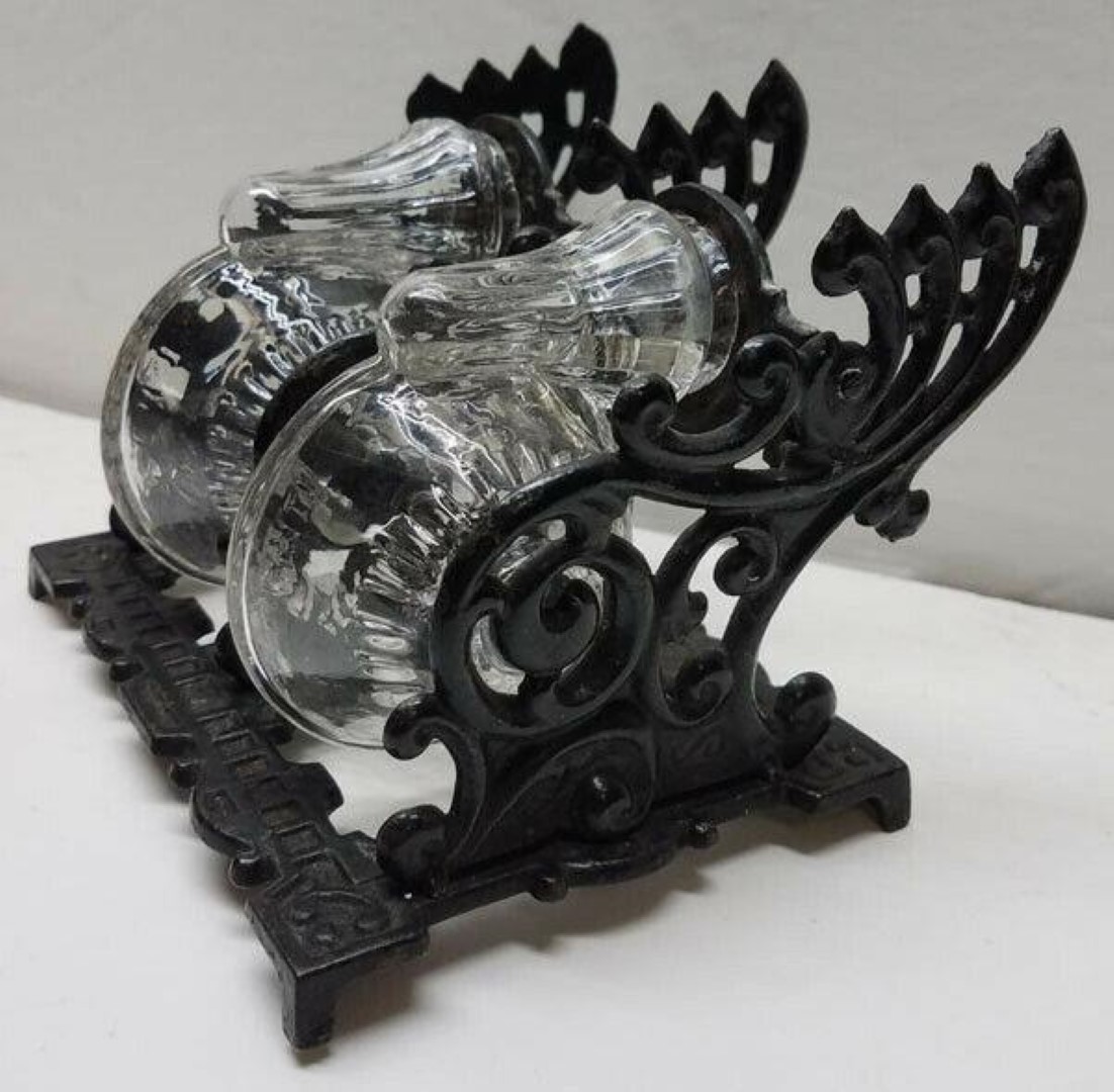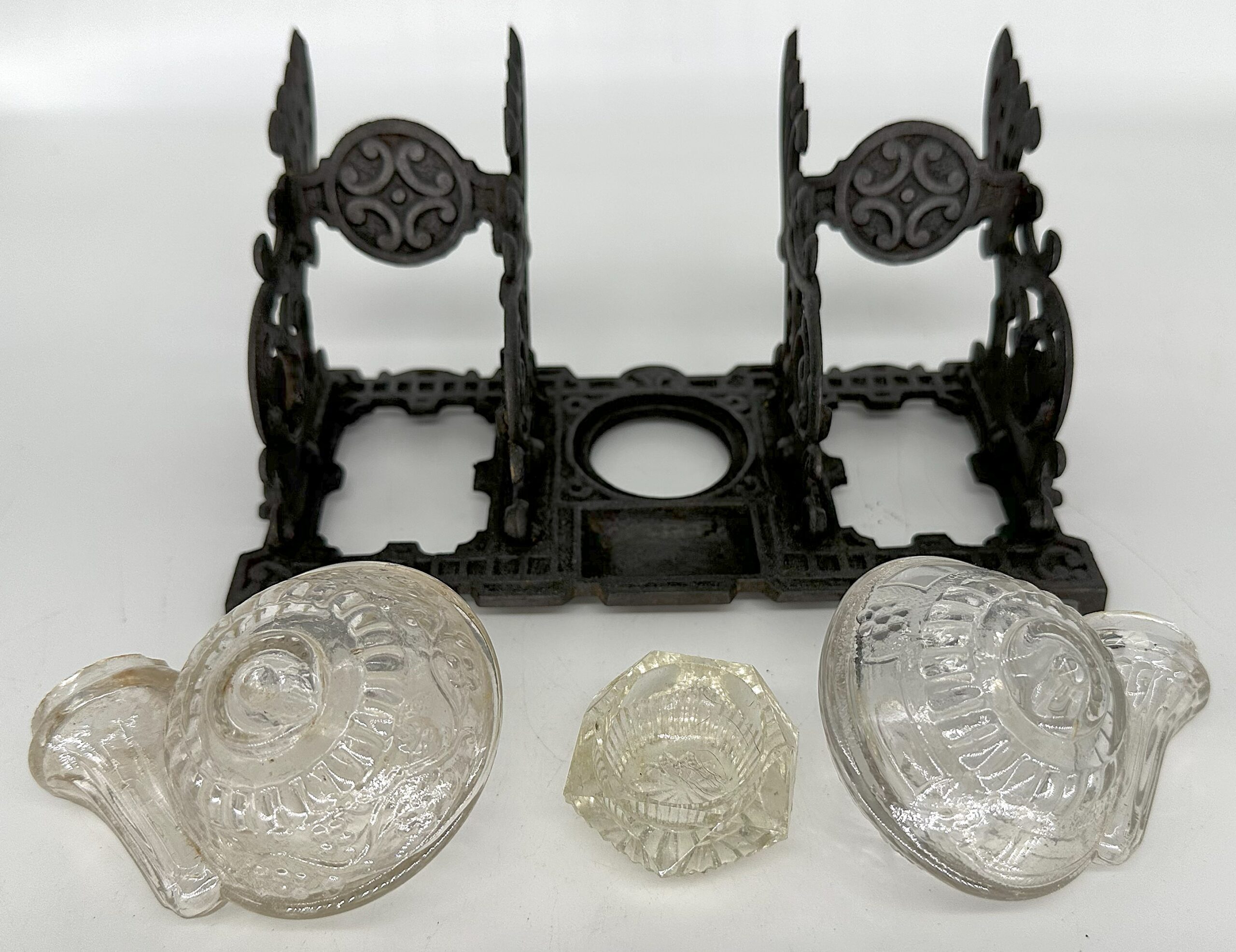 Revolving inkwells such as these pictured are usually referred to as “snails” by collectors because the inkwells have the appearance of snail shells. The four examples pictured have ornate cast iron frames in a Rococo revival style and were made by Tatum Manufacturing, Cincinnati, Ohio. They are marked on the bottom of the frame: “Tatum’s Revolving”. One opens or closes the glass snail by hand. It pivots on protrusions cast into the glass which fit into the sockets cast in the frame. When not in use, the trumpet-shaped end closes around a stopple plate (round metal cast disc). A pen rack on the top holds three pens.