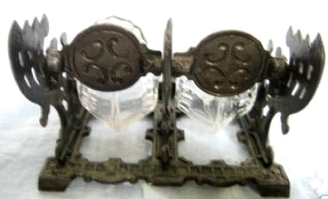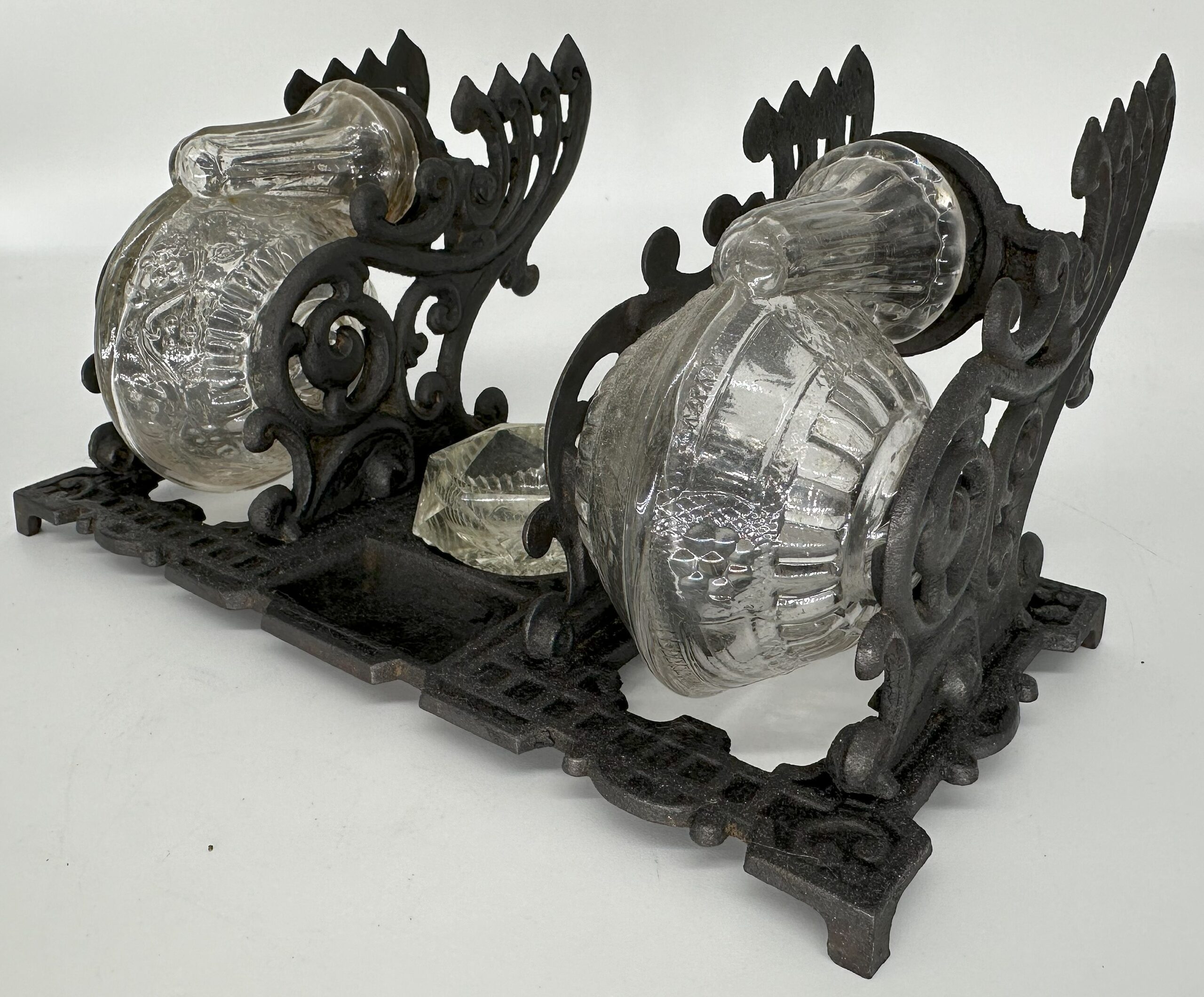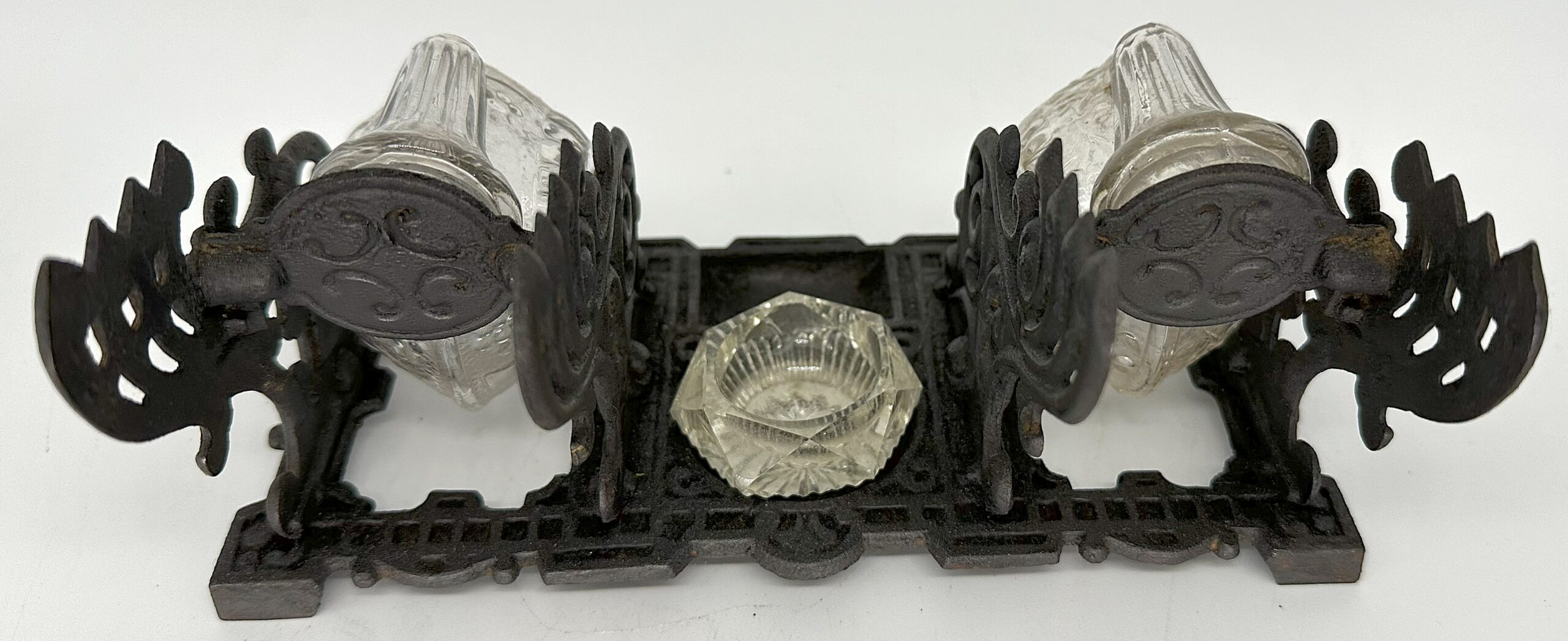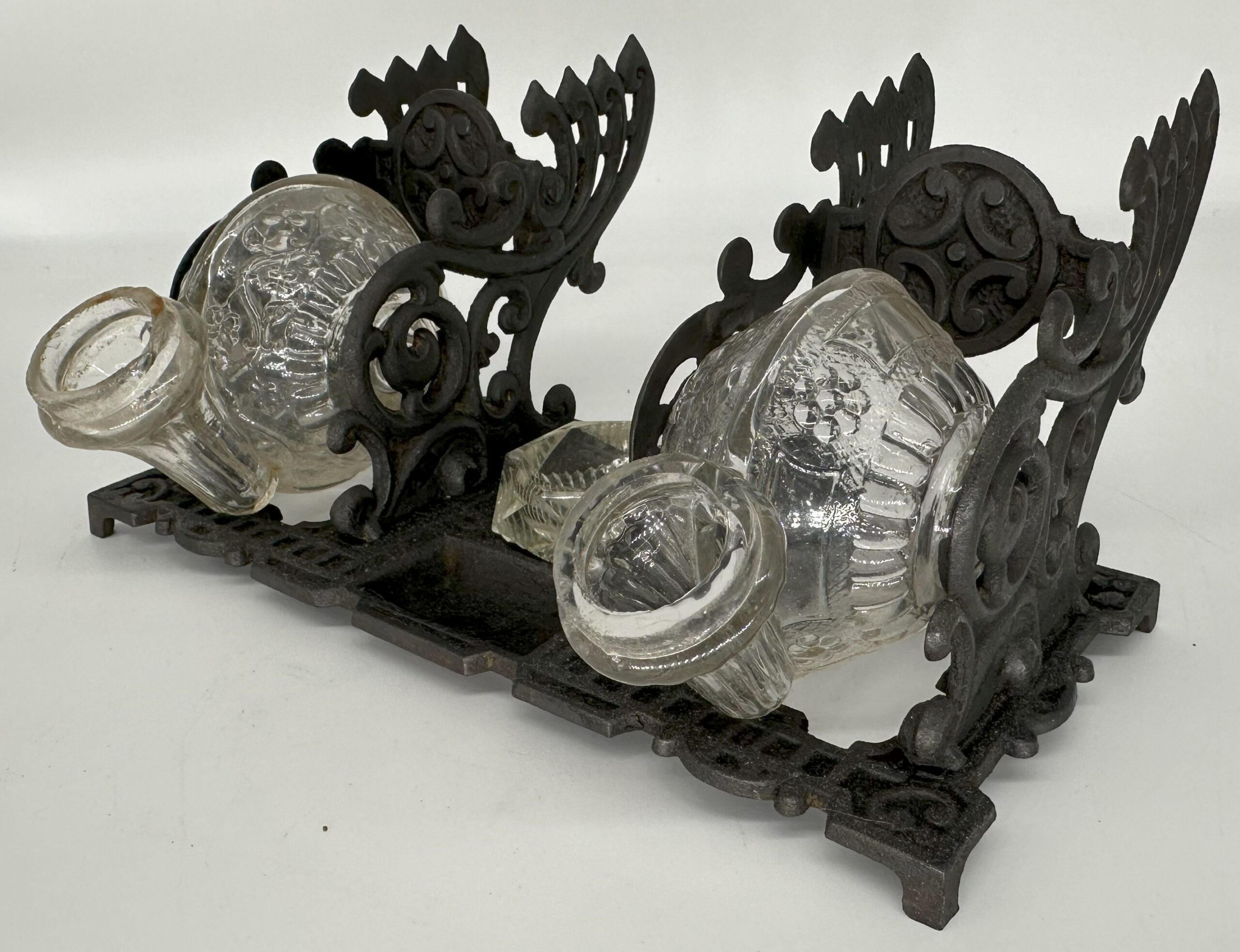 Revolving inkwells such as these pictured are usually referred to as “snails” by collectors because the inkwells have the appearance of snail shells. The four examples pictured have ornate cast iron frames in a Rococo revival style and were made by Tatum Manufacturing, Cincinnati, Ohio. They are marked on the bottom of the frame: “Tatum’s Revolving”. One opens or closes the glass snail by hand. It pivots on protrusions cast into the glass which fit into the sockets cast in the frame. When not in use, the trumpet-shaped end closes around a stopple plate (round metal cast disc). A pen rack on the top holds three pens.