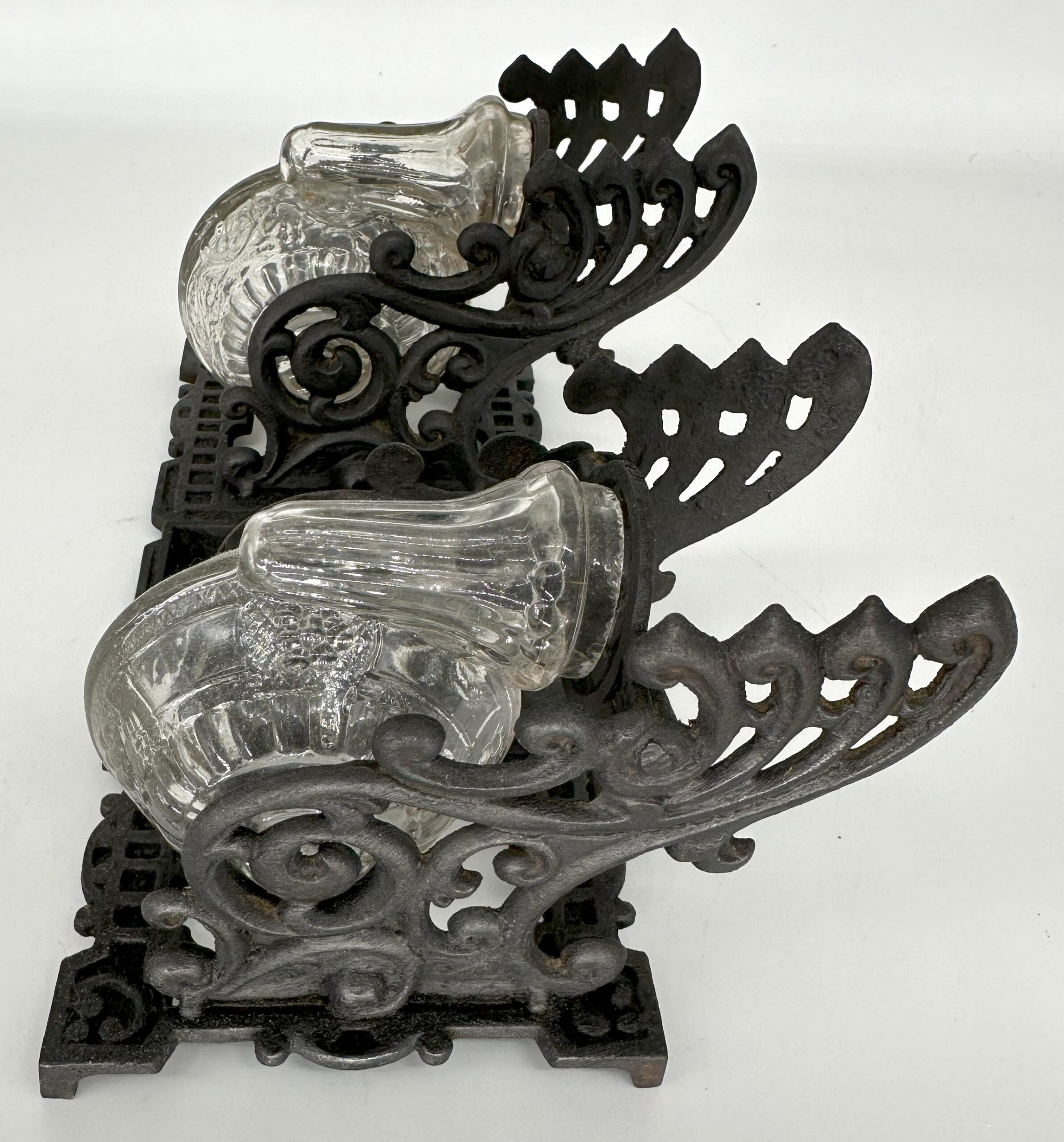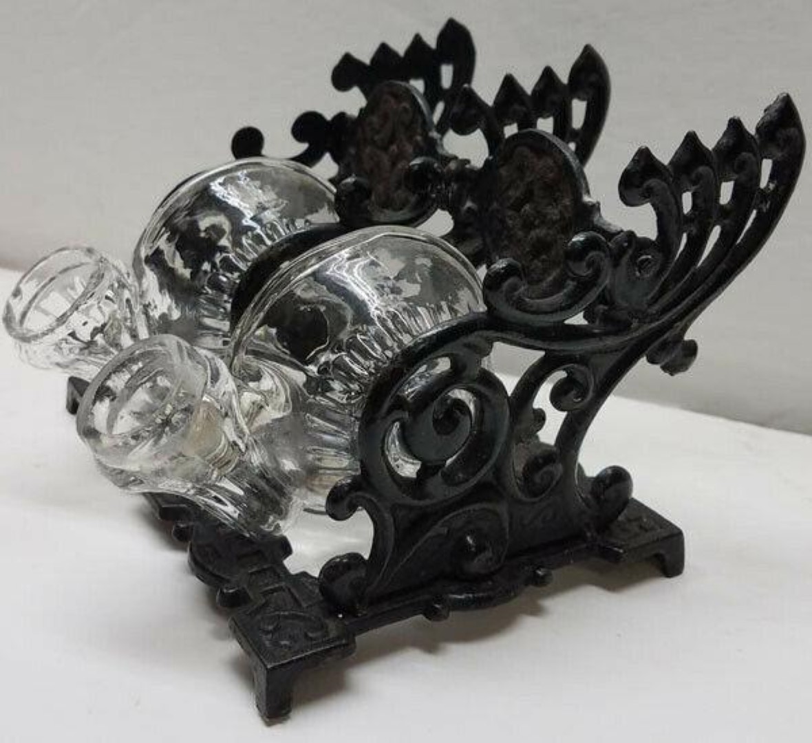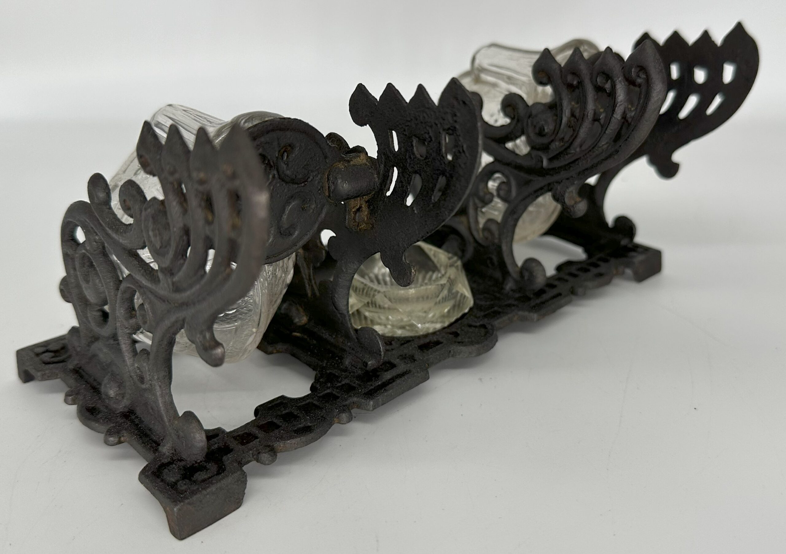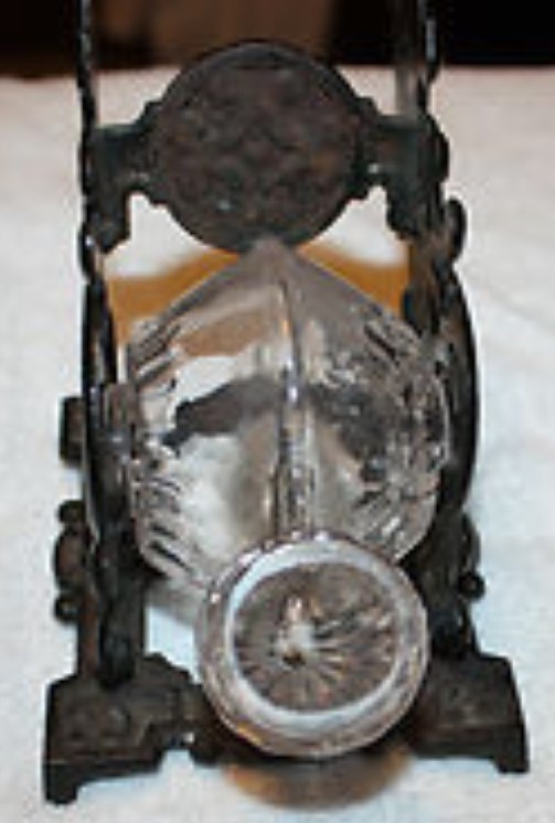 Revolving inkwells such as these pictured are usually referred to as “snails” by collectors because the inkwells have the appearance of snail shells. The four examples pictured have ornate cast iron frames in a Rococo revival style and were made by Tatum Manufacturing, Cincinnati, Ohio. They are marked on the bottom of the frame: “Tatum’s Revolving”. One opens or closes the glass snail by hand. It pivots on protrusions cast into the glass which fit into the sockets cast in the frame. When not in use, the trumpet-shaped end closes around a stopple plate (round metal cast disc). A pen rack on the top holds three pens.