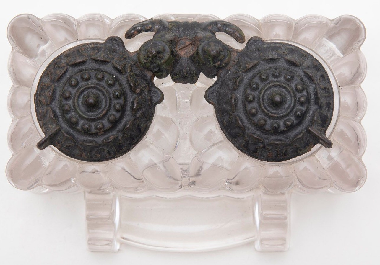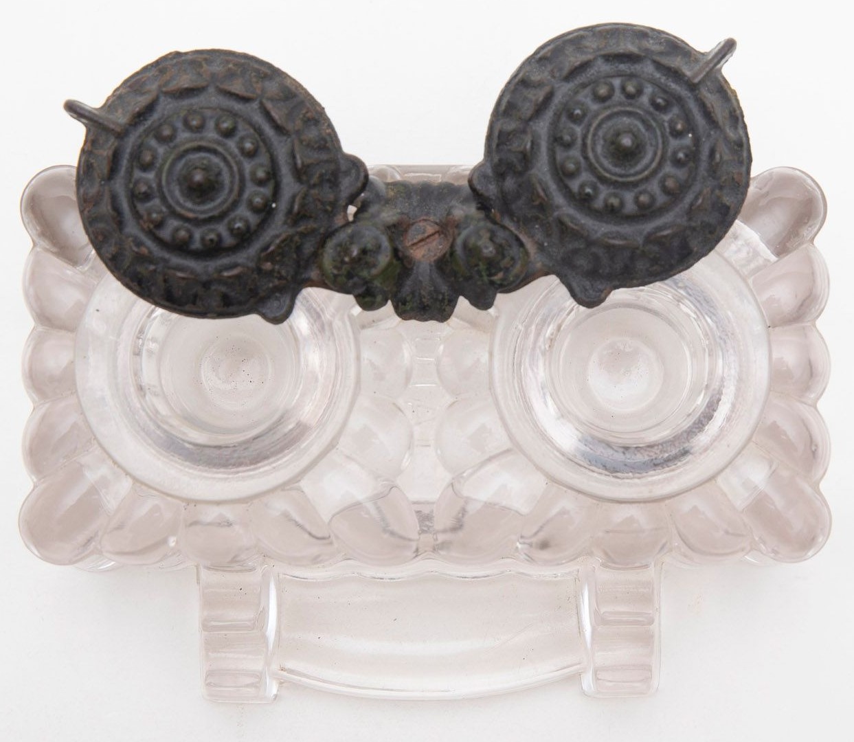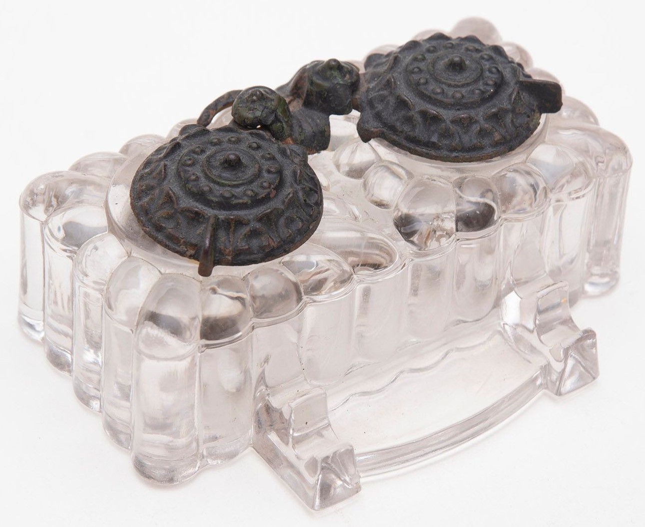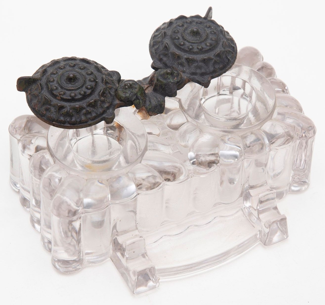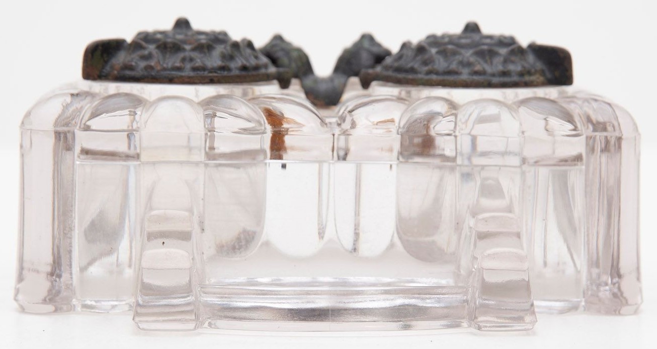 Pressed glass, lobed body double inkwell with cast iron swivel service lids, double pen rest and nib tray. Impressed “Tatum” on the bottom. Lids signed “Tatum” and “Pat Appd For”. Rust stain on item pictured.