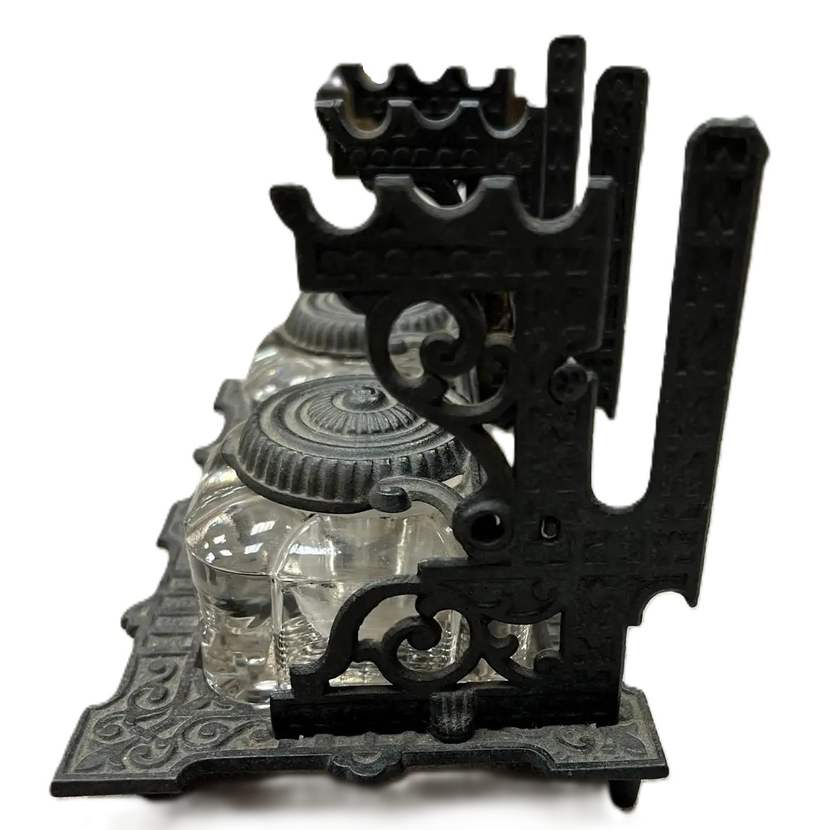 This Tatum’s Postal Inkstand is a piece of industrial-age Americana. Its heavy cast iron construction and “Gothic Revival” scrollwork are typical of the late 19th-century aesthetic, where even the most functional office equipment was expected to have decorative flair.