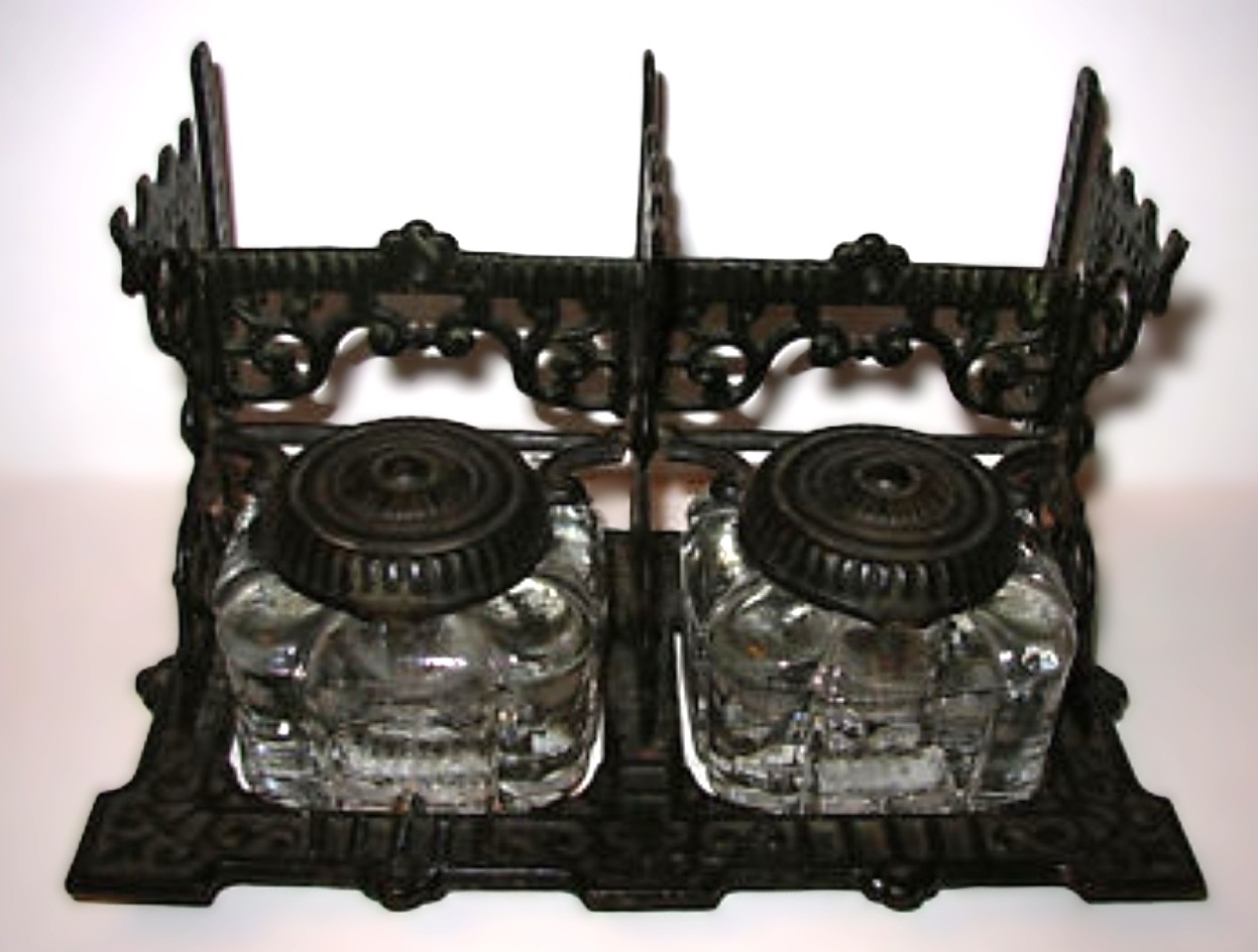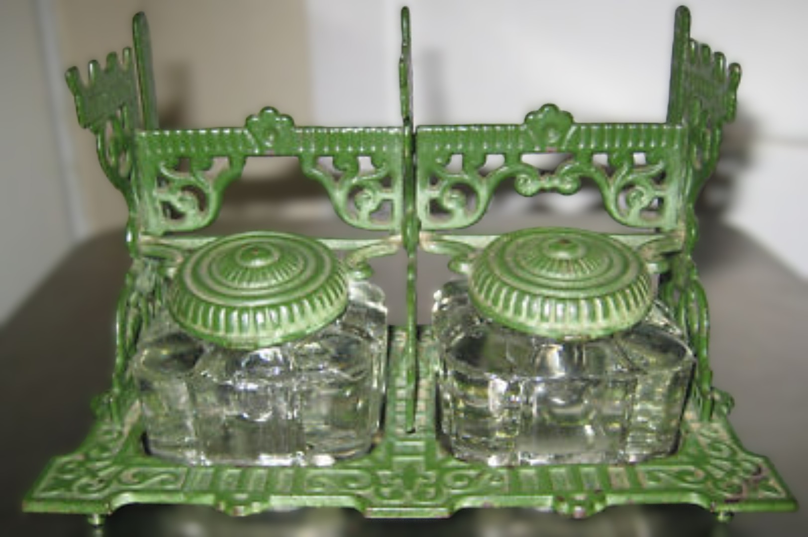 In the 1890s, these sets were sold through major stationery wholesalers like the Tower Manufacturing Co. or the American News Company. These inkstands came with different finishes: black enamel; green enamel; brass plated. They were also sold as “double” and “single” inkstands.