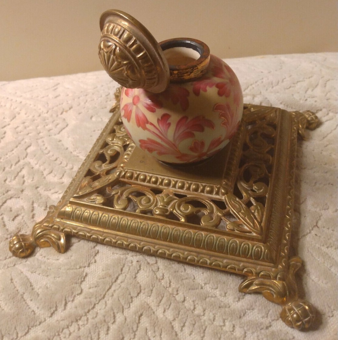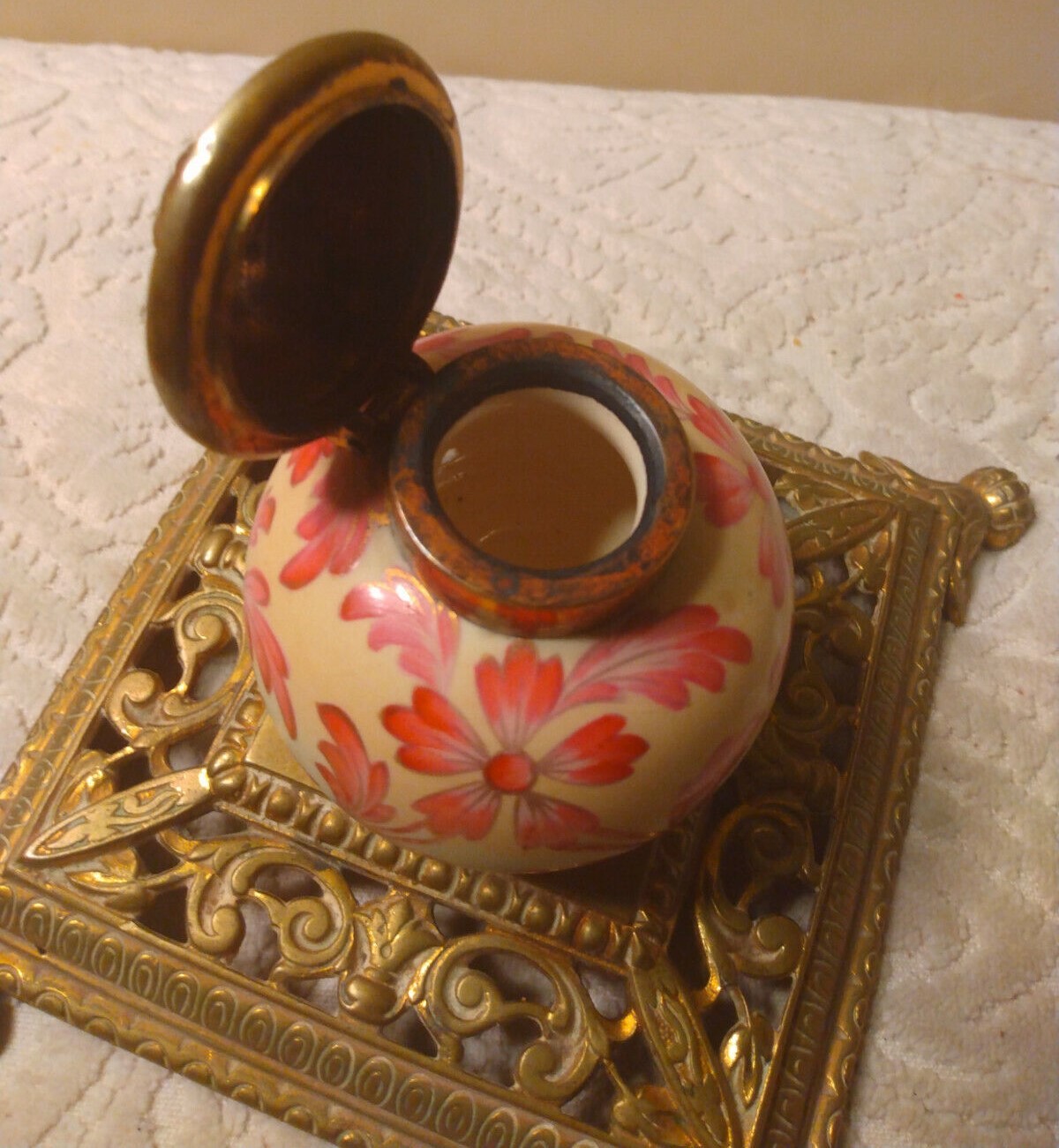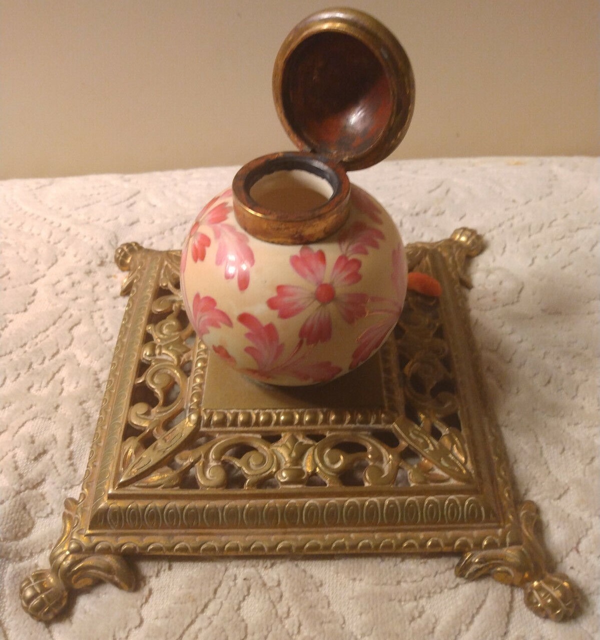 This inkstand made by the Taylor Tunnicliffe Co. features a hand painted porcelain inkwell on an ormolu base. (Ormolu is a gold-colored alloy of copper, zinc, and tin). The inkwell bears the mark of the company.