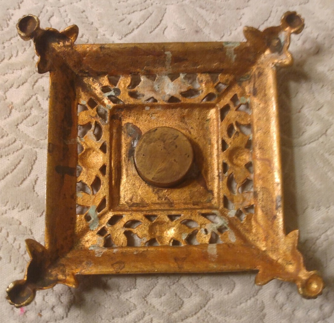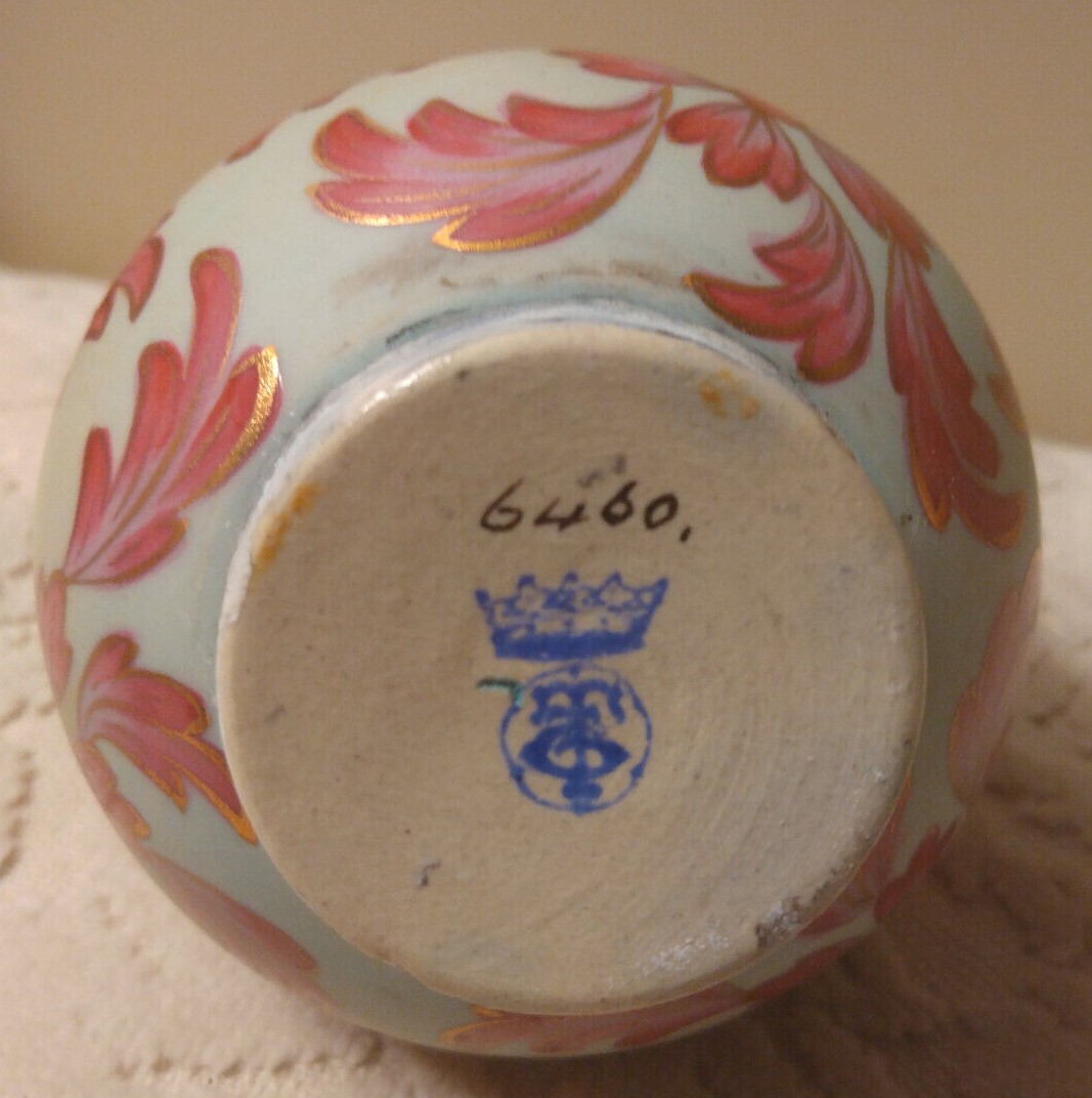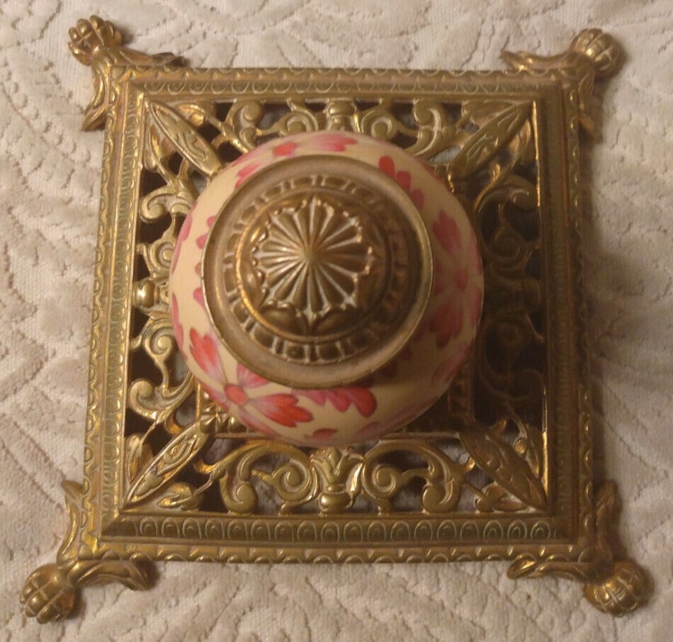 This inkstand made by the Taylor Tunnicliffe Co. features a hand painted porcelain inkwell on an ormolu base. (Ormolu is a gold-colored alloy of copper, zinc, and tin). The inkwell bears the mark of the company.