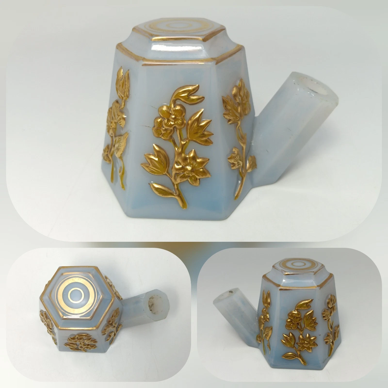 - The Hexagonal Design: The hexagonal base and body were standard for their molded “fancies” of the late 19th century. These pieces often featured the raised gold floral pattern which was applied by hand using thick enamel and 22k gold leaf.