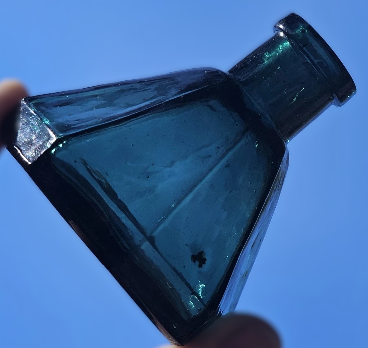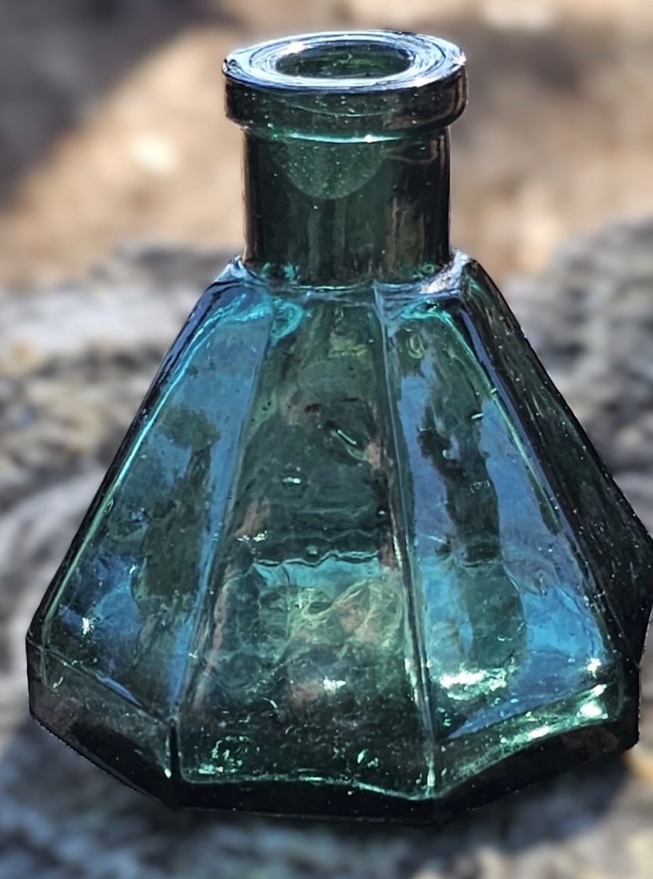 This is a nice example of a 19th-century “umbrella” ink bottle, so named for its multi-sided, conical shape that resembles an open umbrella. These were utilitarian items, but the vibrant color and primitive manufacturing details make them of interest today.