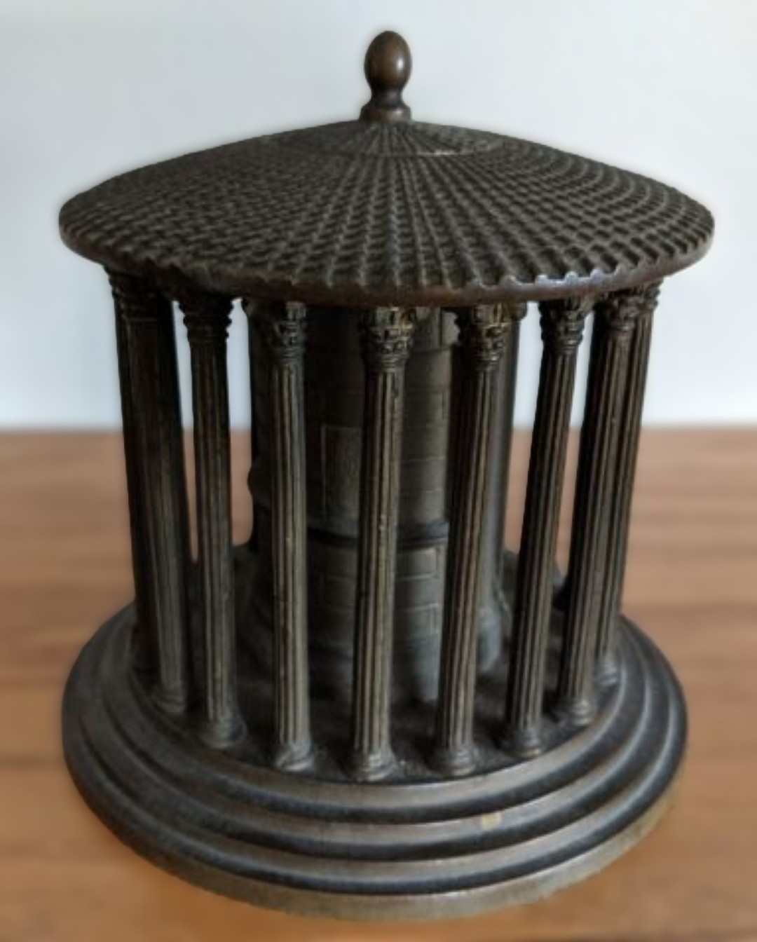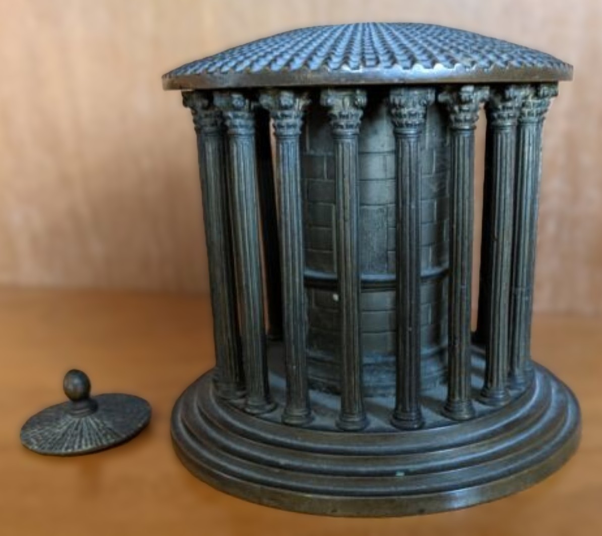 • Form: The inkwell is a detailed miniature of a classical Roman tholos (circular temple). The bronze structure faithfully reproduces the cylindrical cella (inner chamber) surrounded by a ring of columns.
