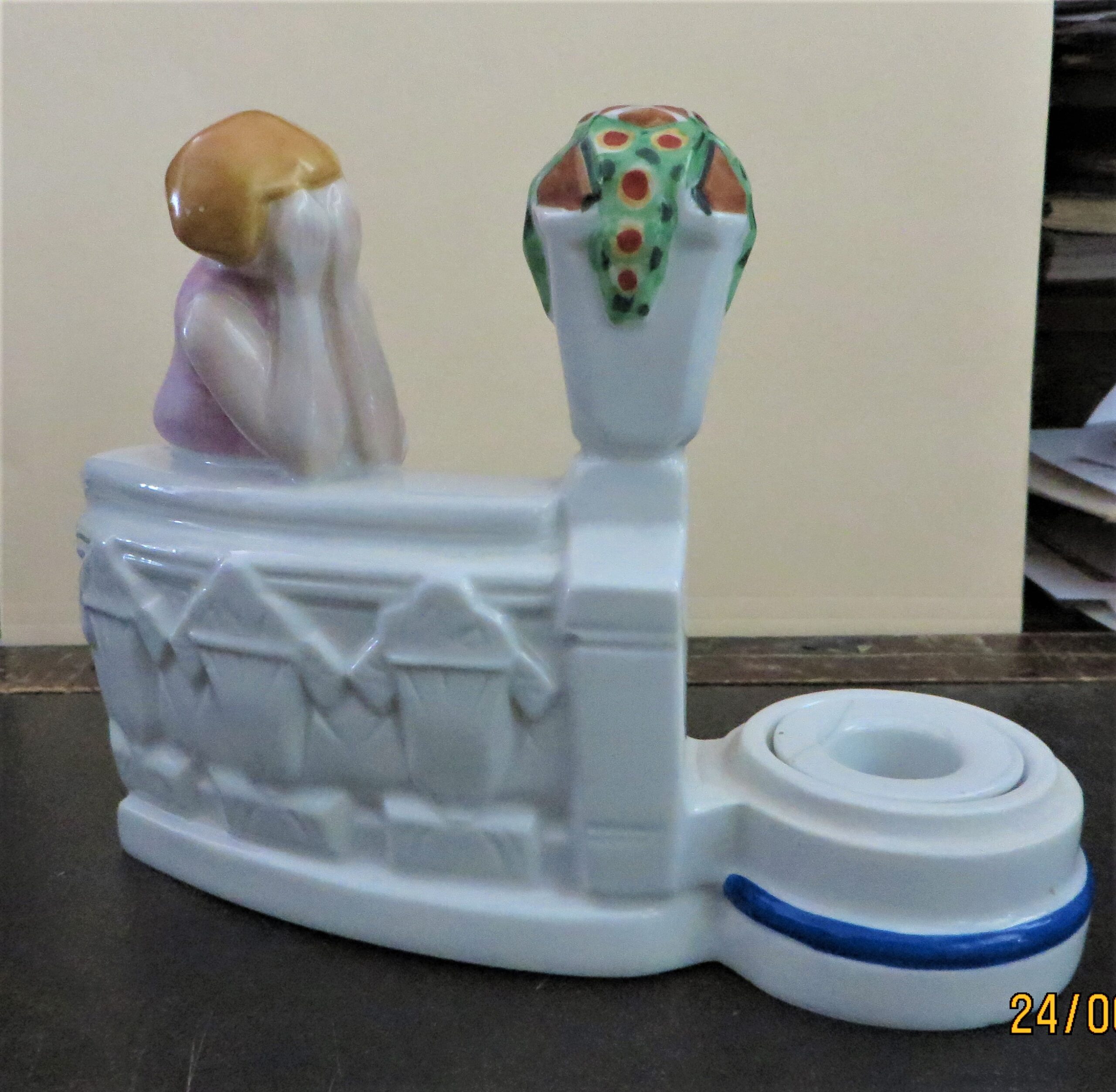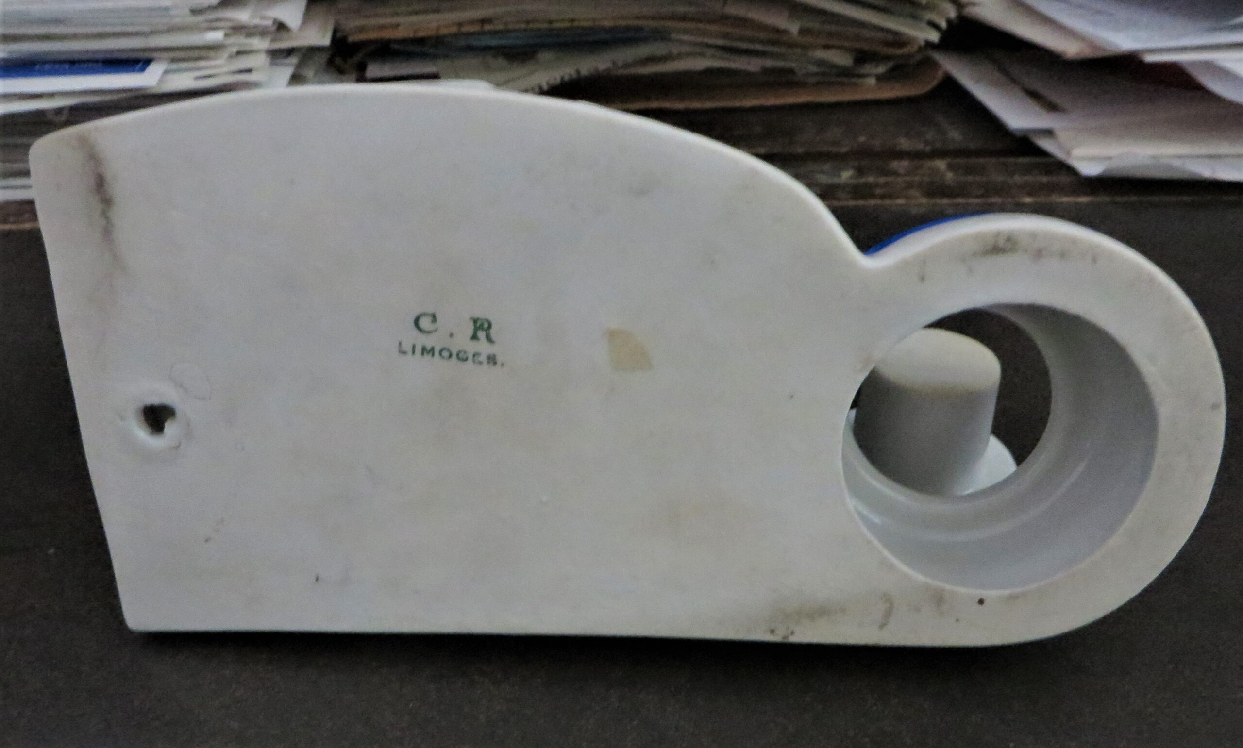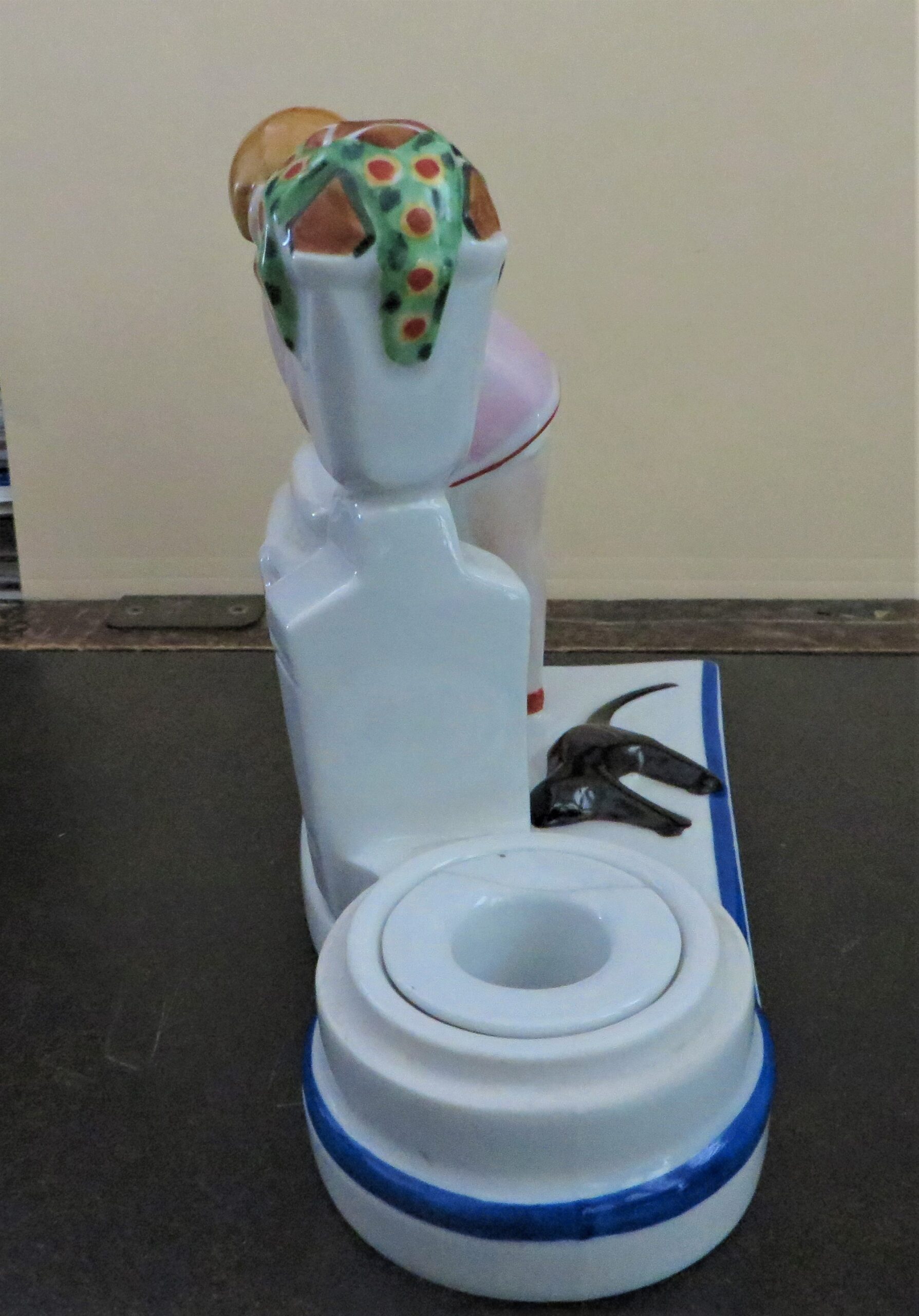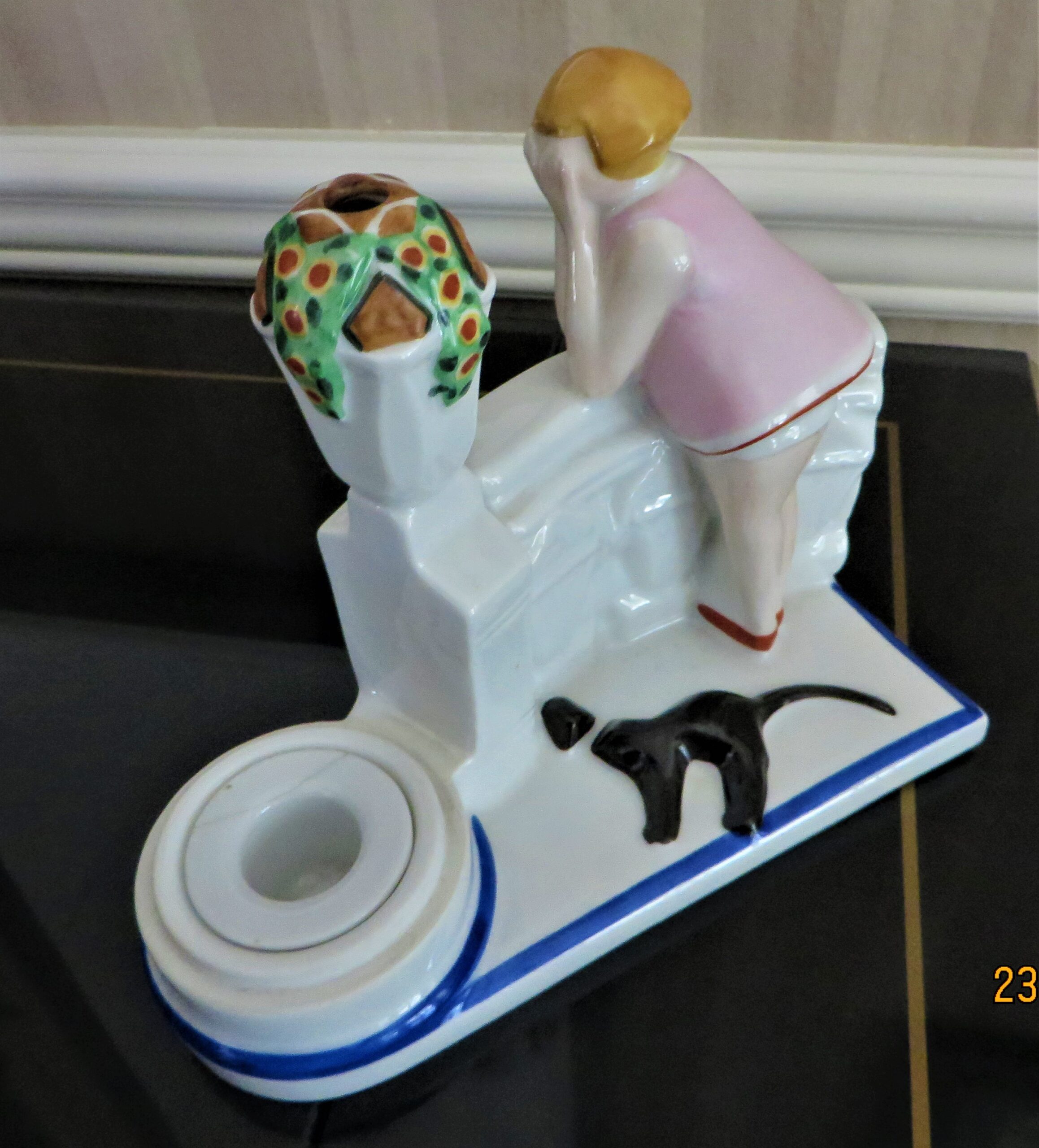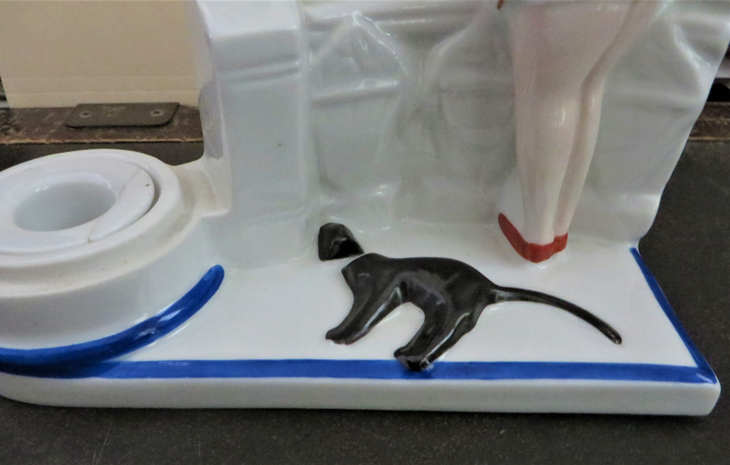 A Limoge porcelain figural inkwell of woman distraught apparently over her cat lying at her feet. The ceramic inkpot is removable and the hole in the top of what looks like a planter could be used as a holder for a quill. While an article in WorthPoint indicates that the “C. R.” mark was used on early pieces, the late eighteenth century, the attire of the woman more likely suggests the piece is modern.