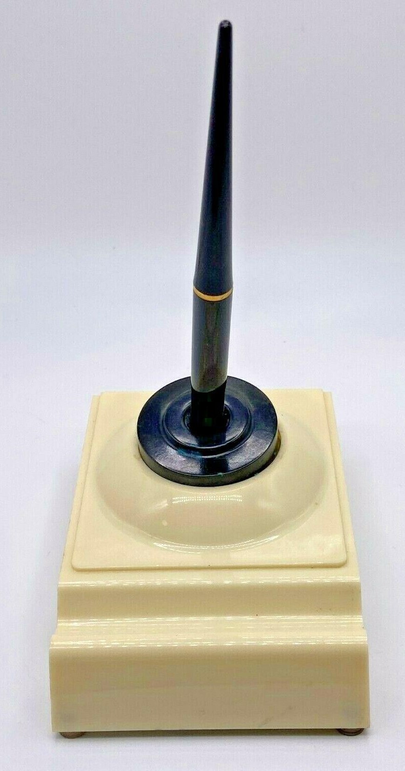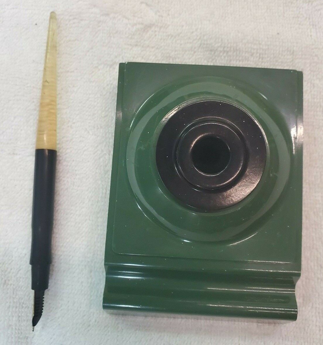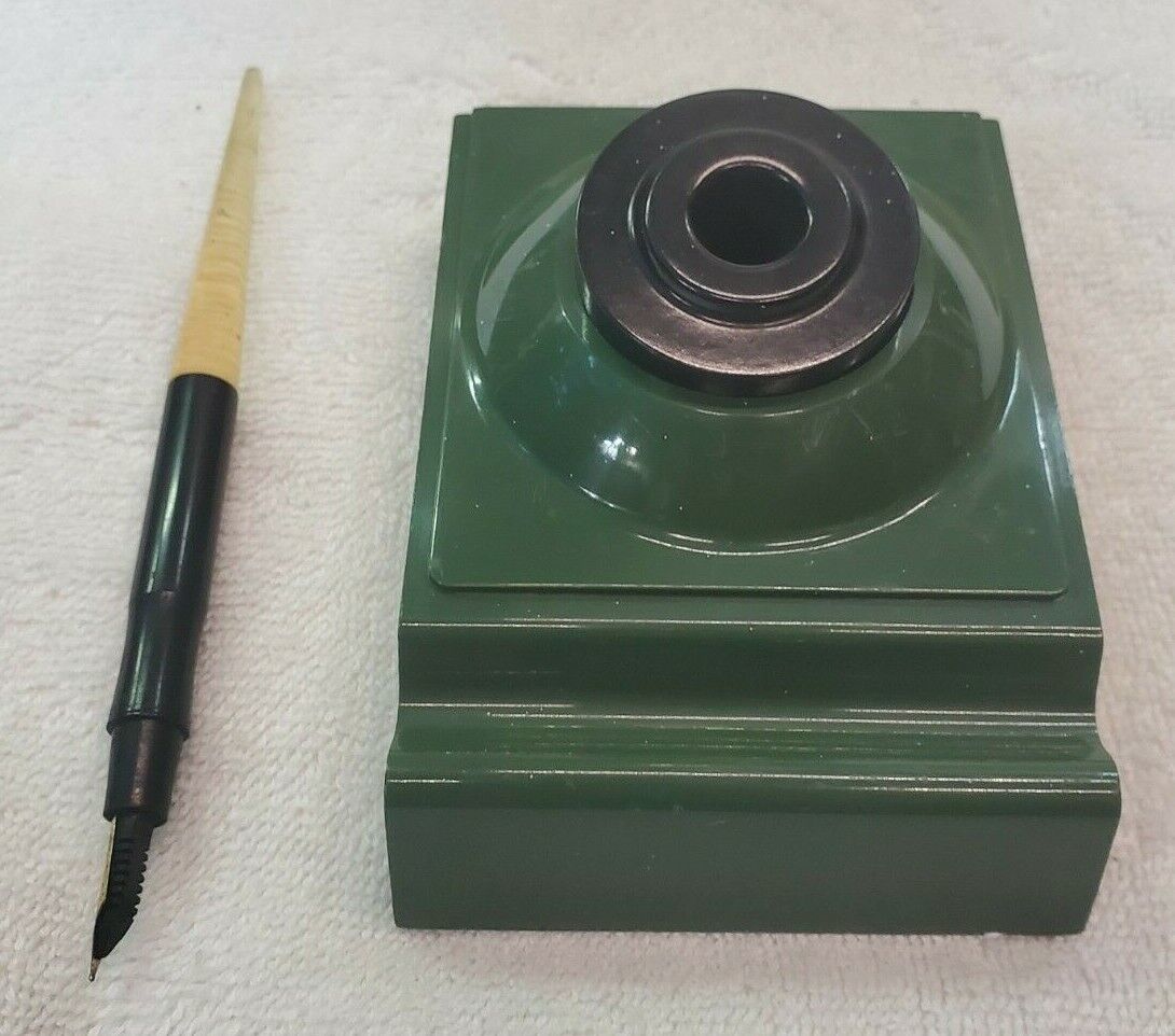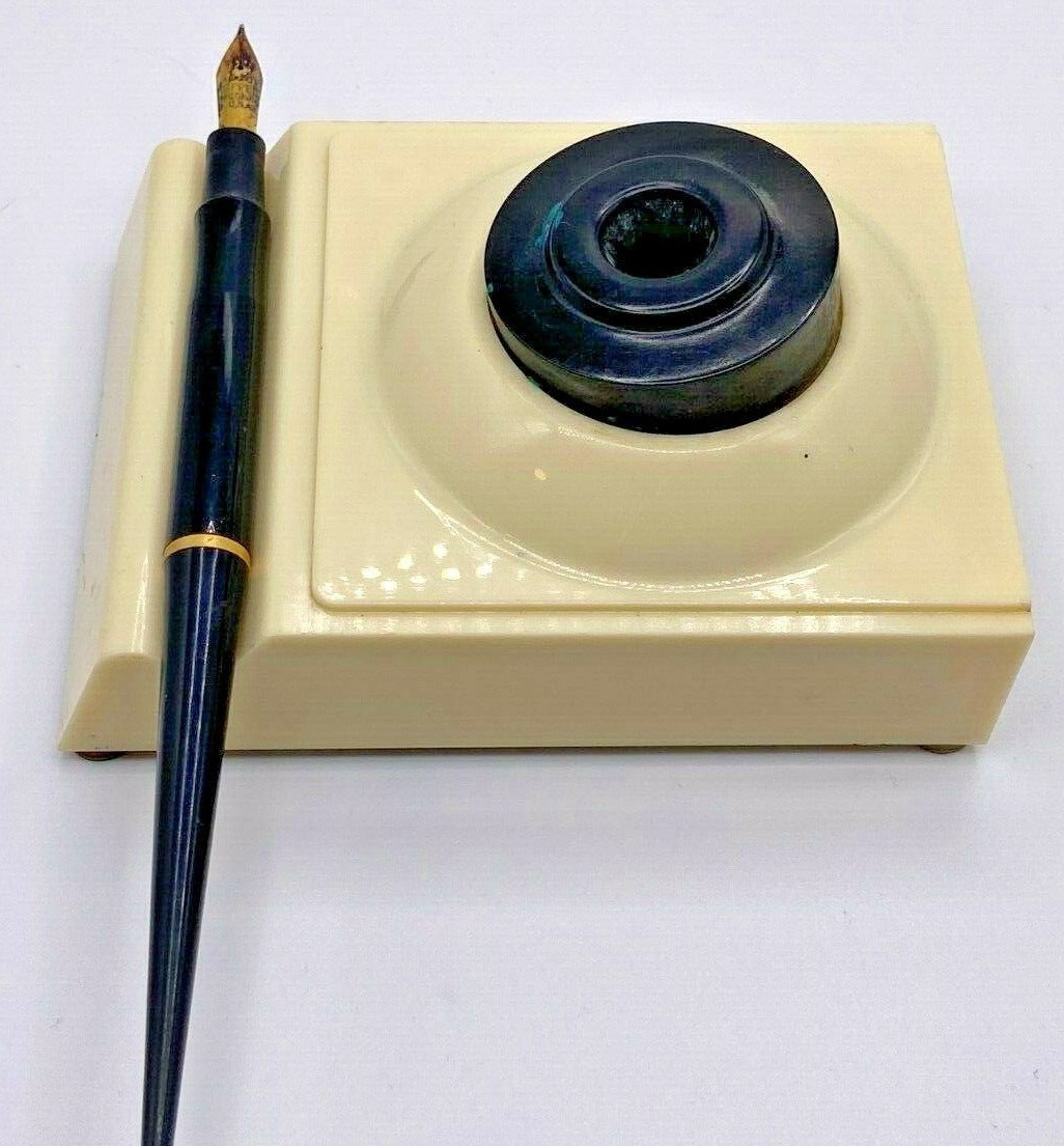 This combined inkwell and pen stand is called “The Madison”. The base has an Art Deco-inspired design, with a stepped, geometric shape. It is made with “Styron” – a type of polystyrene plastic developed by Dow Chemical. The set was made in various colors. The top unscrews to allow filling the cavity with ink. The manufacturer was Preferred Products Co., 2213 Ashland Ave, Toledo, 10, Ohio. This inkstand dates to the 1950’s. While Art Deco’s peak was in the 1920s and 30s, its design elements continued to be used in modified forms in later decades.