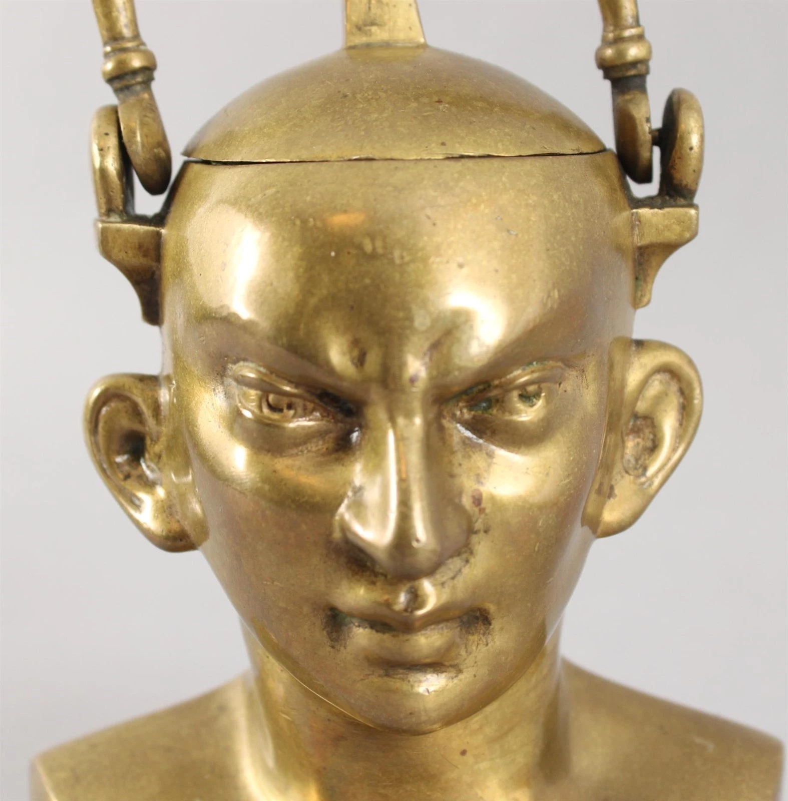 The pointed ears, bald head, and strange angular features look strikingly alien to modern eyes, resembling 1920s–50s sci-fi depictions of Martians or a man from outer space – even a resemblance to Dr. Spock. This inkwell dates to around 1900. Its maker did not intend to depict a space alien.