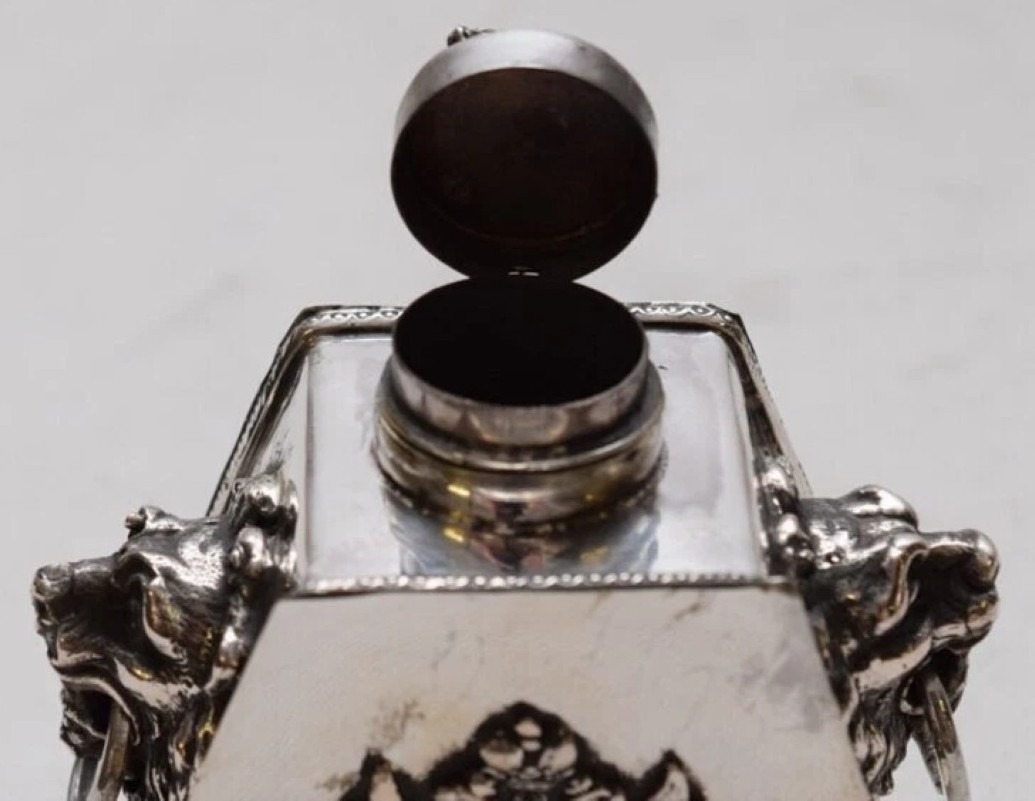 Summary: This is a Polish/Russian Empire Silver (84 Zolotnik) inkstand, featuring a heraldic crest and lion motifs. It dates to the late 19th or early 20th century, but the specific “applied” style suggests it may be from a Warsaw maker rather than a Moscow or St. Petersburg firm.