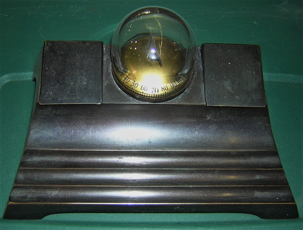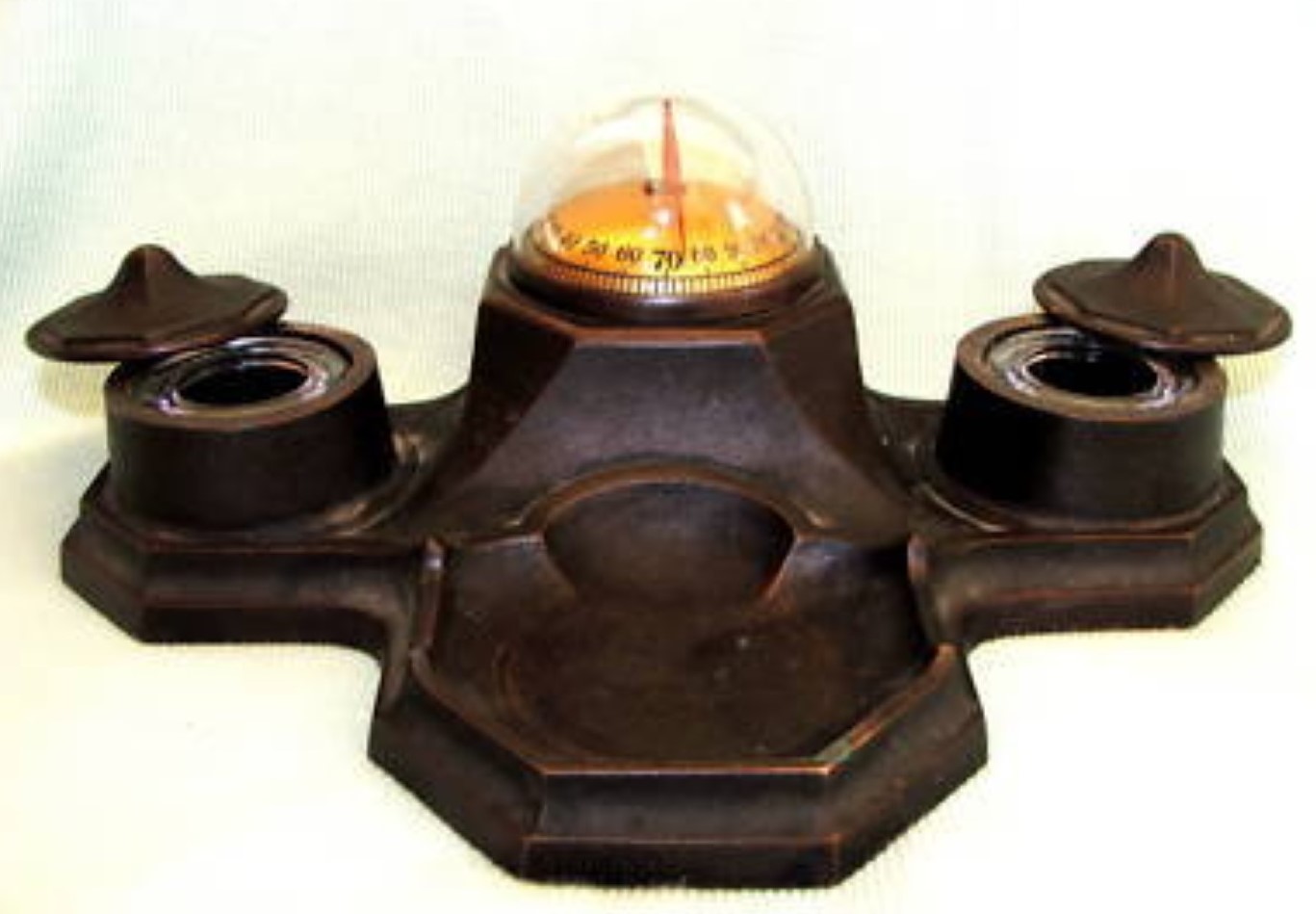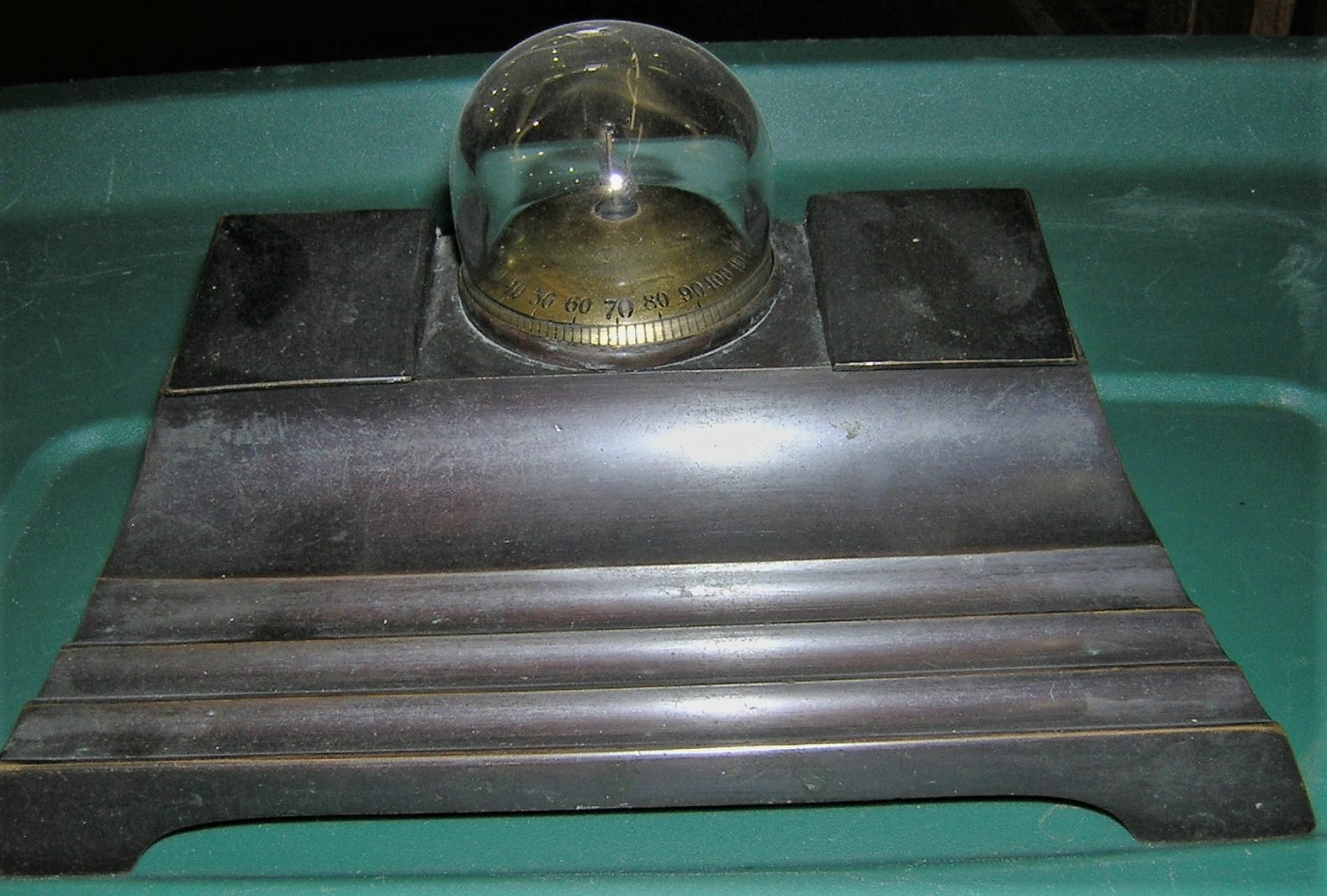 Two examples of inkwells with built-in thermometers. These were made by the Schaeffer & Budenberg Mfg. Co. in Brooklyn NY. Enclosed in a glass dome, a flag traveled around the raised dial and pointed to the temperature. In the days when households did not have air conditioning, and heating levels varied throughout the house, a thermometer inkstand, in addition to its novelty, may have been a useful feature.