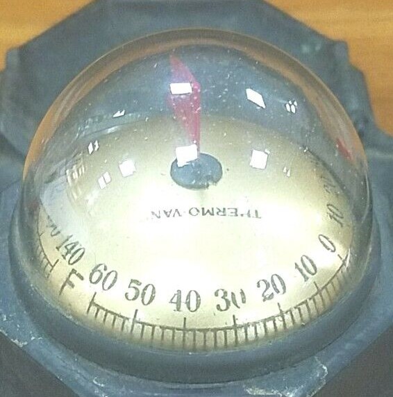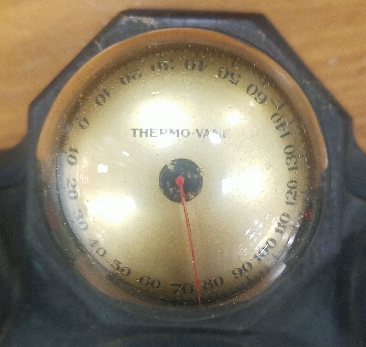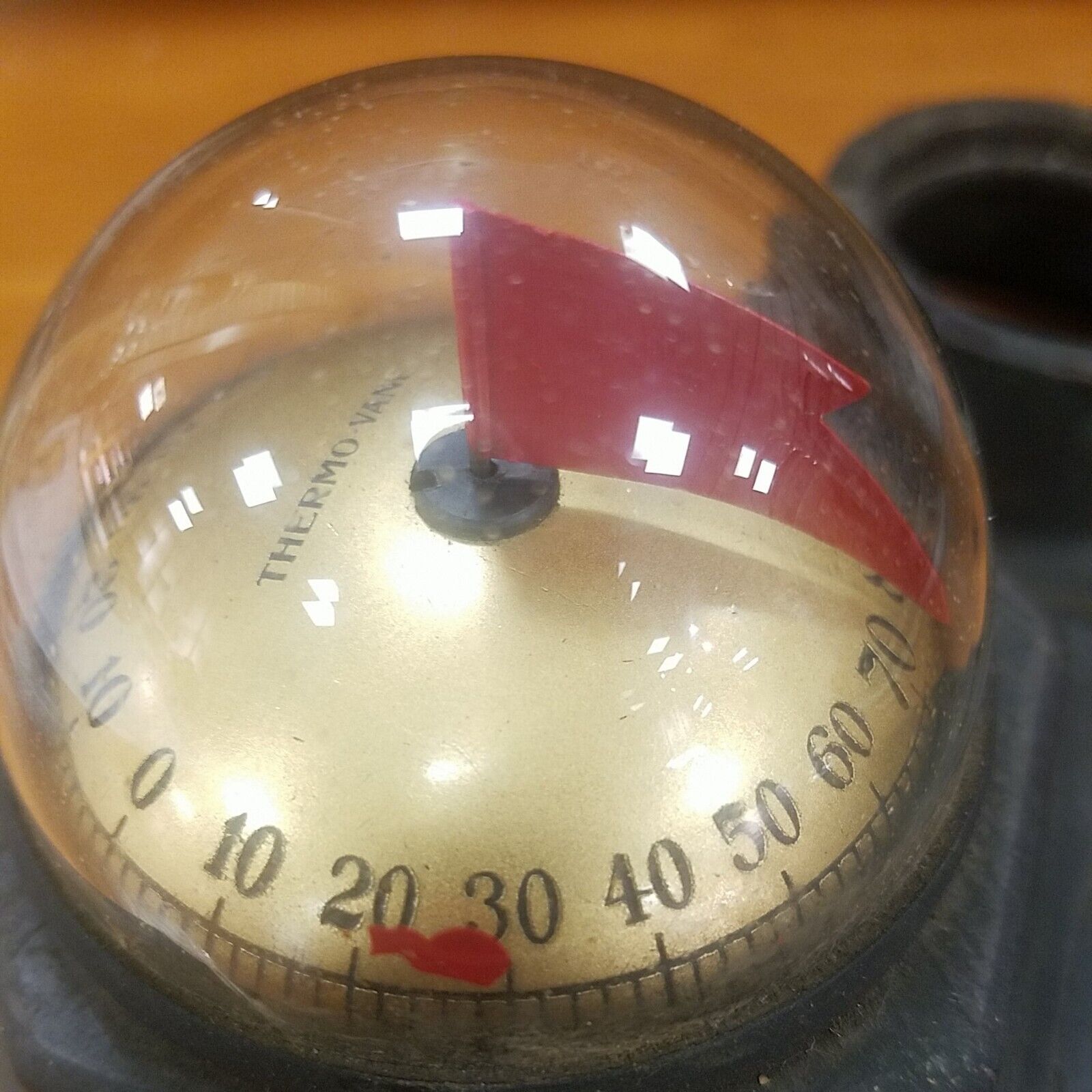Two examples of inkwells with built-in thermometers. These were made by the Schaeffer & Budenberg Mfg. Co. in Brooklyn NY. Enclosed in a glass dome, a flag traveled around the raised dial and pointed to the temperature. In the days when households did not have air conditioning, and heating levels varied throughout the house, a thermometer inkstand, in addition to its novelty, may have been a useful feature.