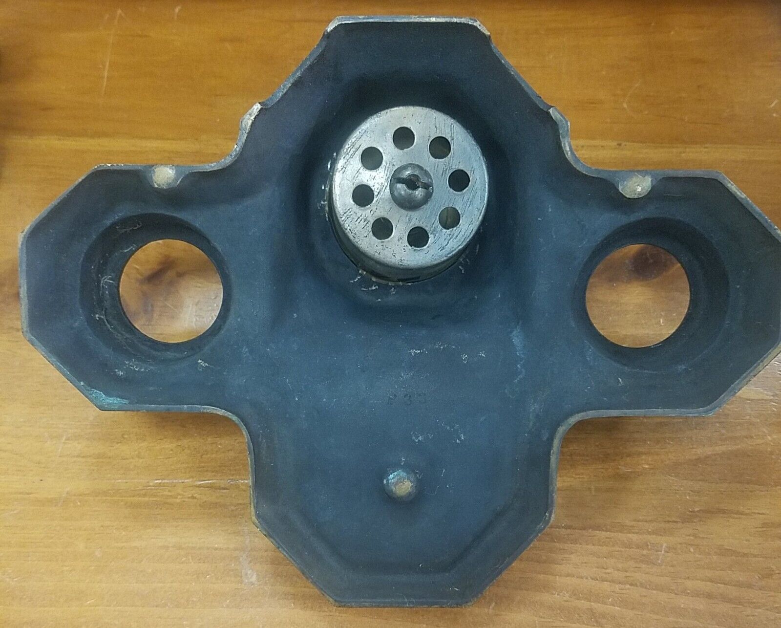 For the first inkstand pictured, the inkwells have pronged lids allowing one to swivel them open while remaining attached to the base. The base is stamped P33.
