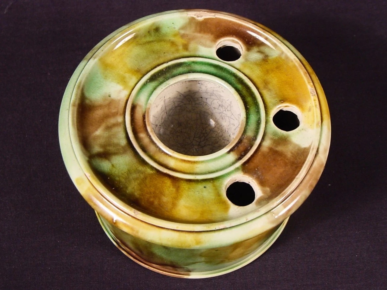 This rare, cylindrical inkwell is a masterclass in the “tortoiseshell” glazing technique. The body features a central recessed ink reservoir surrounded by a wide, flat rim. This rim is pierced with three circular apertures designed to hold quill pens upright.