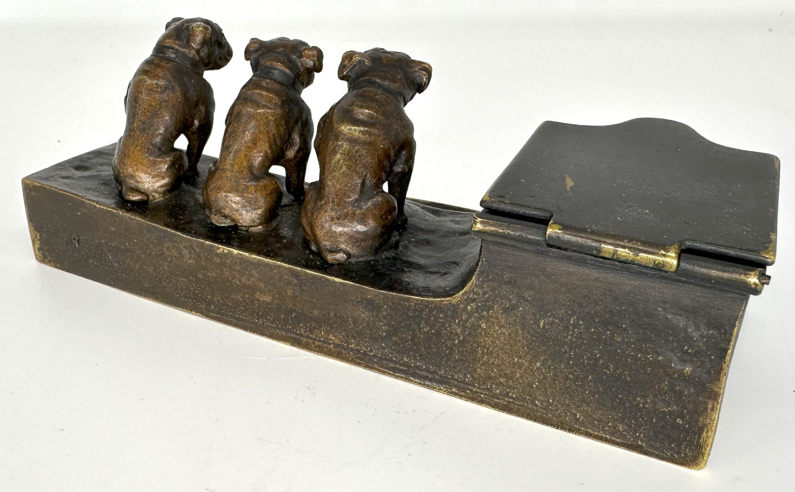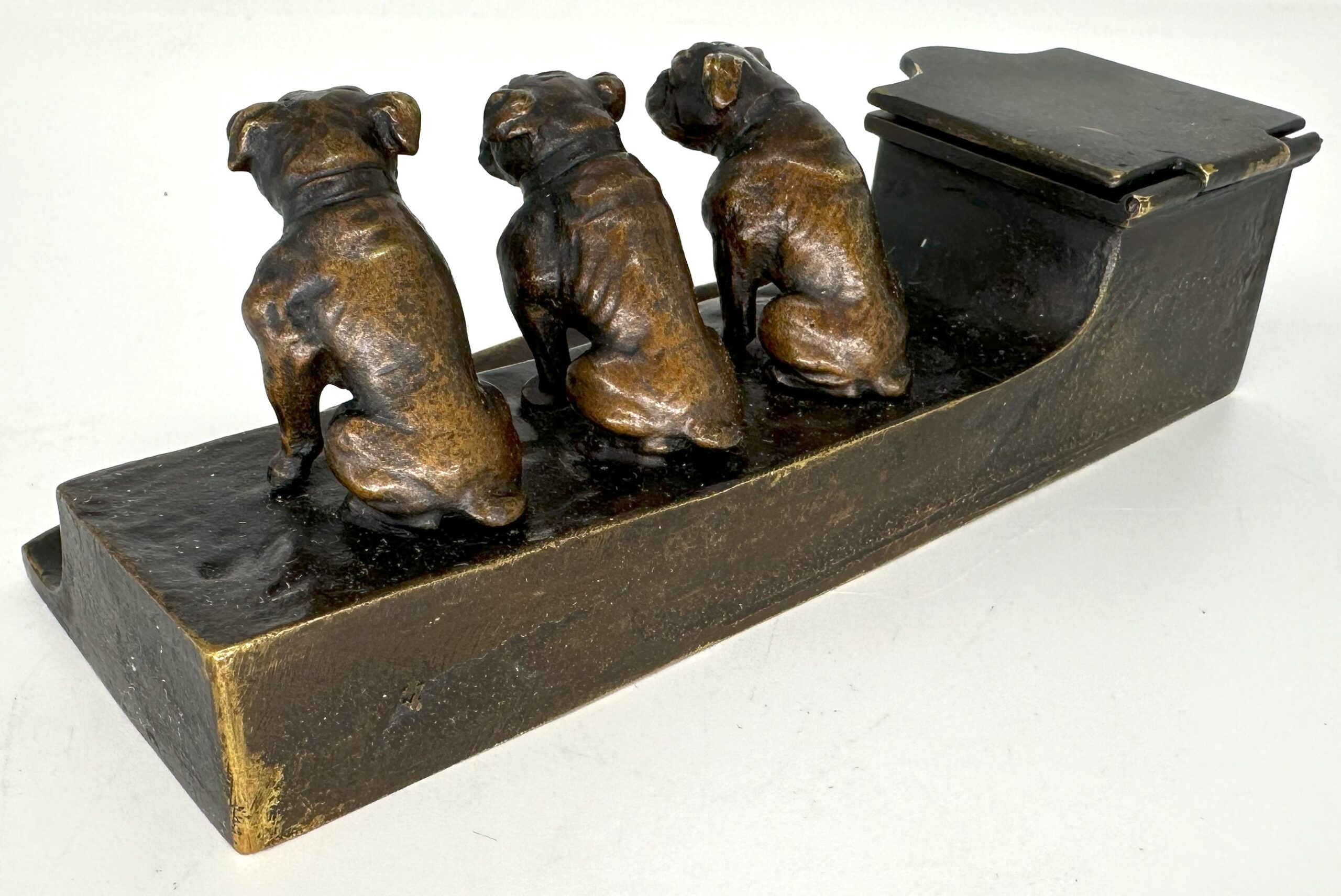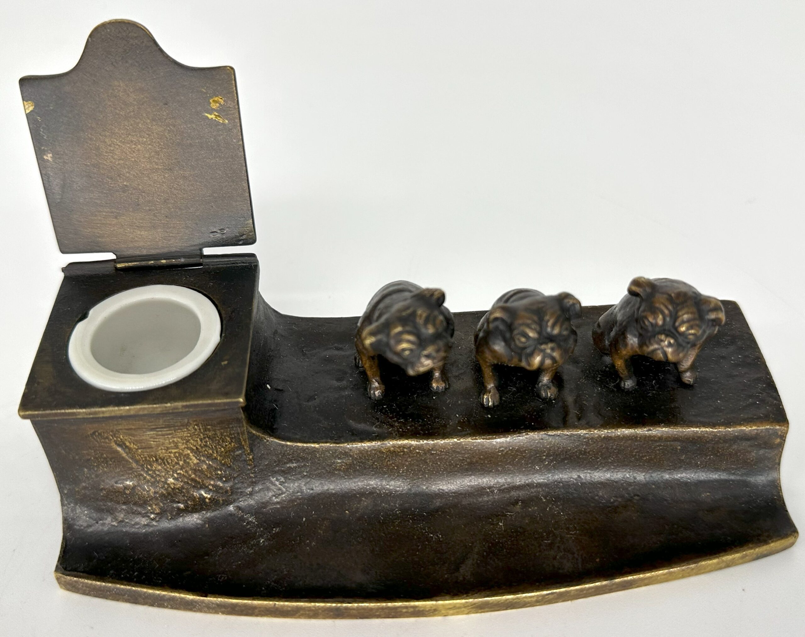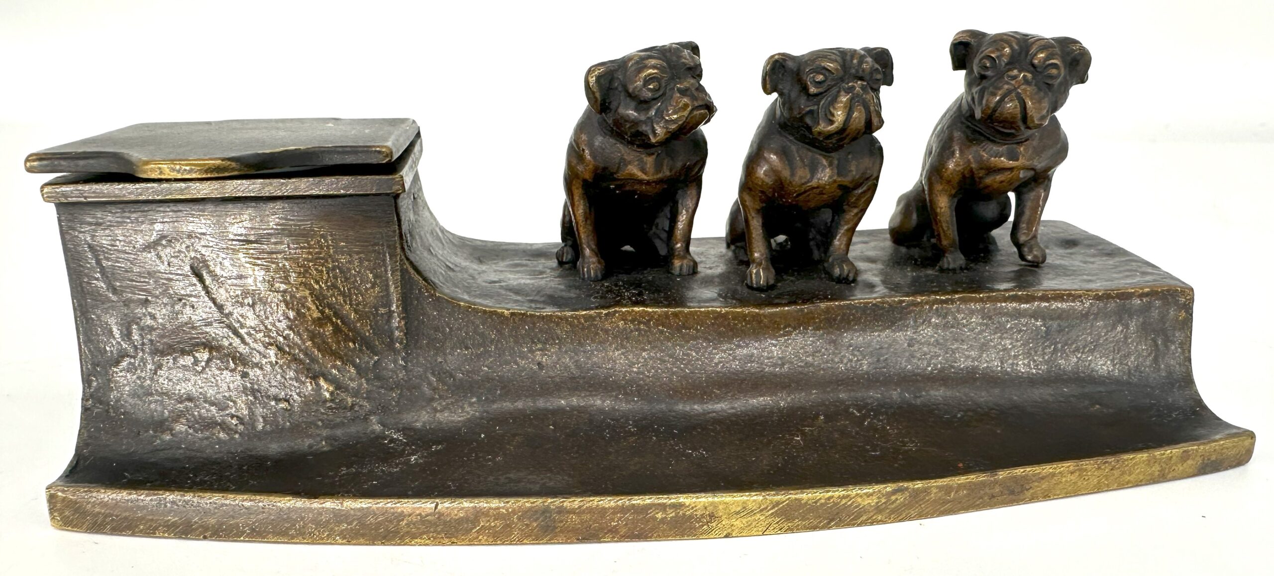 This bronze inkstand with pen channel features three sitting bulldogs, nicely cast capturing their muscular bodies and wrinkled faces.