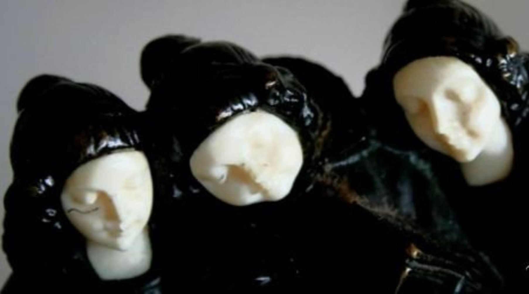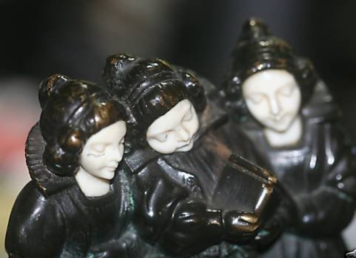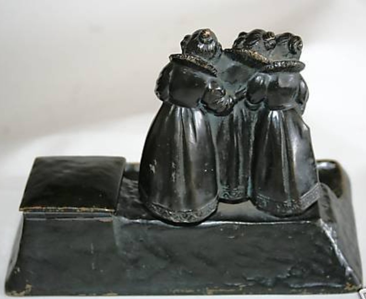 This inkstand features three girls with the one in the center holding a package. Made of bronze, the faces on each girl are carved ivory. The base is signed P. Tereszczuk and has the AR foundry mark.