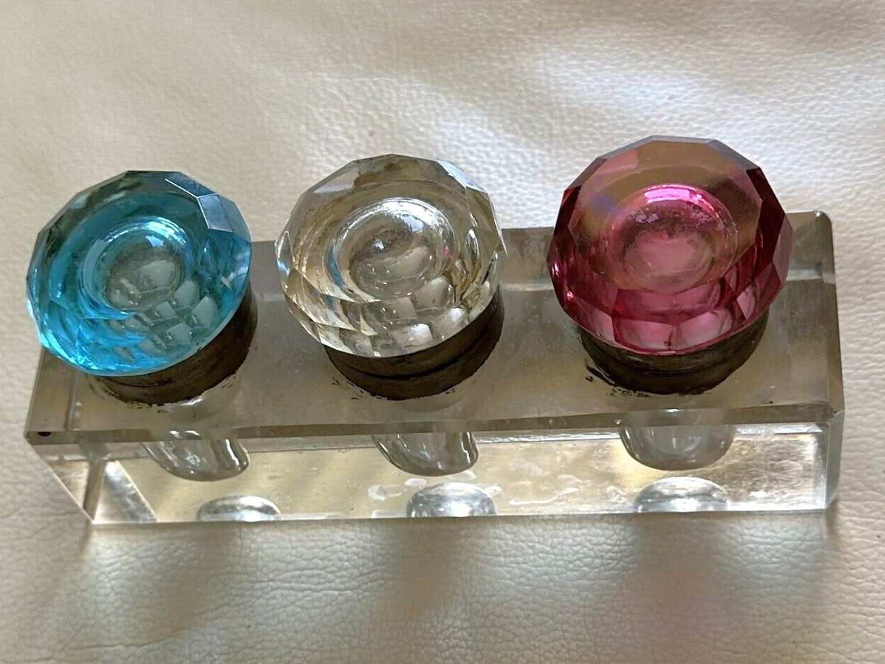 Cut glass inkwell with three ink reservoirs, each with faceted colored lids which indicate the type of ink: clear for black ink, blue for blue ink, and red for red ink.