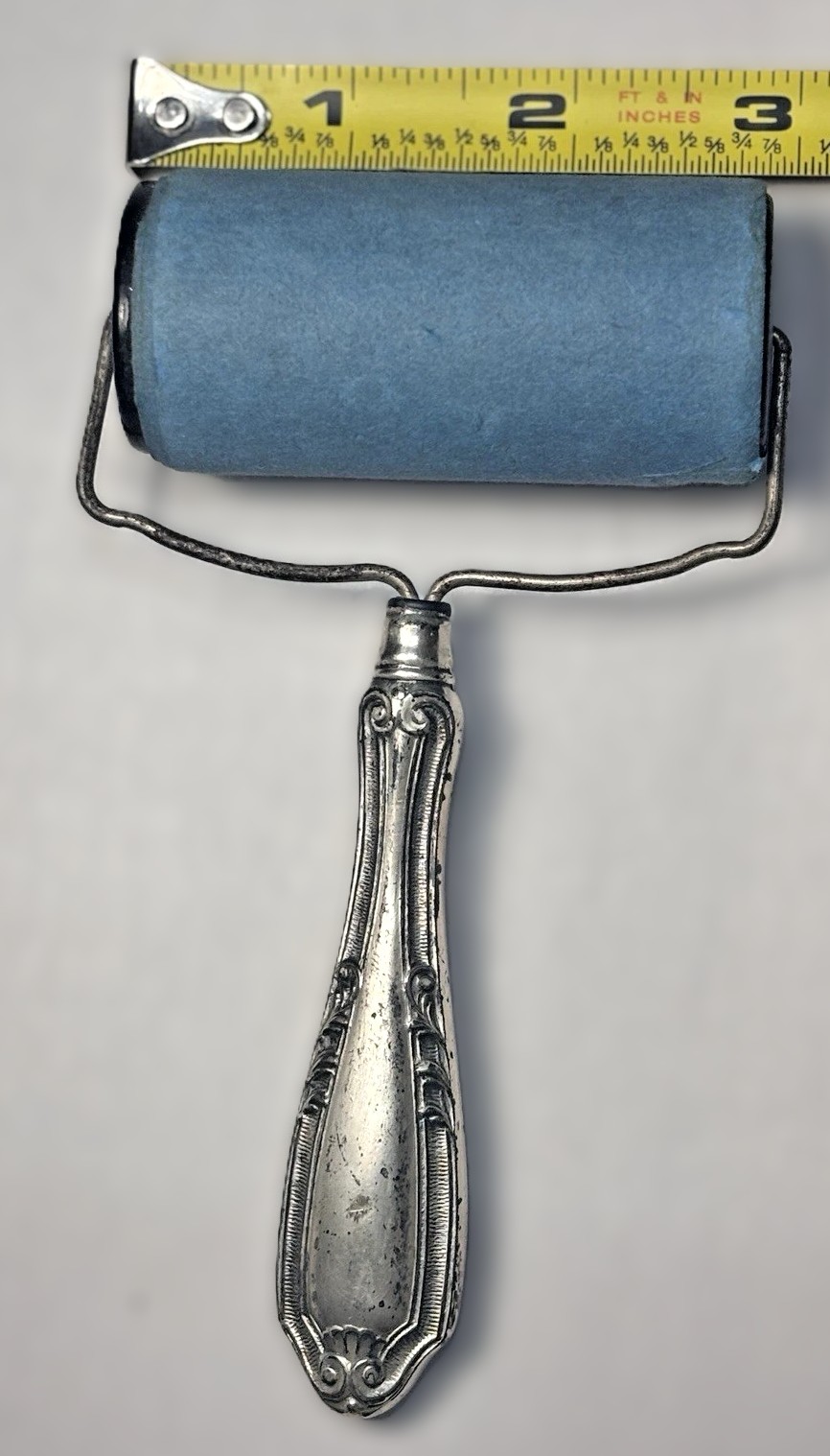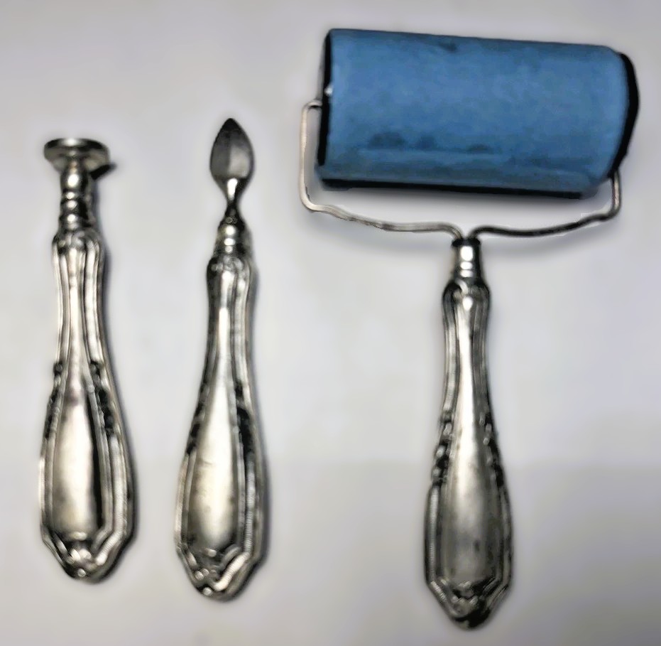 - The Roller Blotter: This is the most substantial piece. It features a nickel-plated or silver-plated frame holding a blue blotting cylinder (approximately 2.5 inches wide). This was the “high-tech” version of the rocking blotter, designed to roll quickly over a signature to dry the ink.