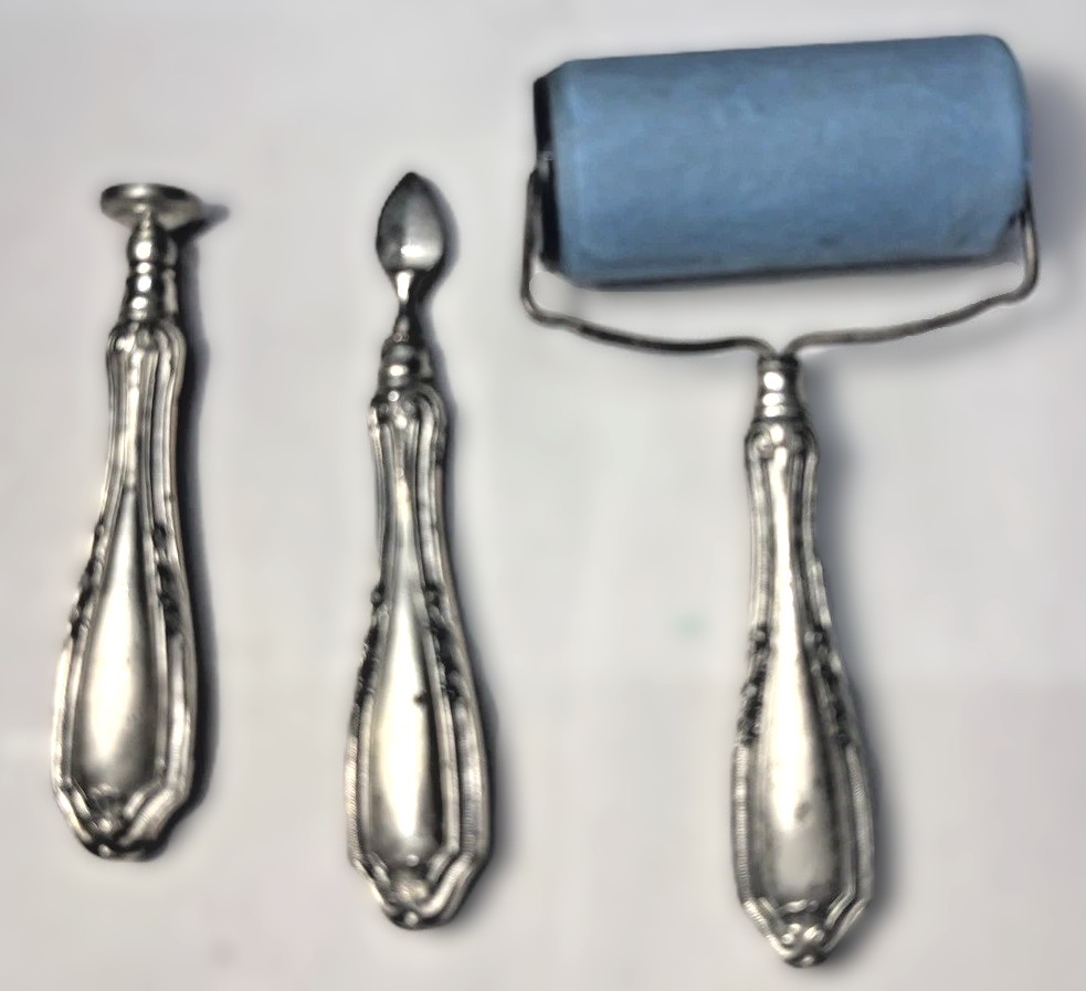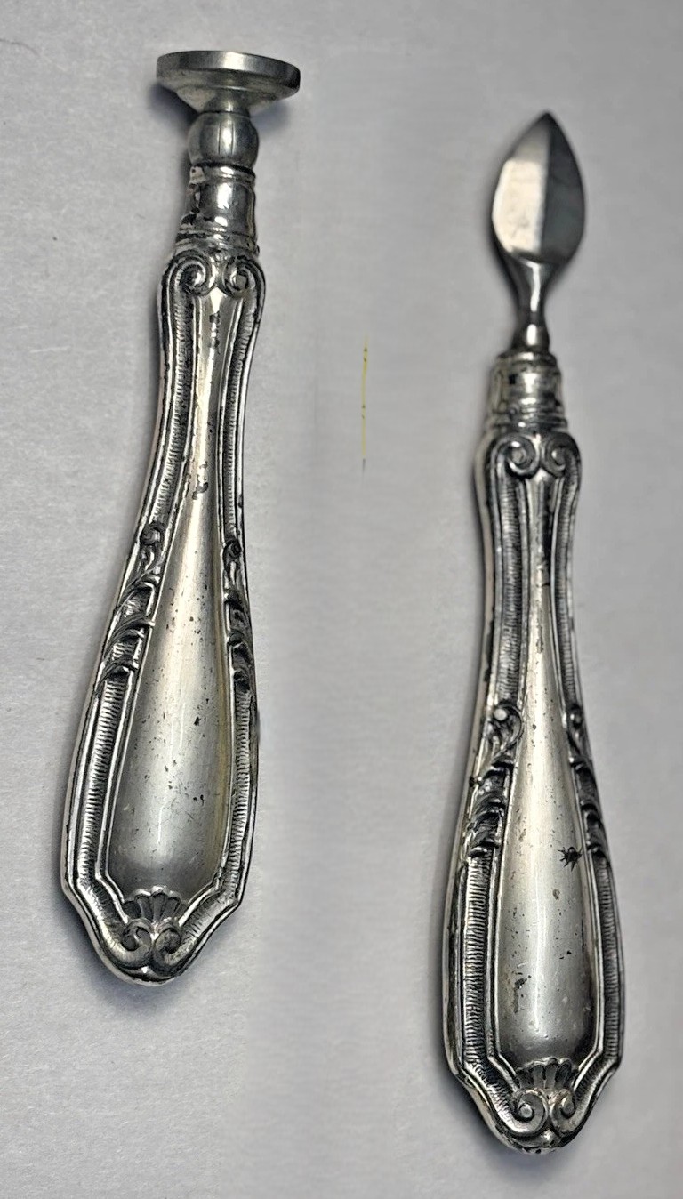 - Origin: Given the lack of hallmarks and the handle style, these are almost certainly silverplated. If they were British sterling, they would have a “Lion Passant” mark; if American sterling, they would be stamped “Sterling.” These were likely produced by a high-quality manufacturer like Meriden Britannia (USA) or an English firm like Walker & Hall. The handles are likely hollow ware (two stamped halves soldered together), which was a common way to make desk tools feel substantial but stay affordable.