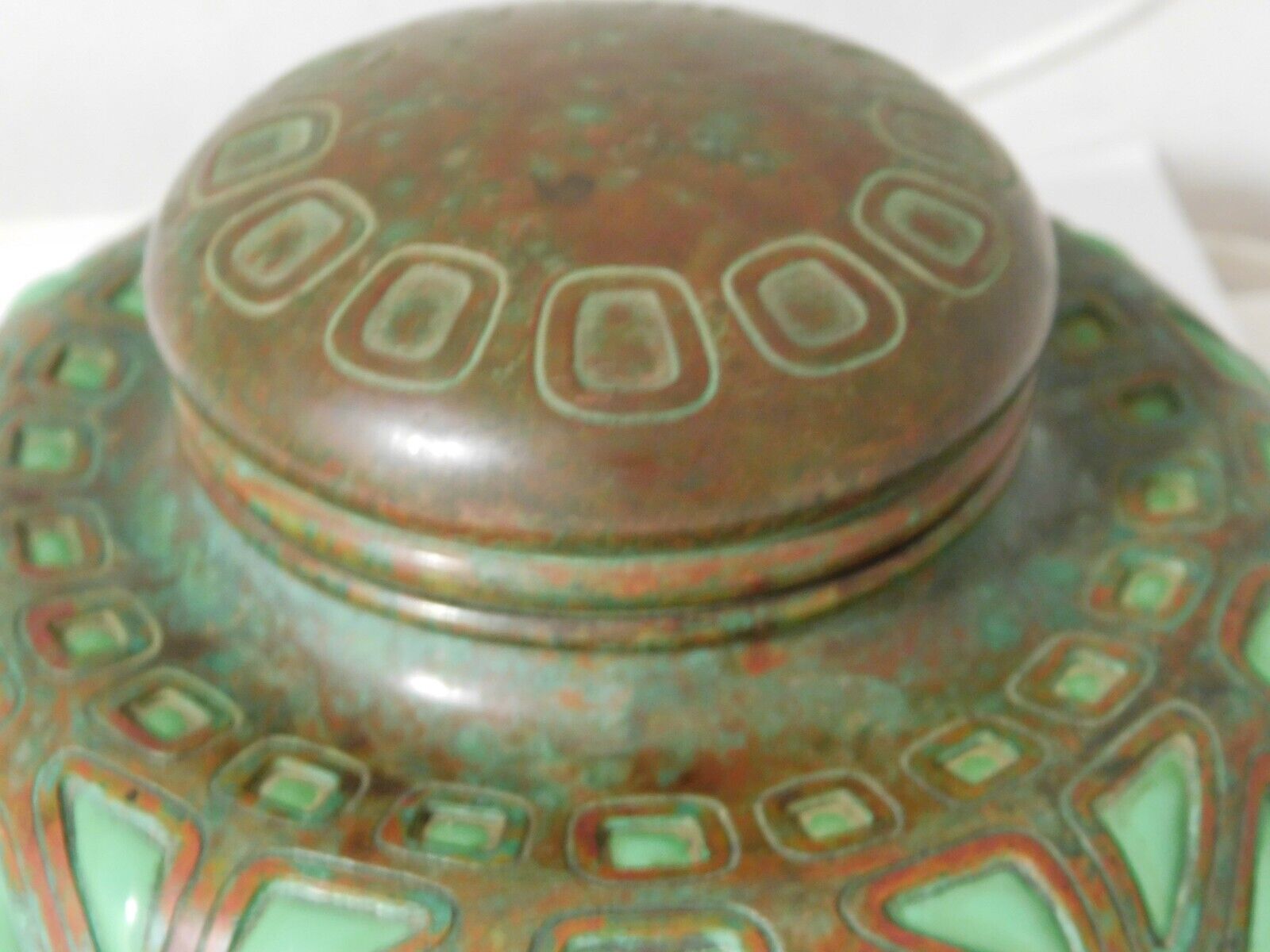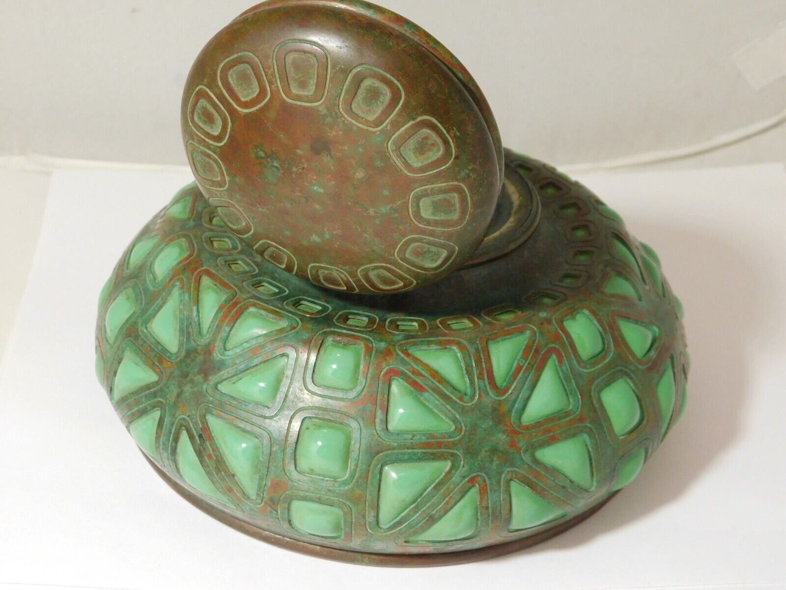 Stamped Tiffany Studios New York #2164, this inkwell has a beautifully aged chocolate bronze finish with green reticulated glass. (Reticulated glass is molten glass that has been forced under high pressure causing it to bulge out of the openings in pierced metal).