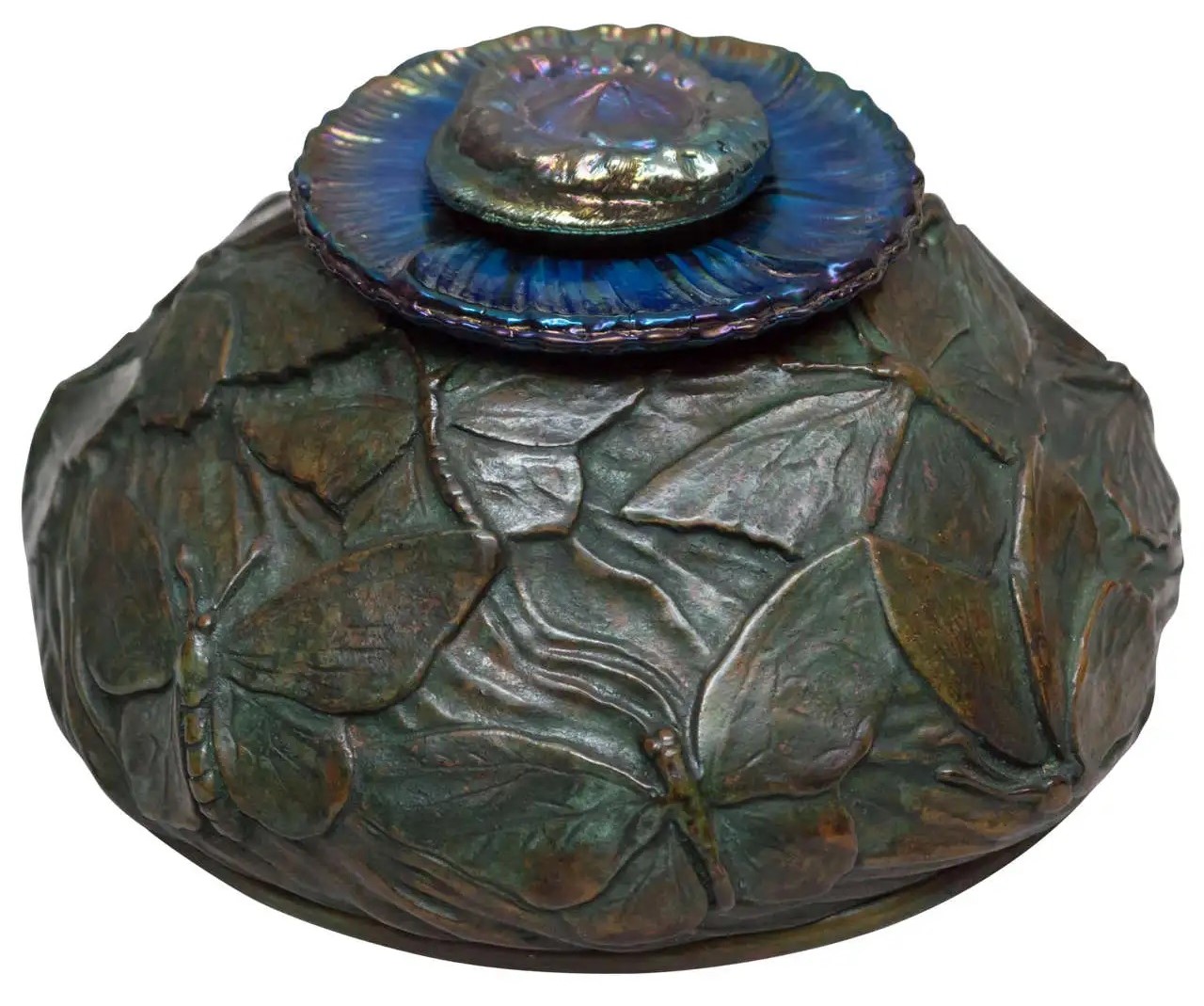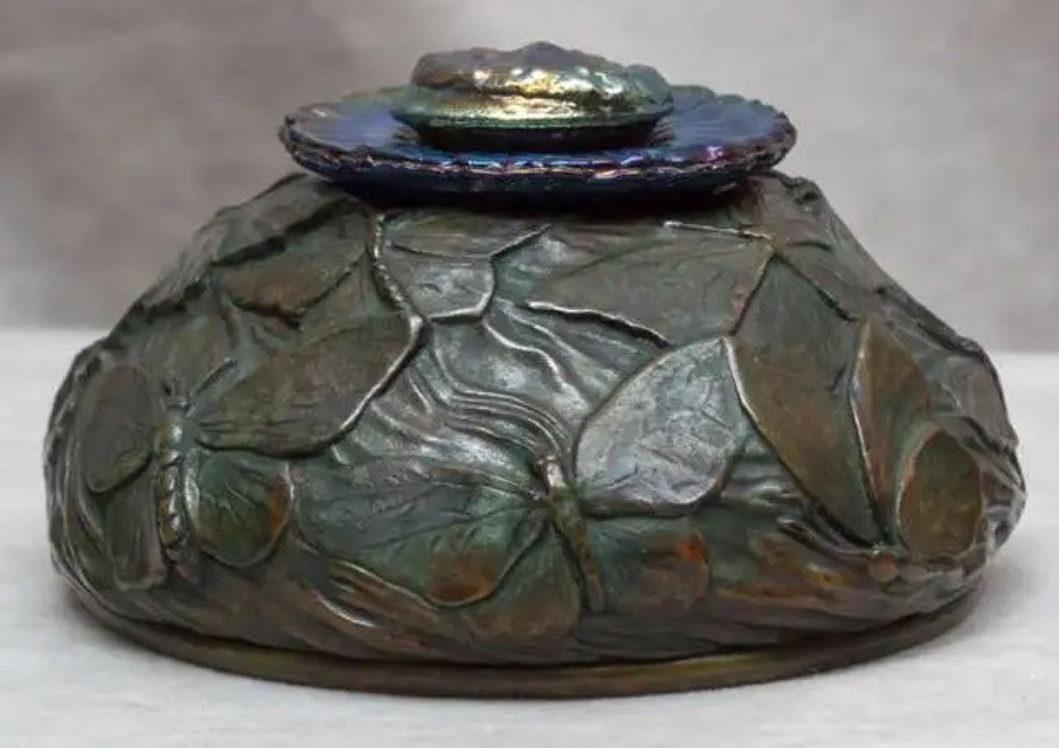 A rare Tiffany inkwell which depicts a group of butterflies in various stages of flight. The glass liner and cover (in the form of a poppy) are made of favrile glass.