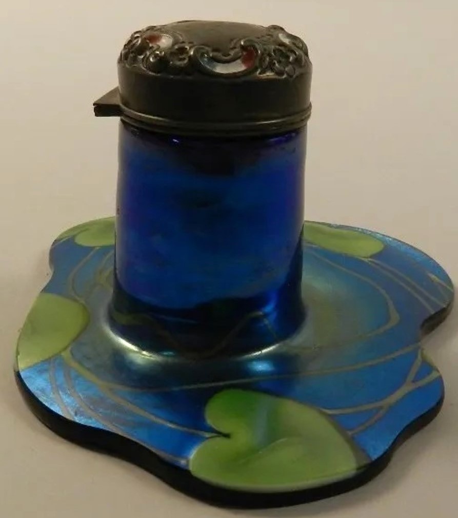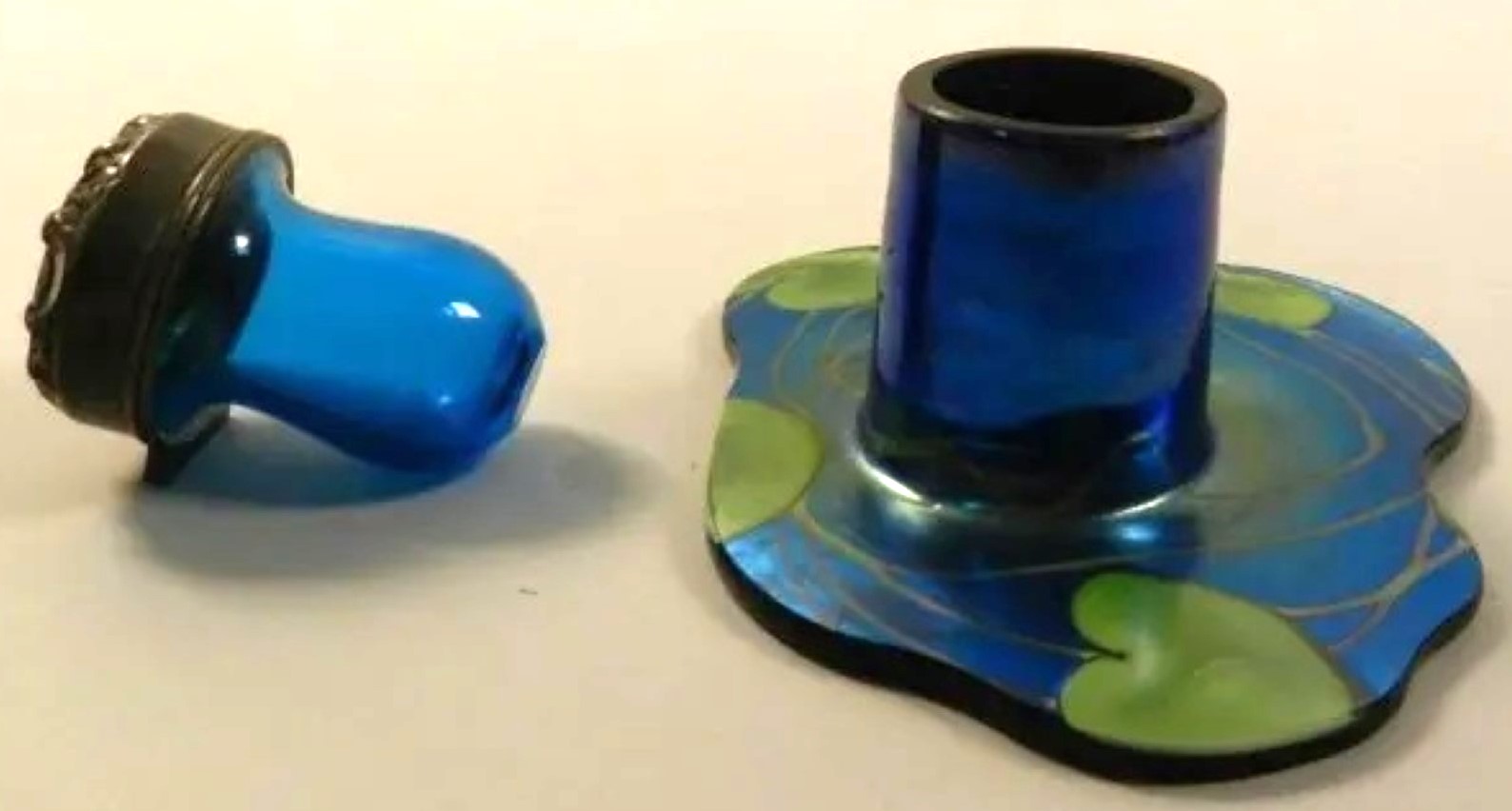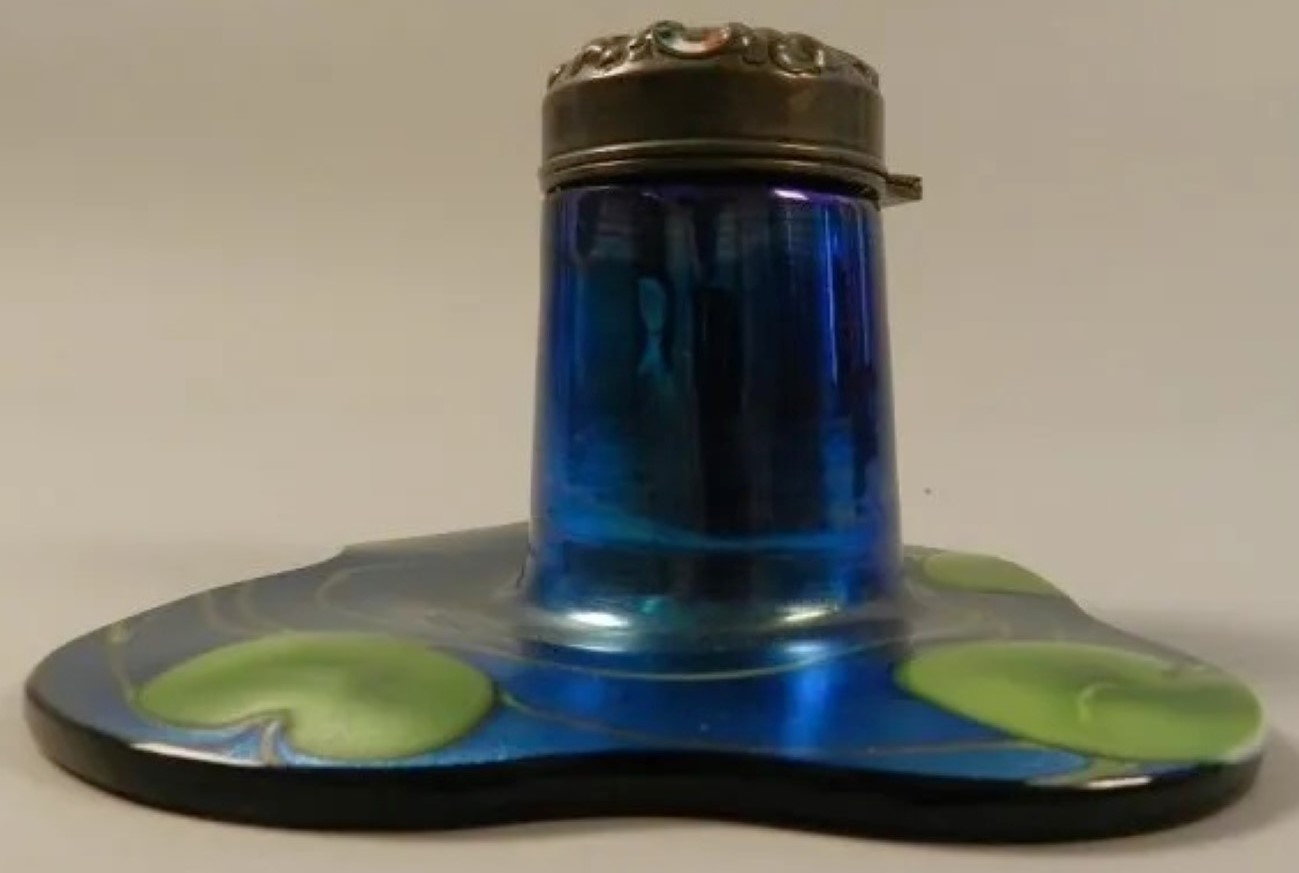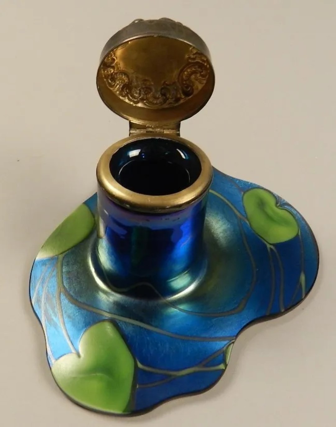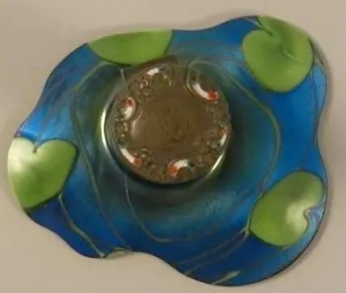 Blue and green favrile glass forming an inkwell floating in a pond with lily pads.