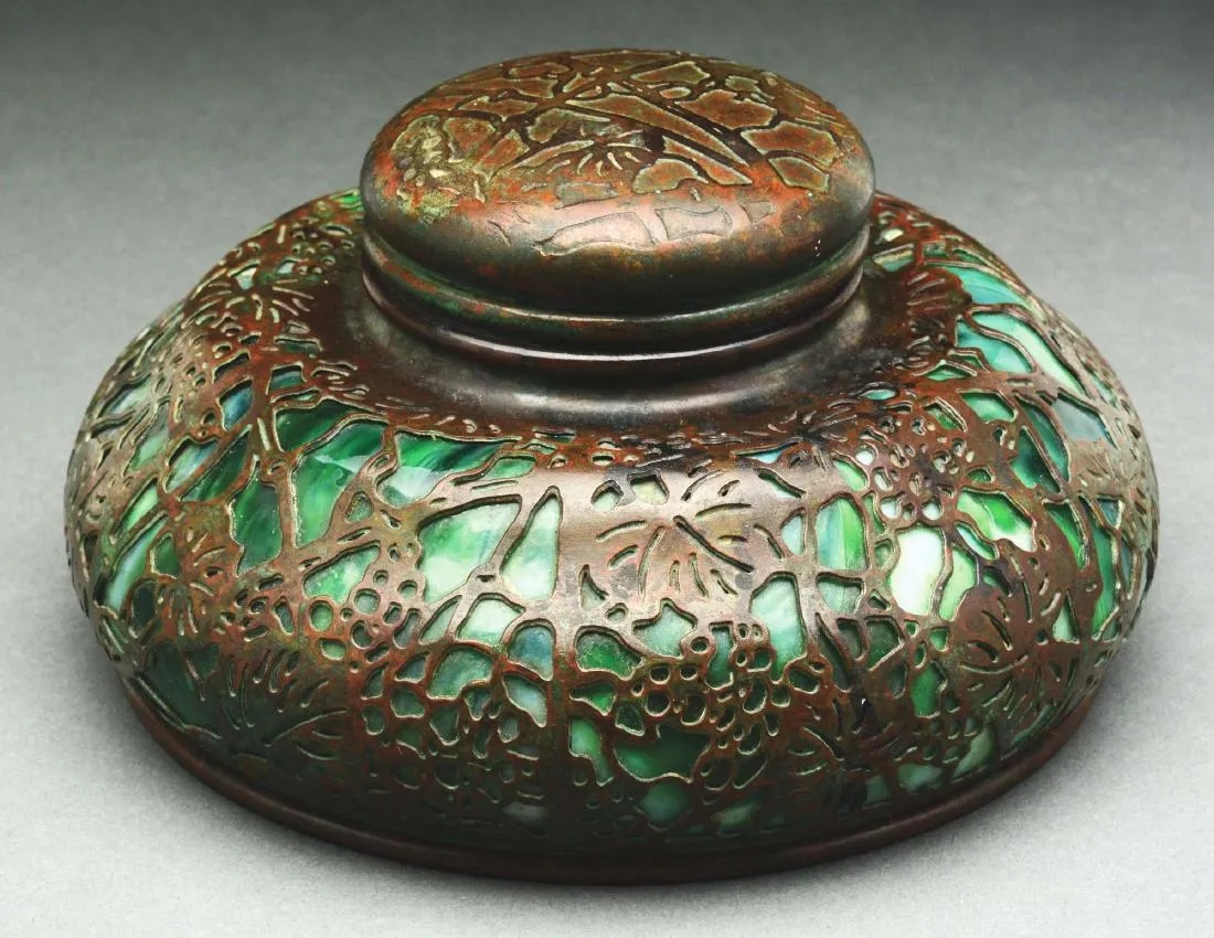 Most of the Grapevine objects utilized bronze with etching that completely penetrated the surface to allow the gem-like glass to show through. Certain pieces, such as the inkwell lid, were only partially etched to create a sense of texture without the filigree appearance seen throughout the etched metal and glass collection.