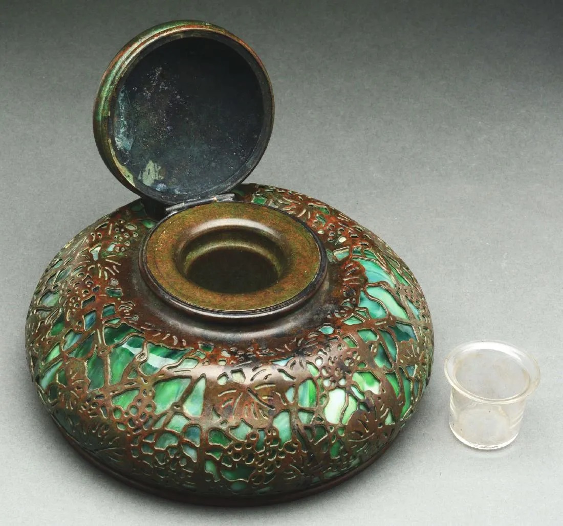 Pictured here are two varieties of inkwells, round in form, with Tiffany’s grapevine pattern. Grapevine inkwells with a square form are under a separate entry.