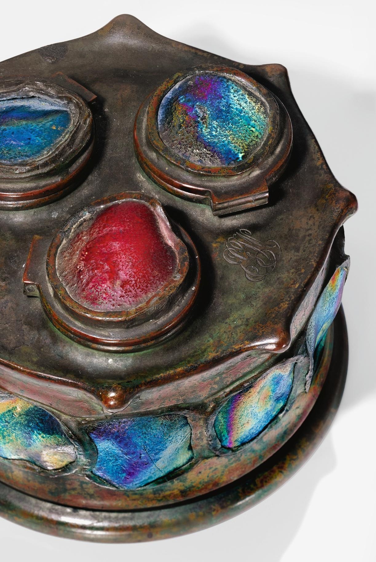 Patinated bronze inkstand with a marbled brown patina, inset with turtleback favrile glass tiles. There are three inkwells each with a bronze liner. The inkstand rotates the inkwells as the user needs access. The inkstand is engraved with an ornate “EGW” monogram.