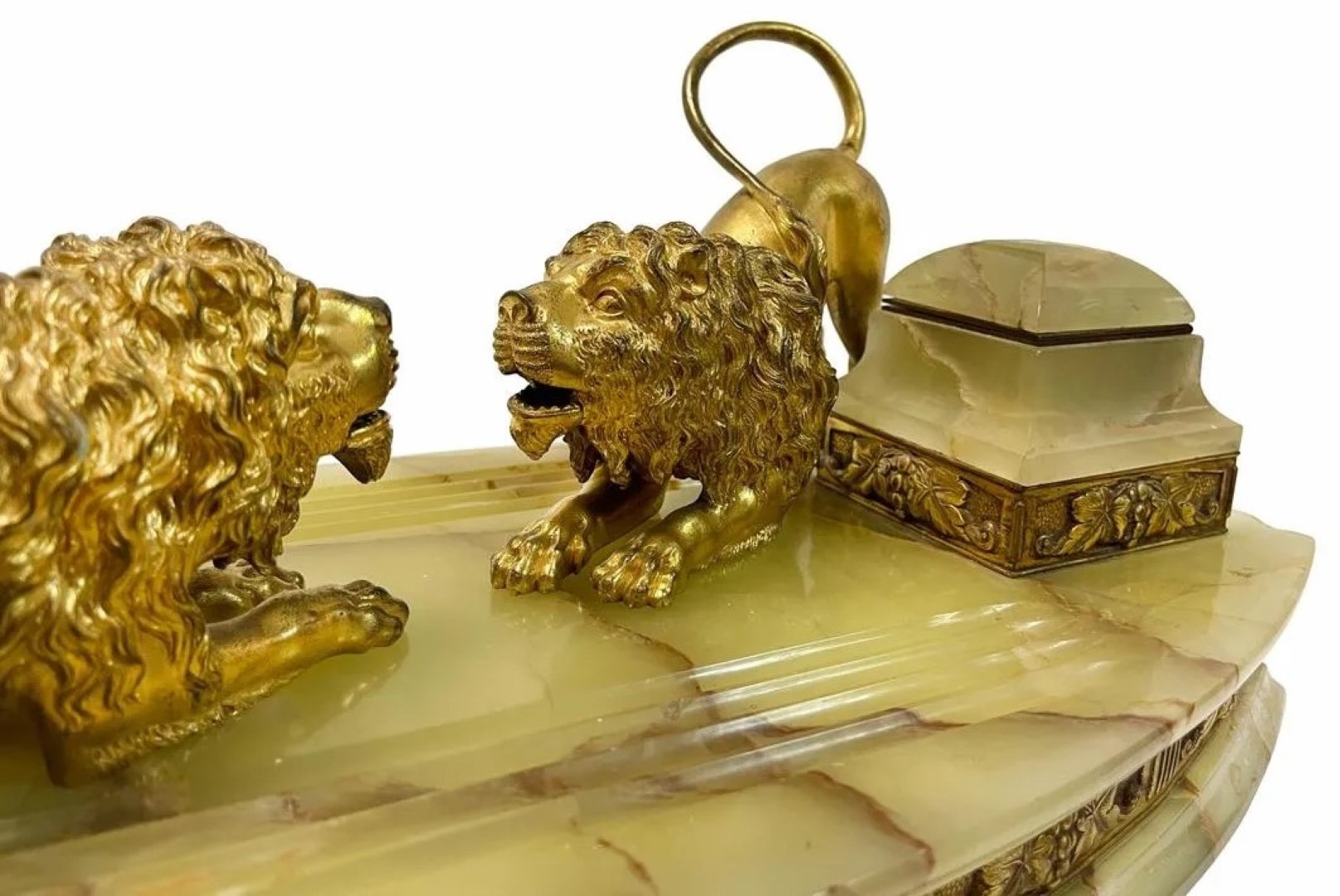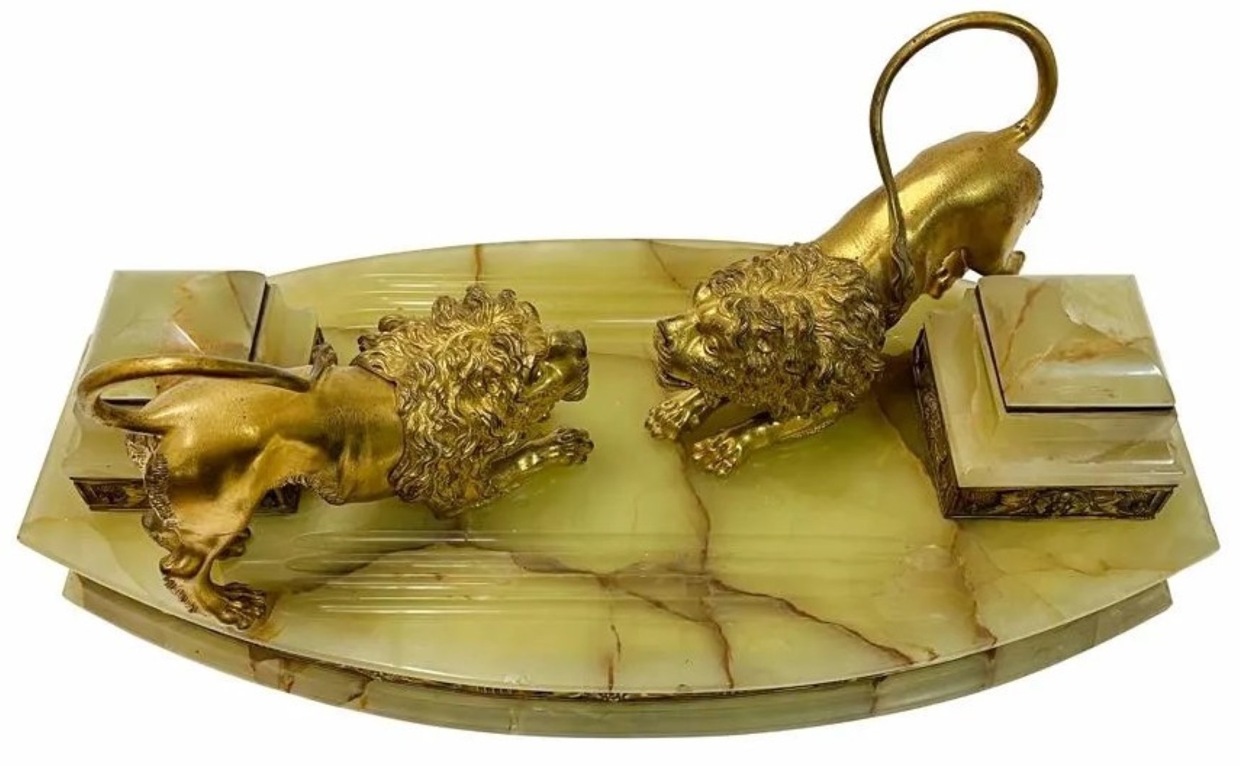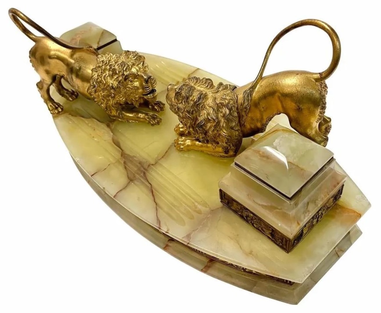 Two gilt bronze lions on an onyx base flanked by two inkwells.