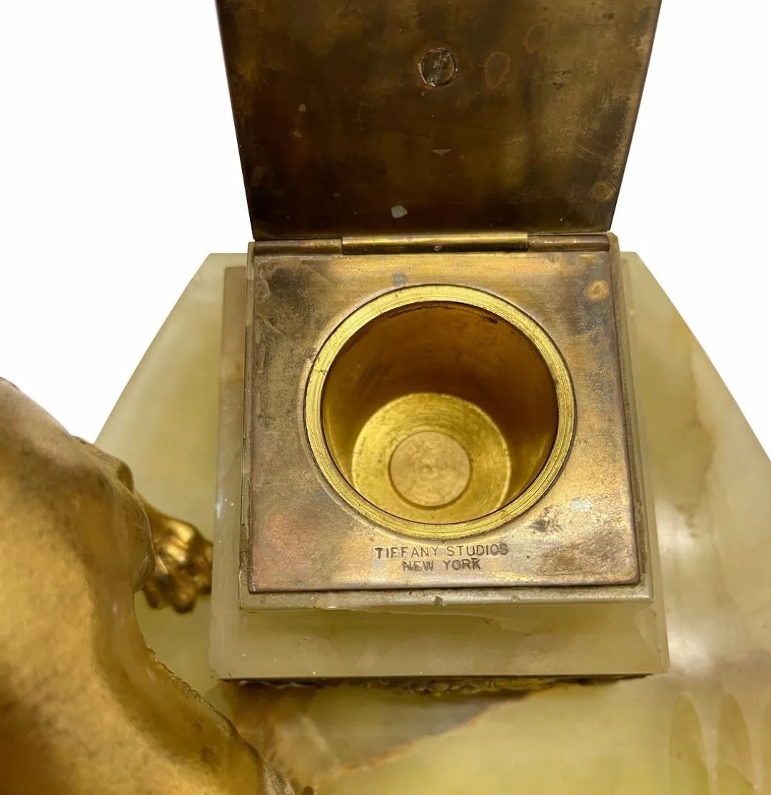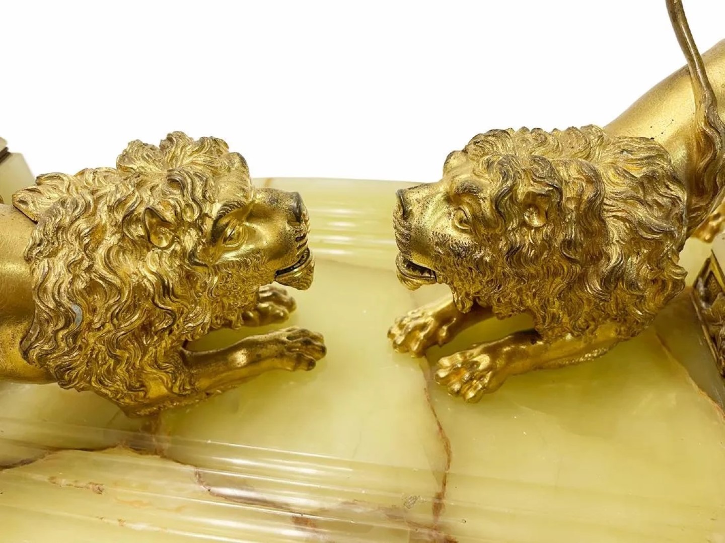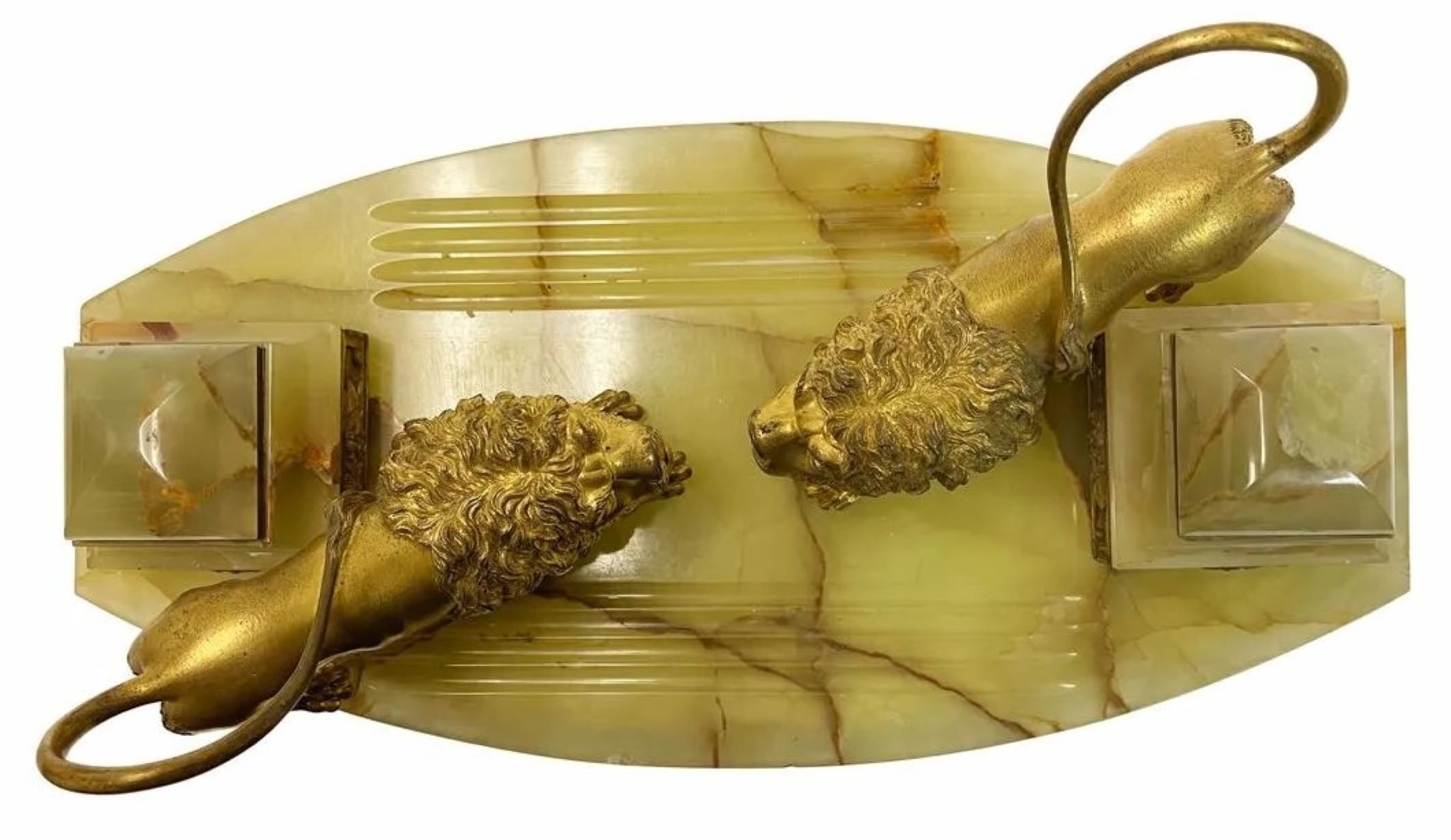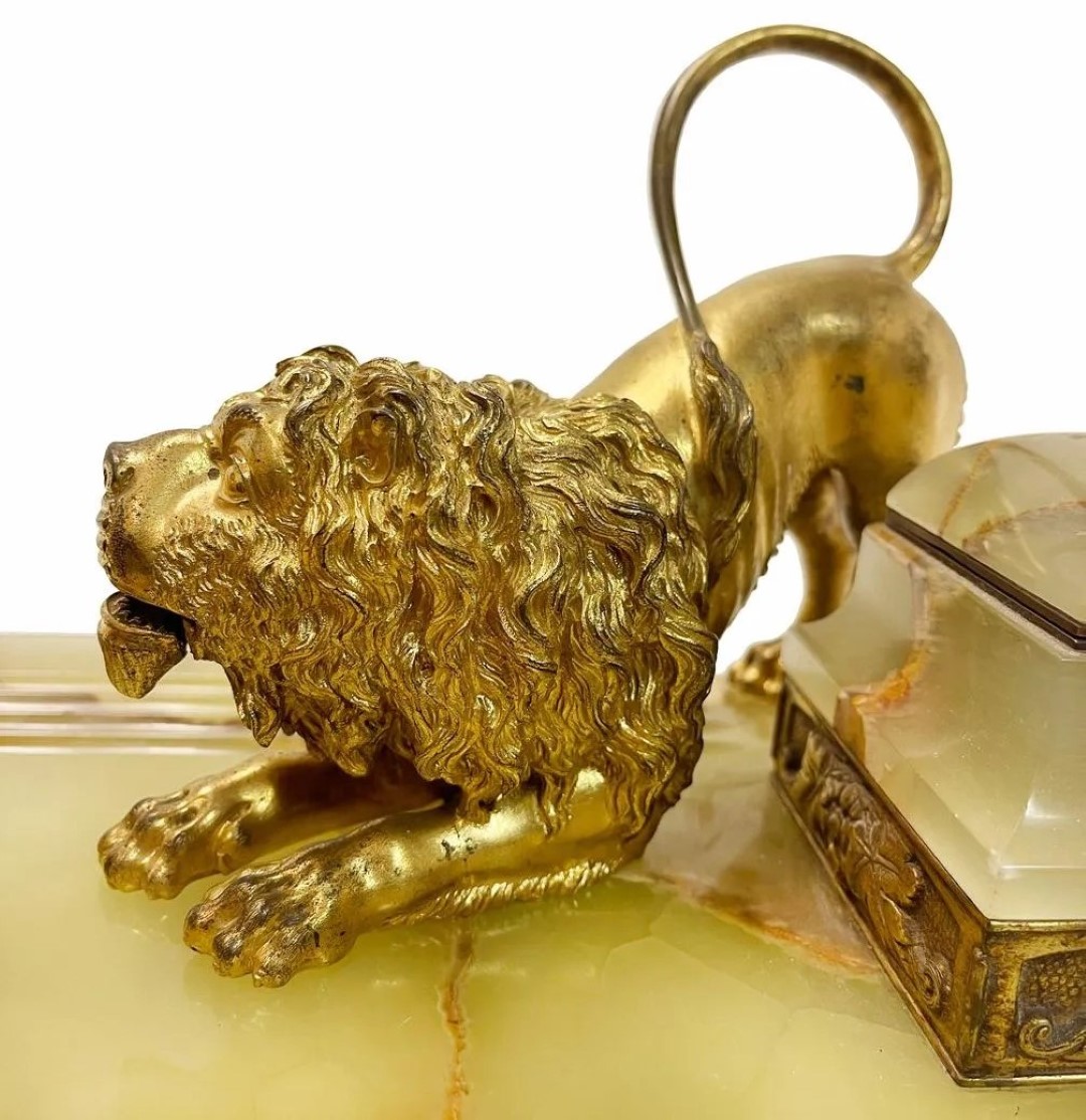 Two gilt bronze lions on an onyx base flanked by two inkwells.