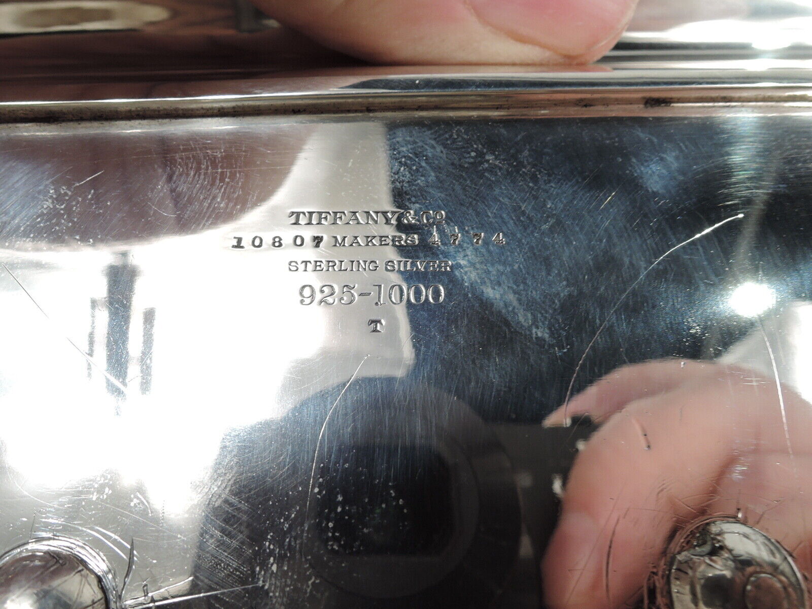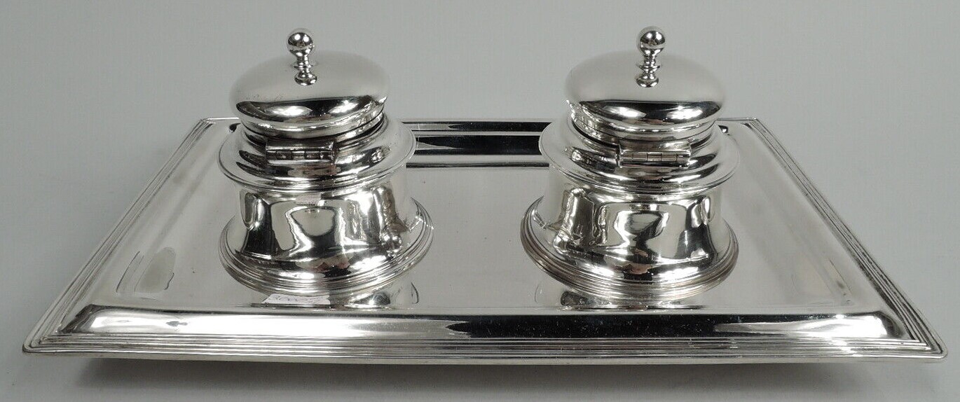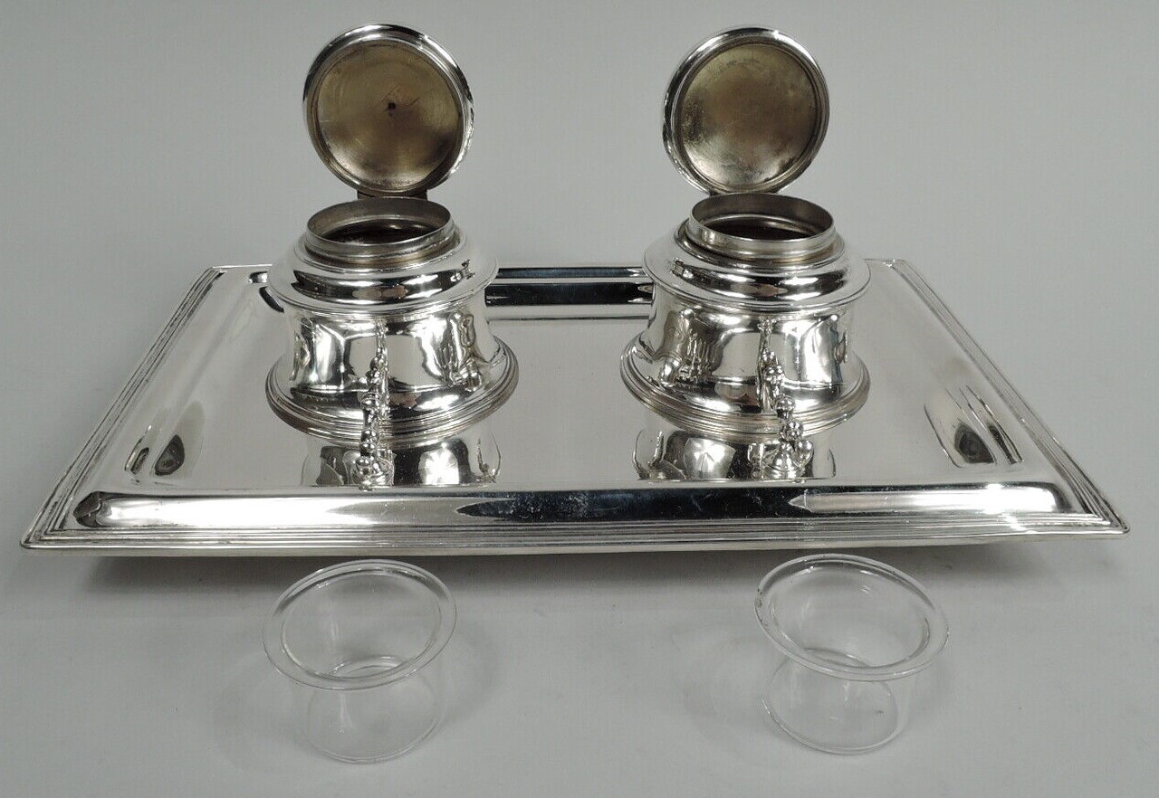 Edwardian Modern sterling silver inkstand. Rectangular with well and reeded rim; 4 leaf-mounted paw supports. Two mounted pots, each with hinged and bellied cover with ball finial, and detachable clear glass liner. Pen rest comprising 2 c-scroll cradles on domed feet. Fully marked including maker’s stamp, pattern no. 10807, and director’s letter T (1892-1902).