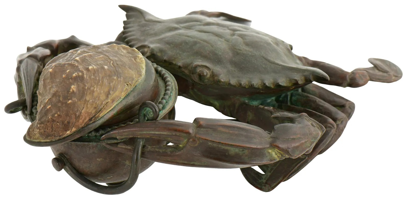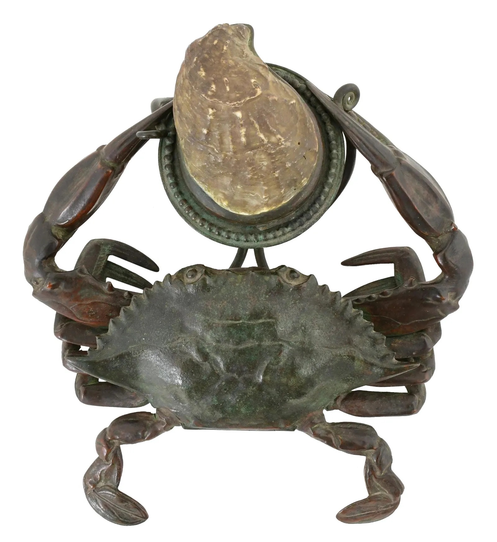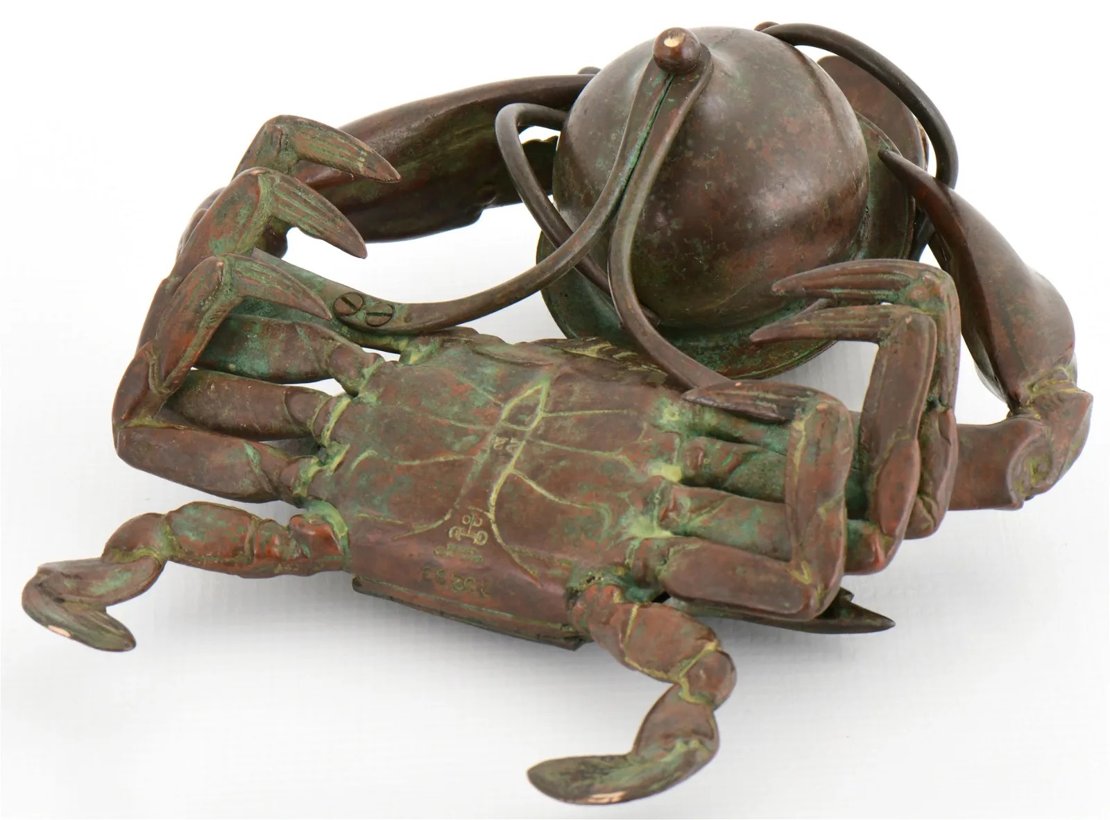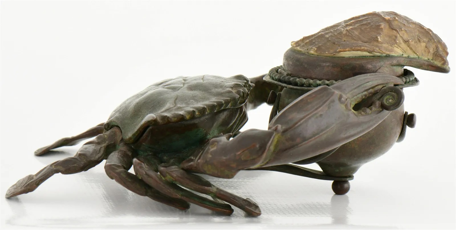 Many of Tiffany’s designs were based on nature as shown with this patinated bronze inkwell in the form of a crab. The creature holds the inkwell in his claws. There is a storage compartment beneath the crab’s shell.