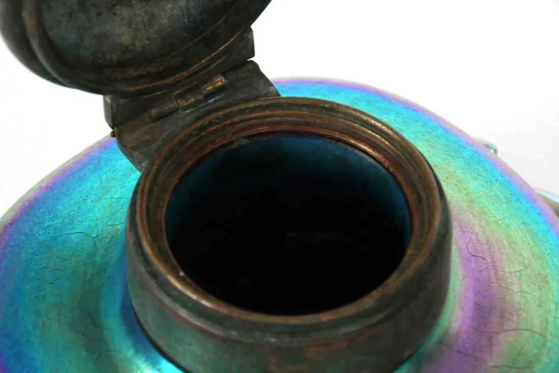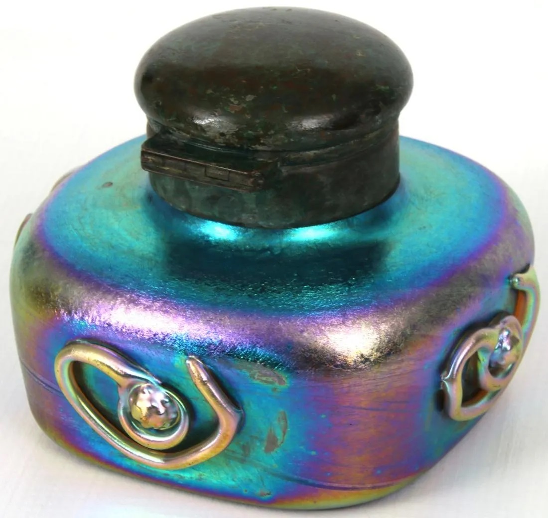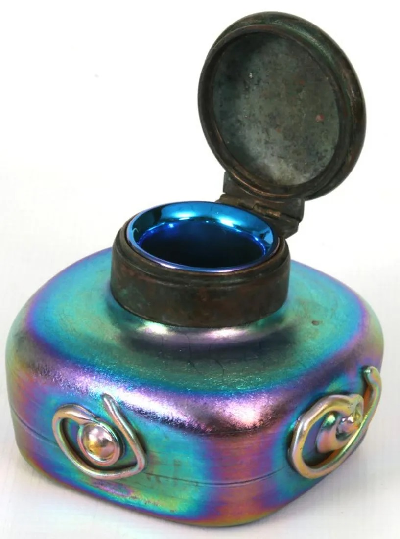 This Tiffany inkwell has a favrile glass body with multi-color iridescence and applied designs on each side in gold iridescence; signed on the underside, “L.C.T. 793B.” The inkwell is complete with a bronze collar and hinged lid, having nice green-brown patina; the blue glass insert has the corresponding number to the inkwell and is signed on the underside, “L.C.T. 793B.”