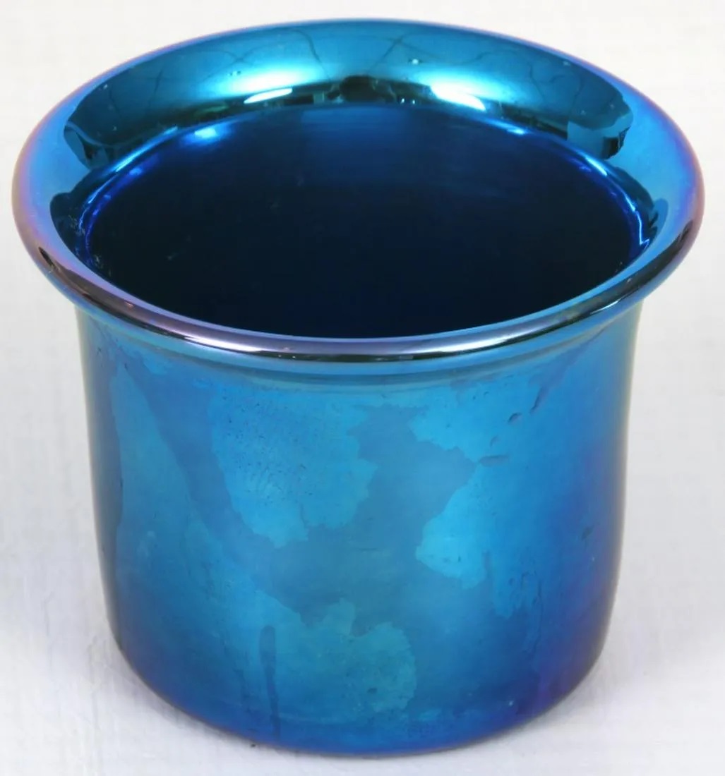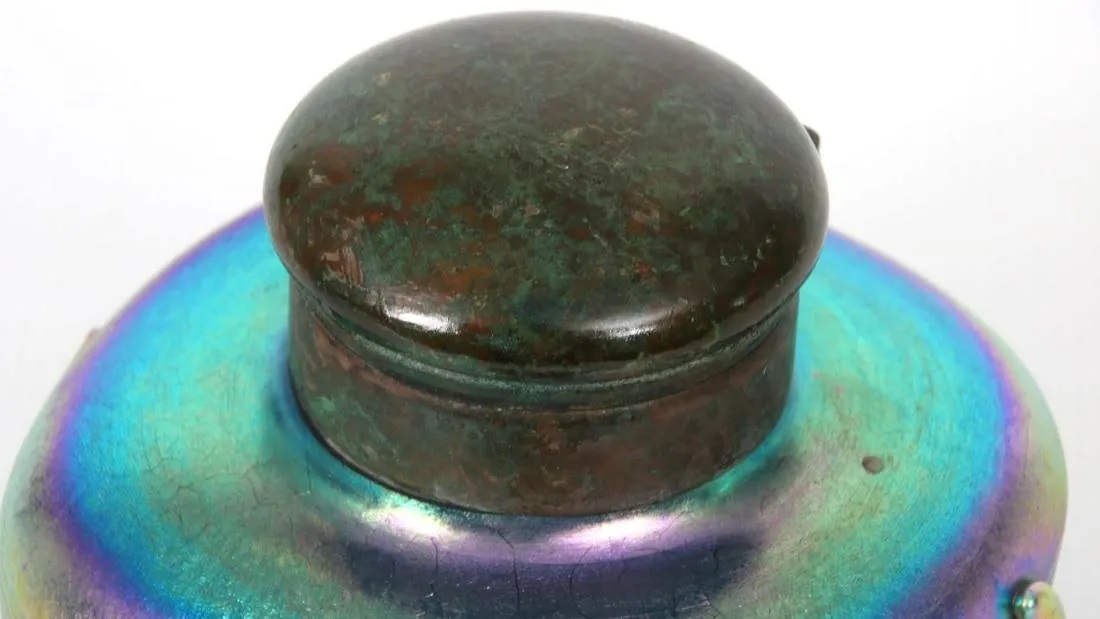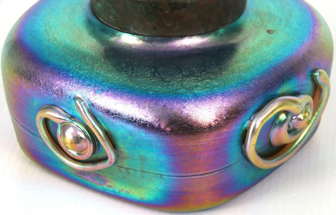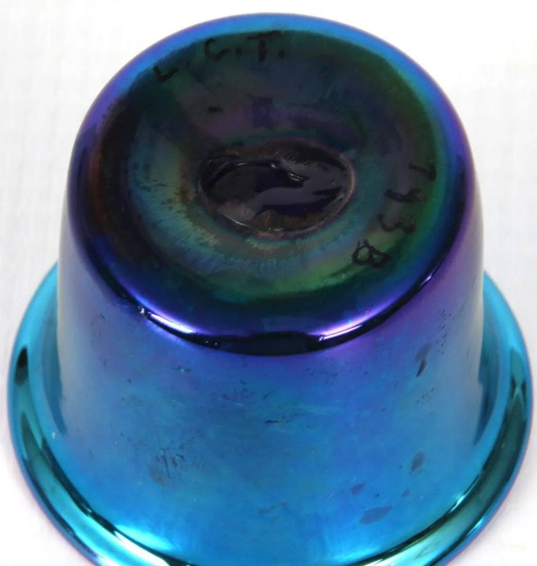 This Tiffany inkwell has a favrile glass body with multi-color iridescence and applied designs on each side in gold iridescence; signed on the underside, “L.C.T. 793B.” The inkwell is complete with a bronze collar and hinged lid, having nice green-brown patina; the blue glass insert has the corresponding number to the inkwell and is signed on the underside, “L.C.T. 793B.”
