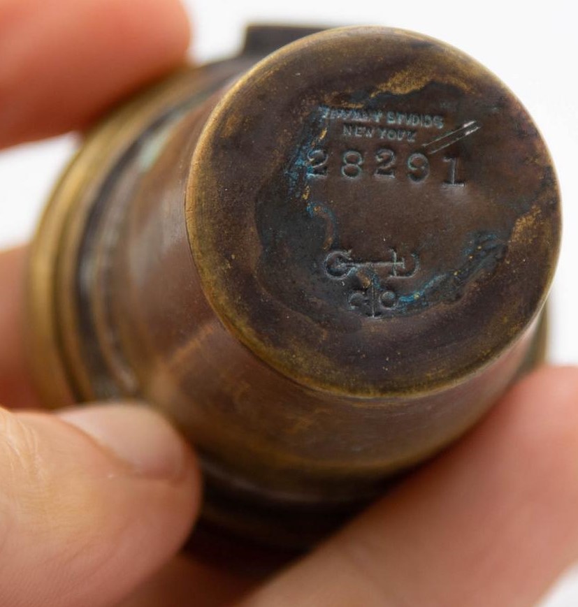 Patinated bronze and polychromatic iridescent glass with a clear glass liner. Impressed “Tiffany Studios New York 28291” with Tiffany mark.