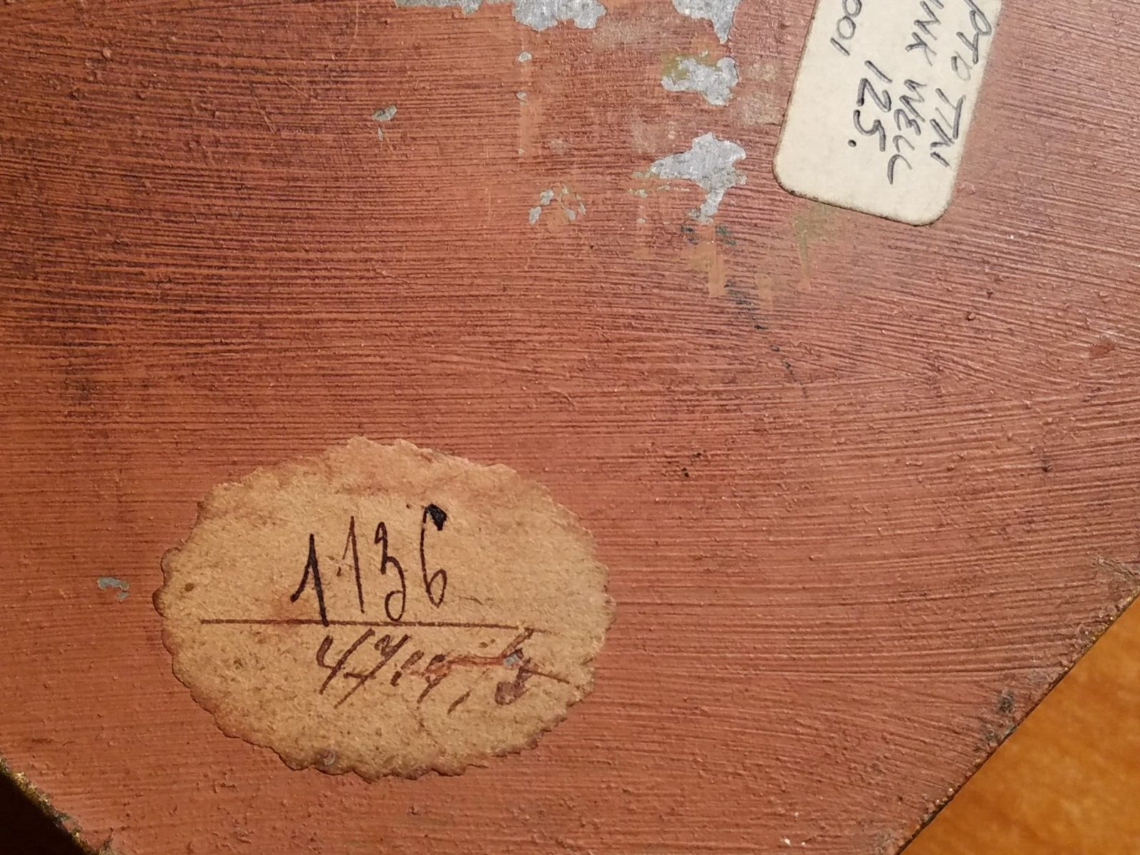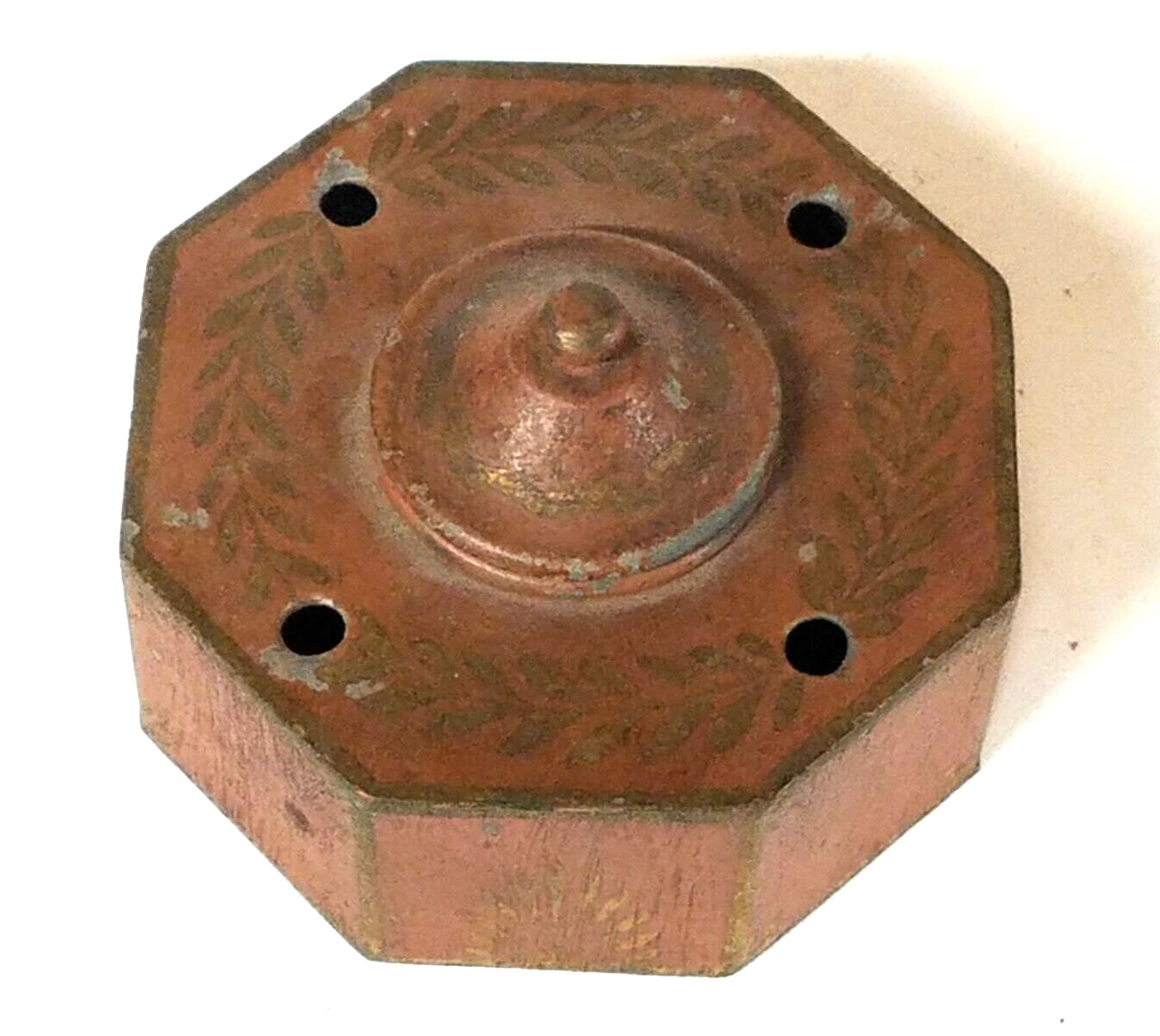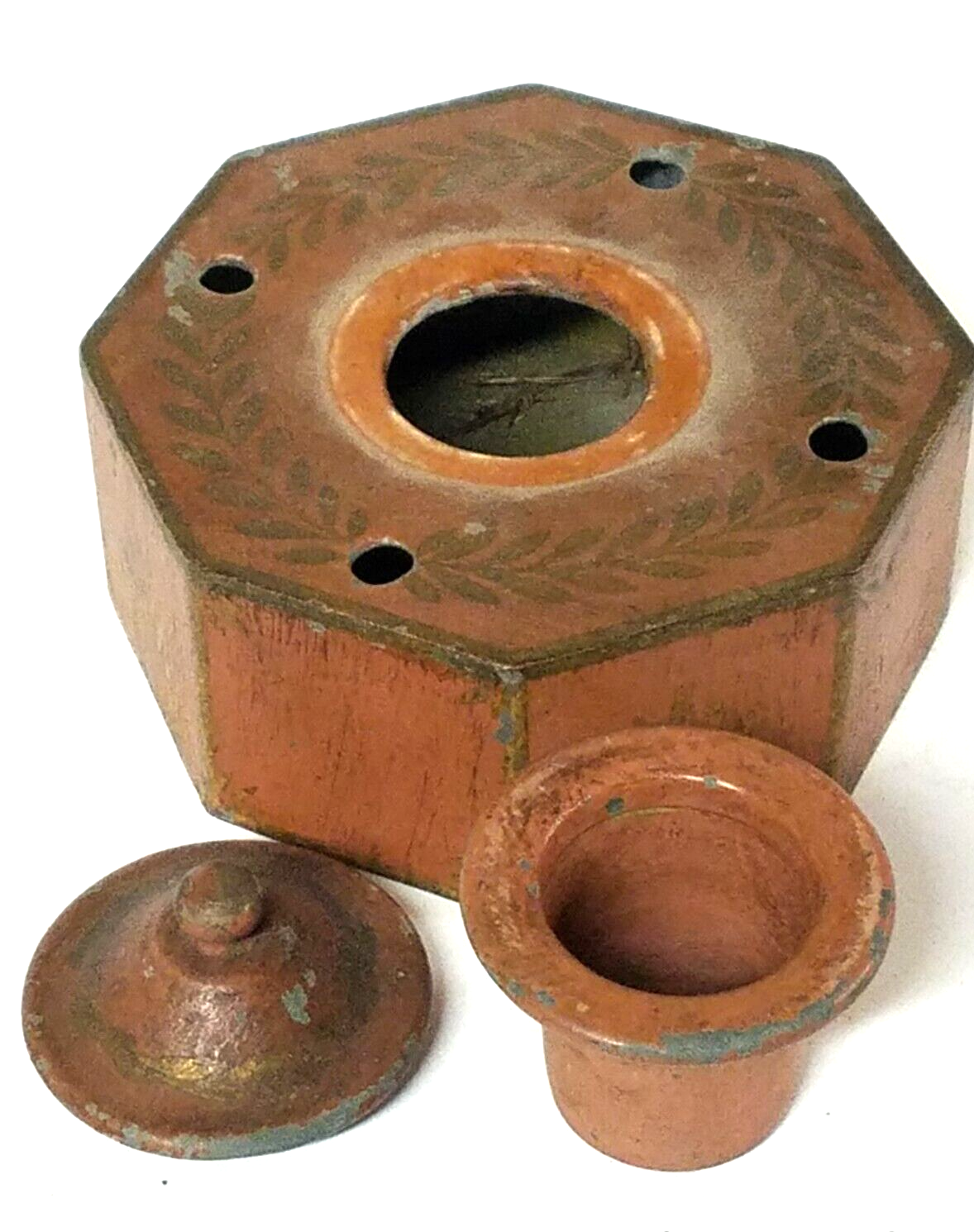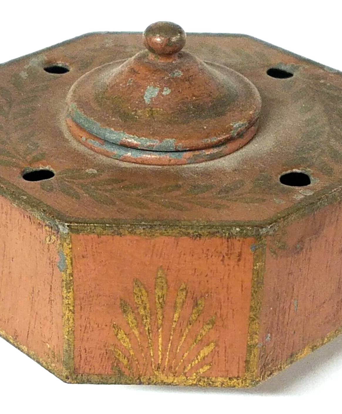 Unusual octagonal decorated tin inkwell with ceramic insert and tin lid.
