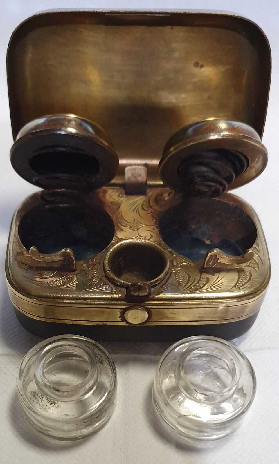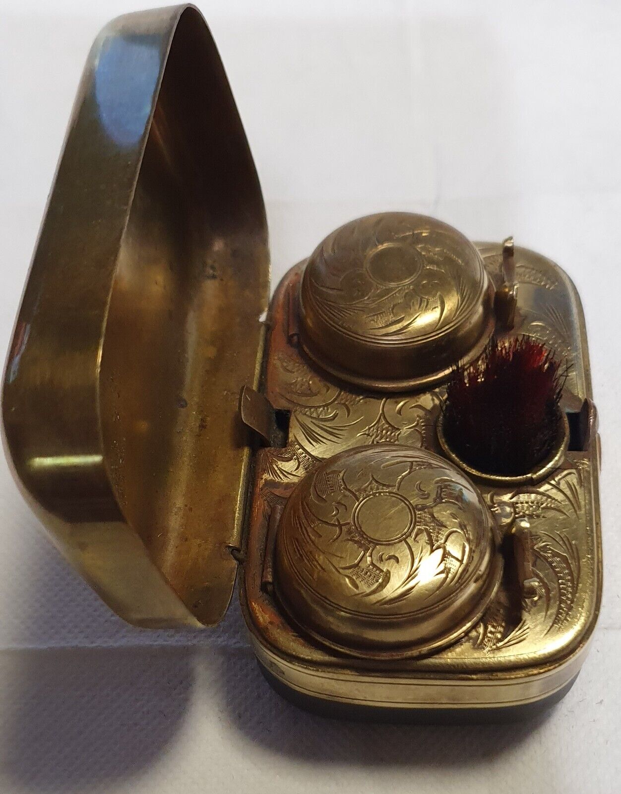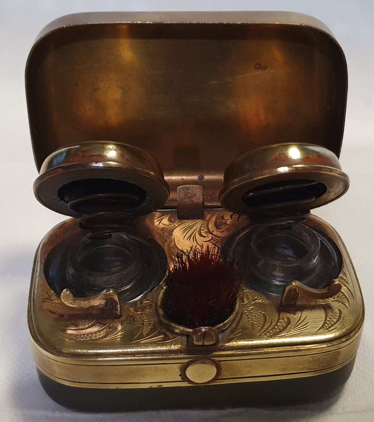 Brass-cased traveler with push button opening to an engraved body inside with two hinged inner lids to expose the glass ink bottles. Small brass clasps fit over the rims of the inner lids, when pushed to the side, the lid springs open. A pen wipe brush is in front.