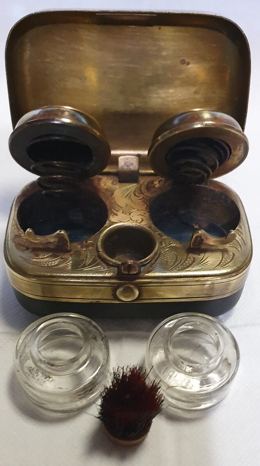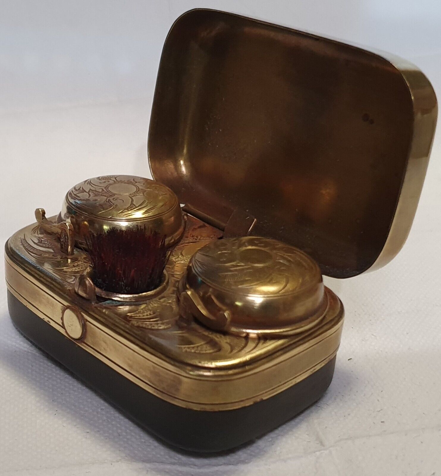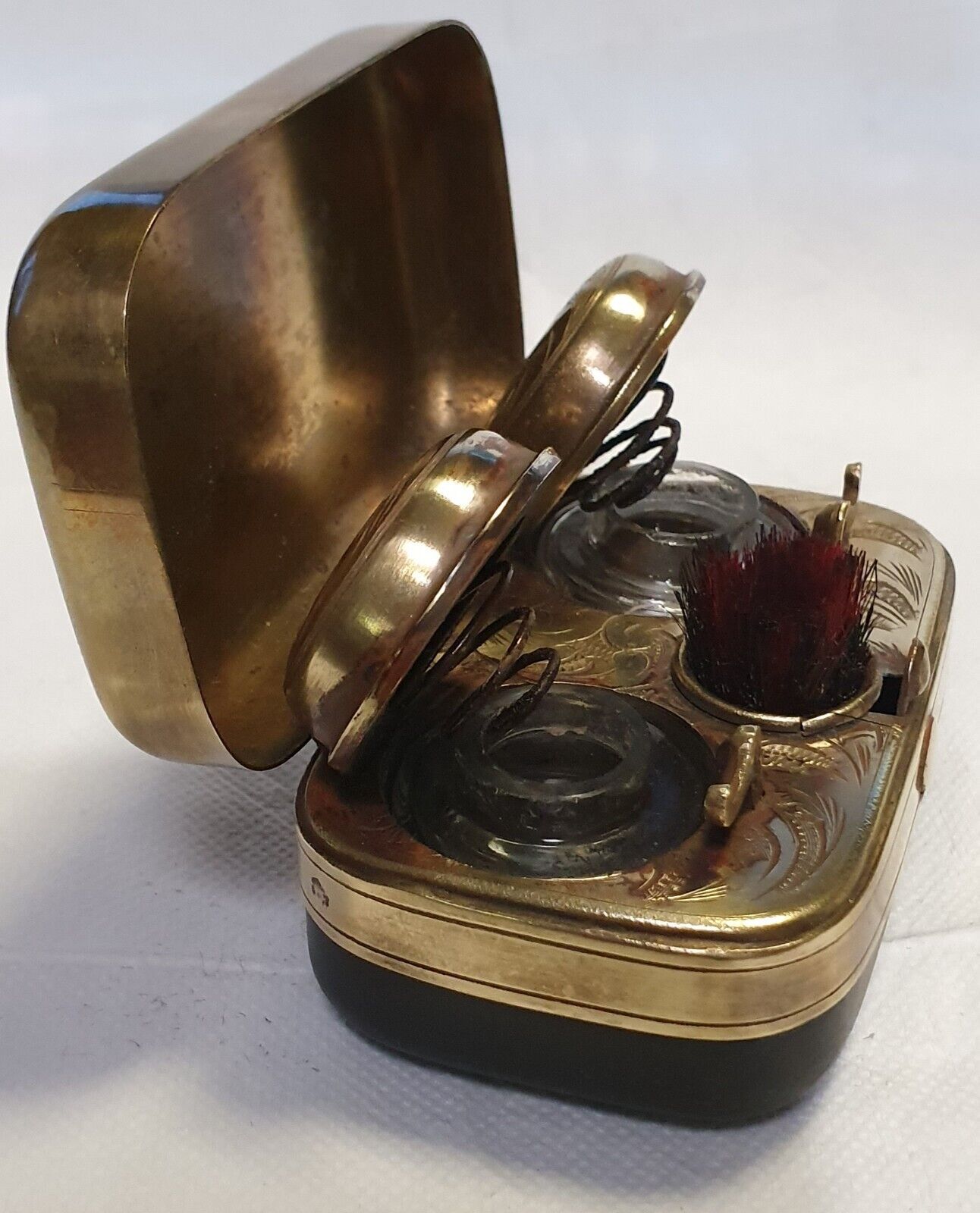 Brass-cased traveler with push button opening to an engraved body inside with two hinged inner lids to expose the glass ink bottles. Small brass clasps fit over the rims of the inner lids, when pushed to the side, the lid springs open. A pen wipe brush is in front.