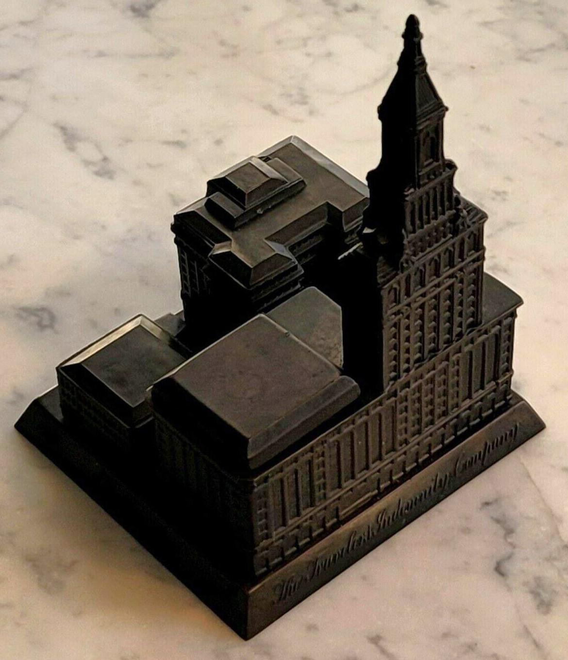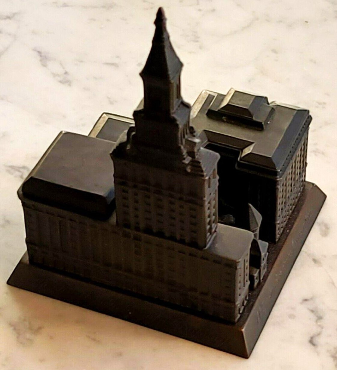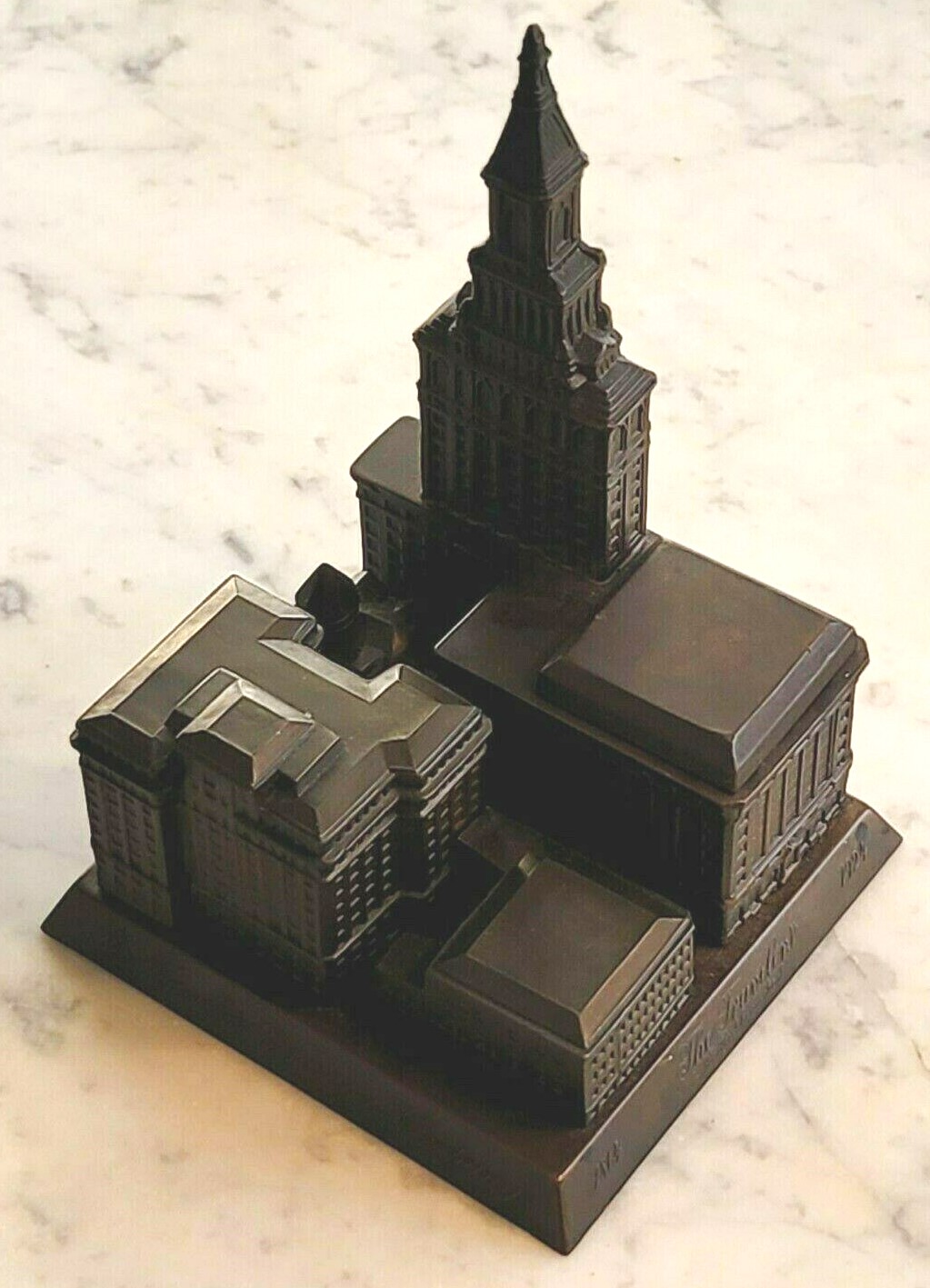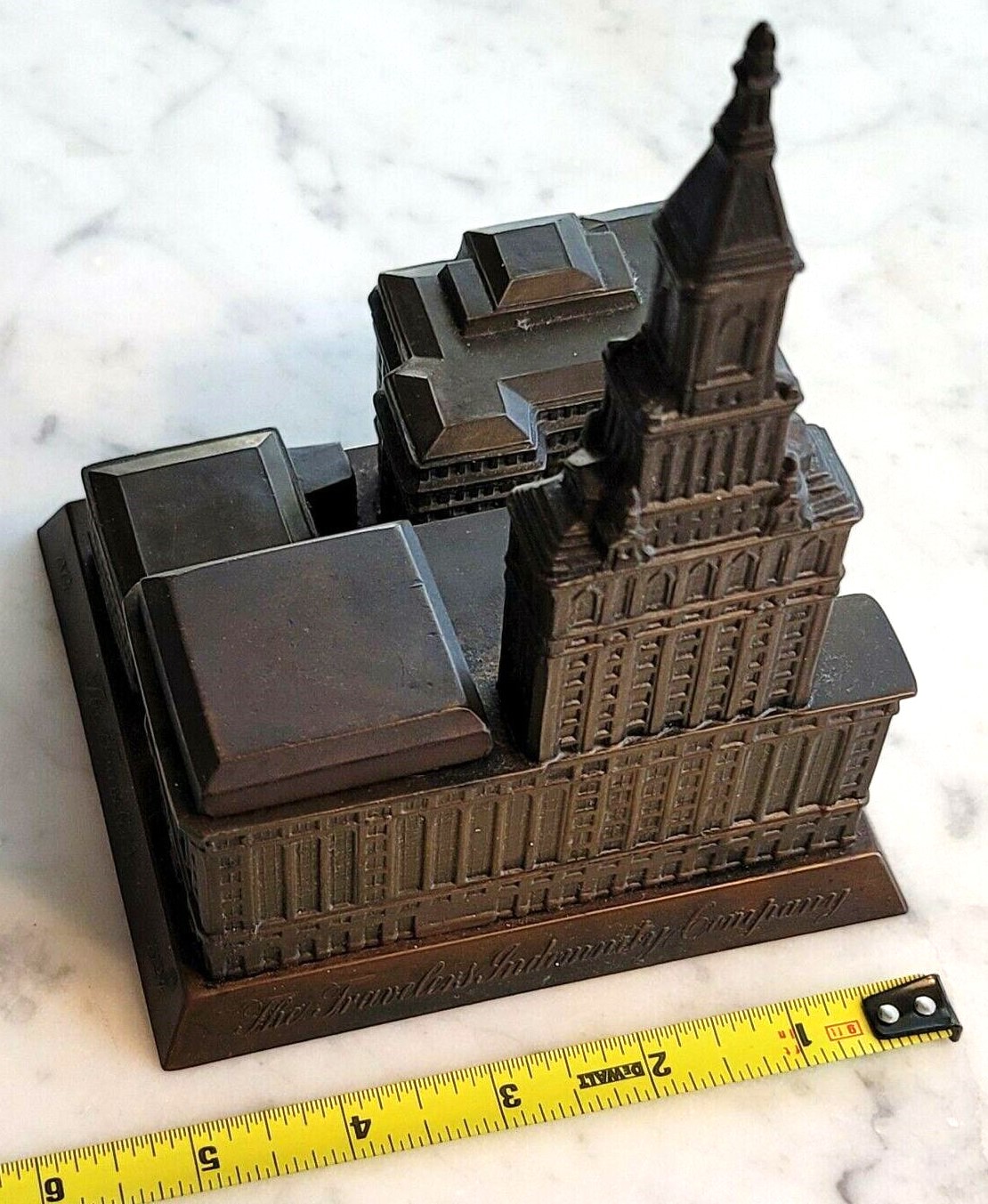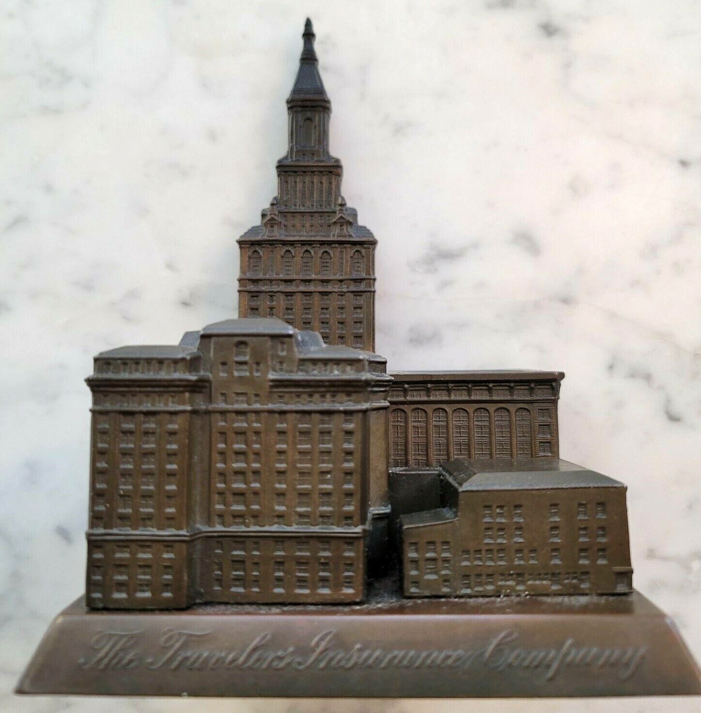 Embossed panels on the base read: The Travelers Insurance Company; Travelers Hartford Connecticut 1924. The first section of the Travelers building, built in 1906, was the Renaissance Revival-style structure facing Main Street in Hartford. The building expanded southwards with the 527-foot pointed tower (24 stories), featuring classical influences designed by architect Donn Barber. In 1919, this was the tallest building in New England and the seventh tallest in the world.
