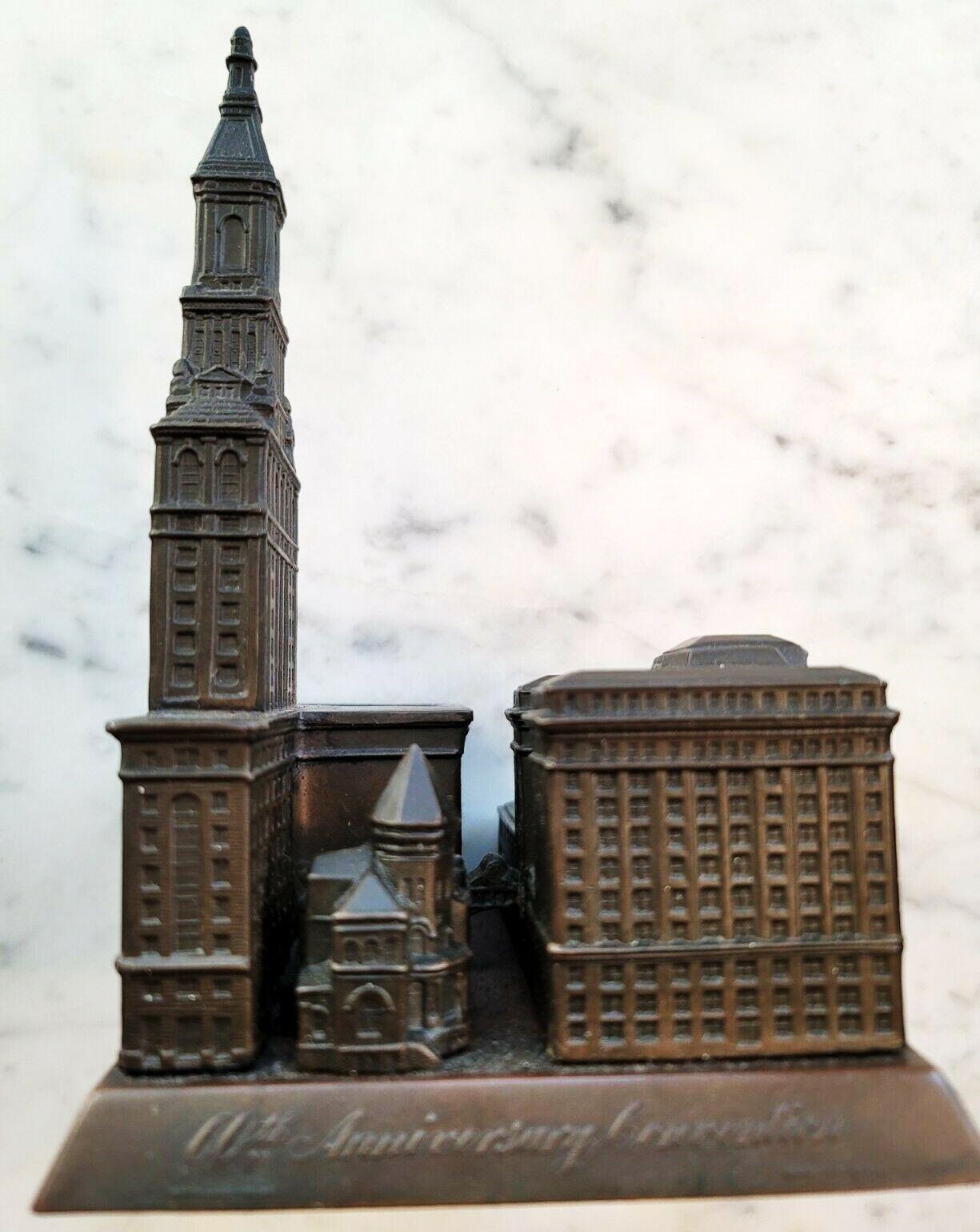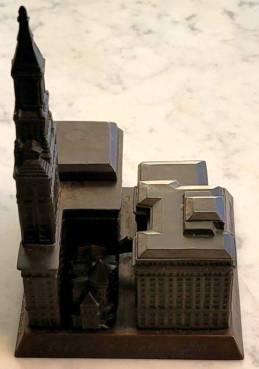 Metal building with an inkwell crafted by Whitehead & Hoag in 1924 to commemorate the 60th anniversary of The Travelers Indemnity and Insurance Company of Hartford, Connecticut (1864-1924). This detailed rendering shows windowpanes and a third-floor pedestrian bridge between the buildings.