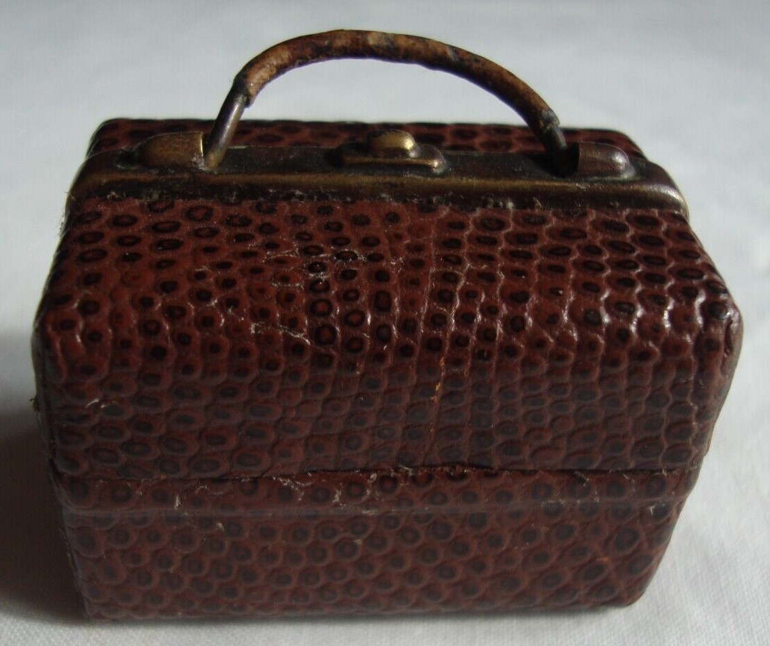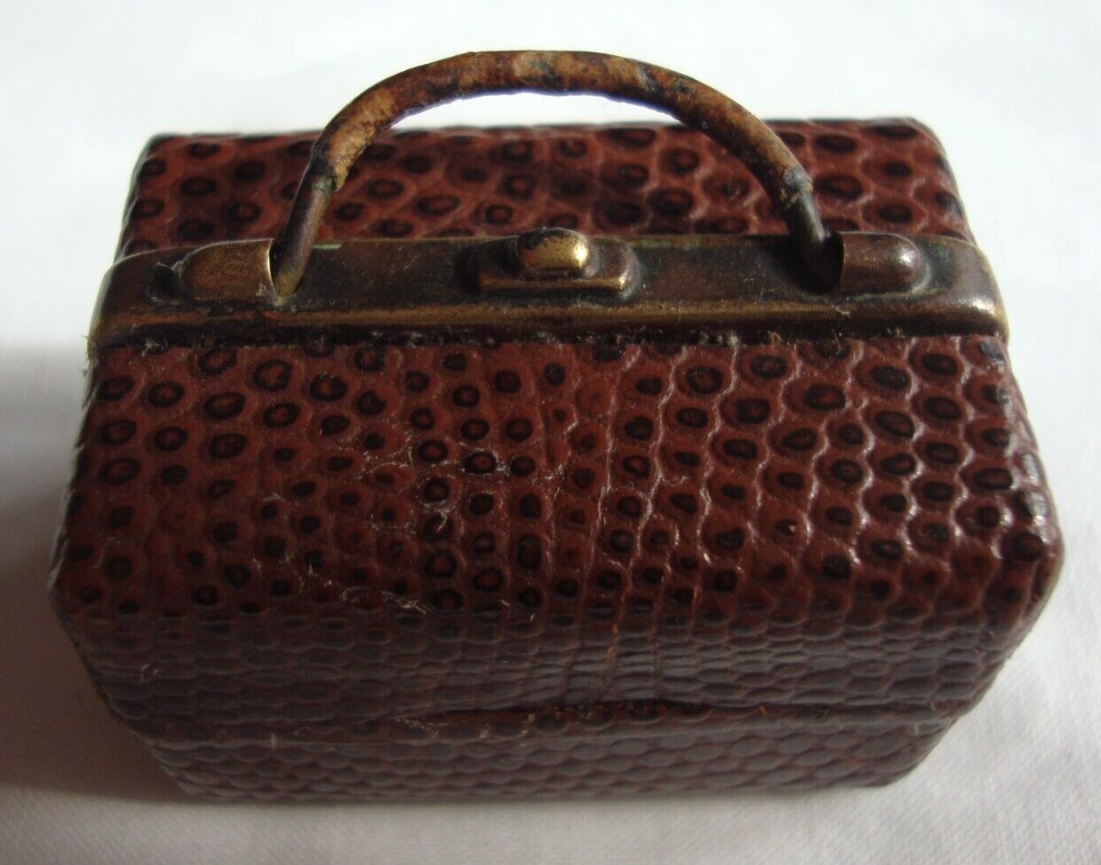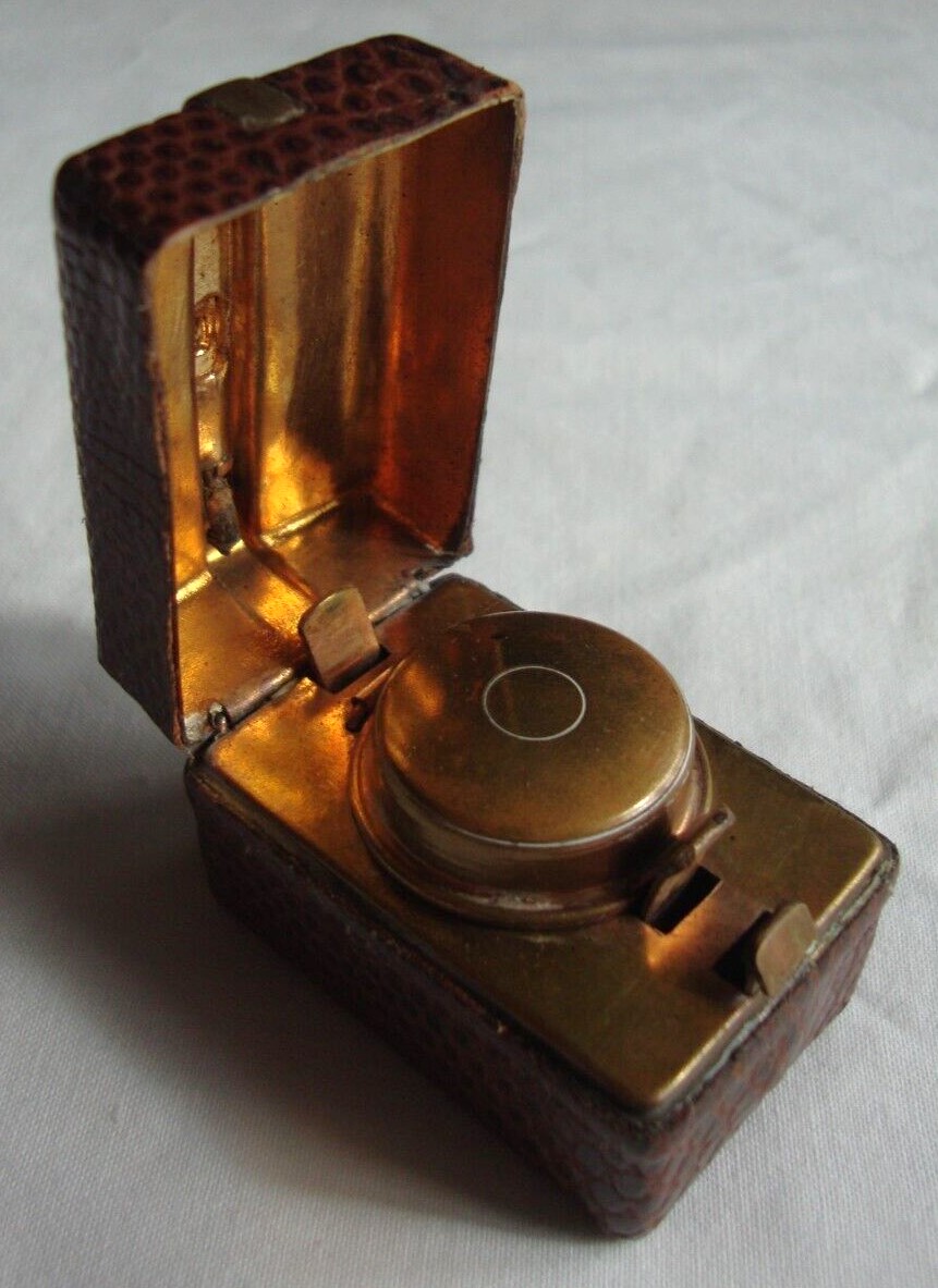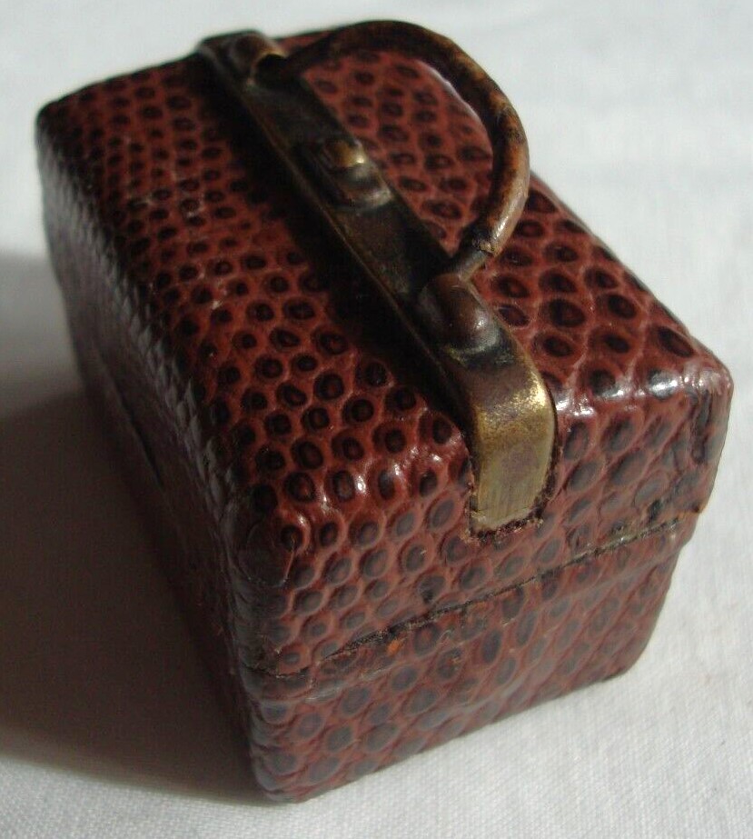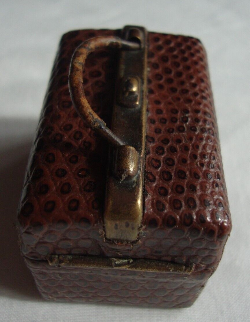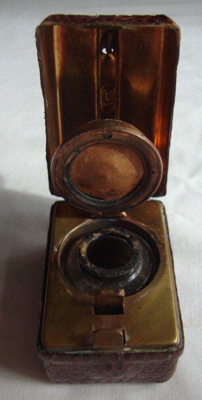 Miniature figural bag-shaped traveling inkwell. The button in front releases the lid with a spring action and the inner catch similarly releases the top which covers the glass ink bottle. Brown textured leather resembling crocodile skin covers the piece.