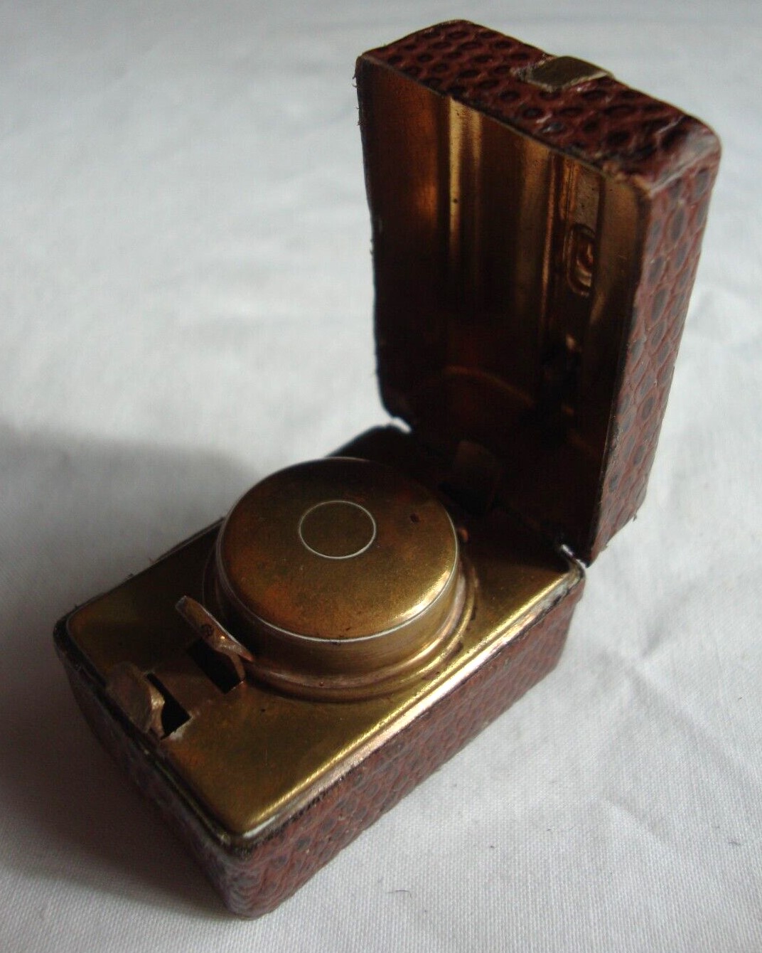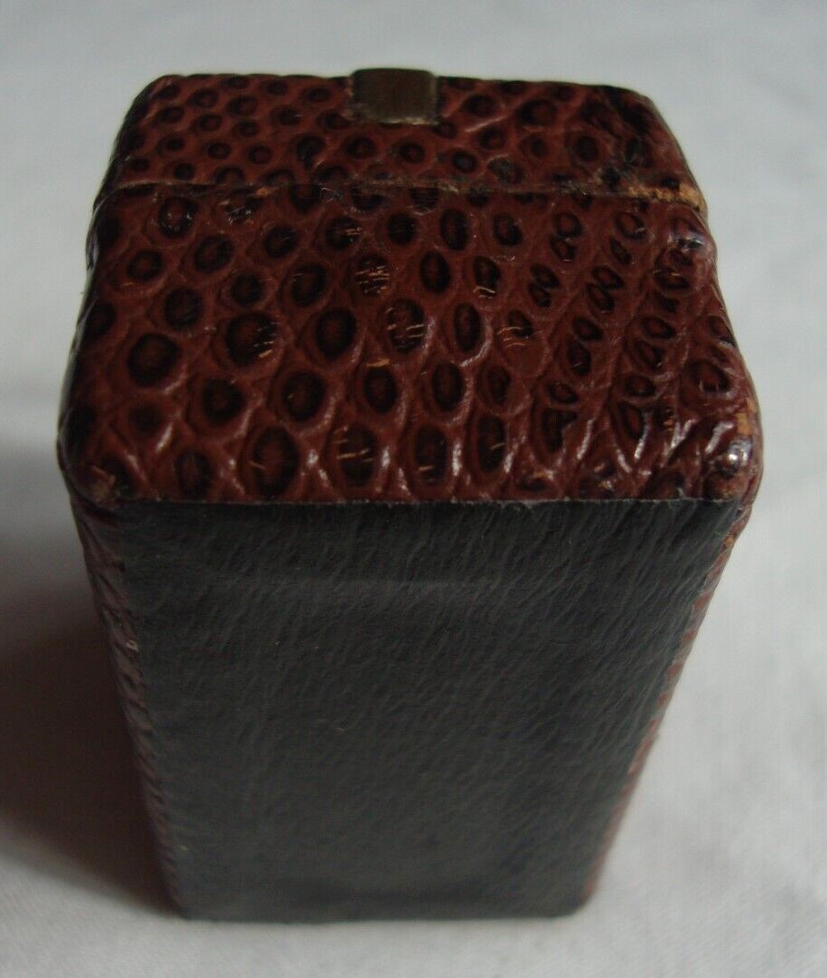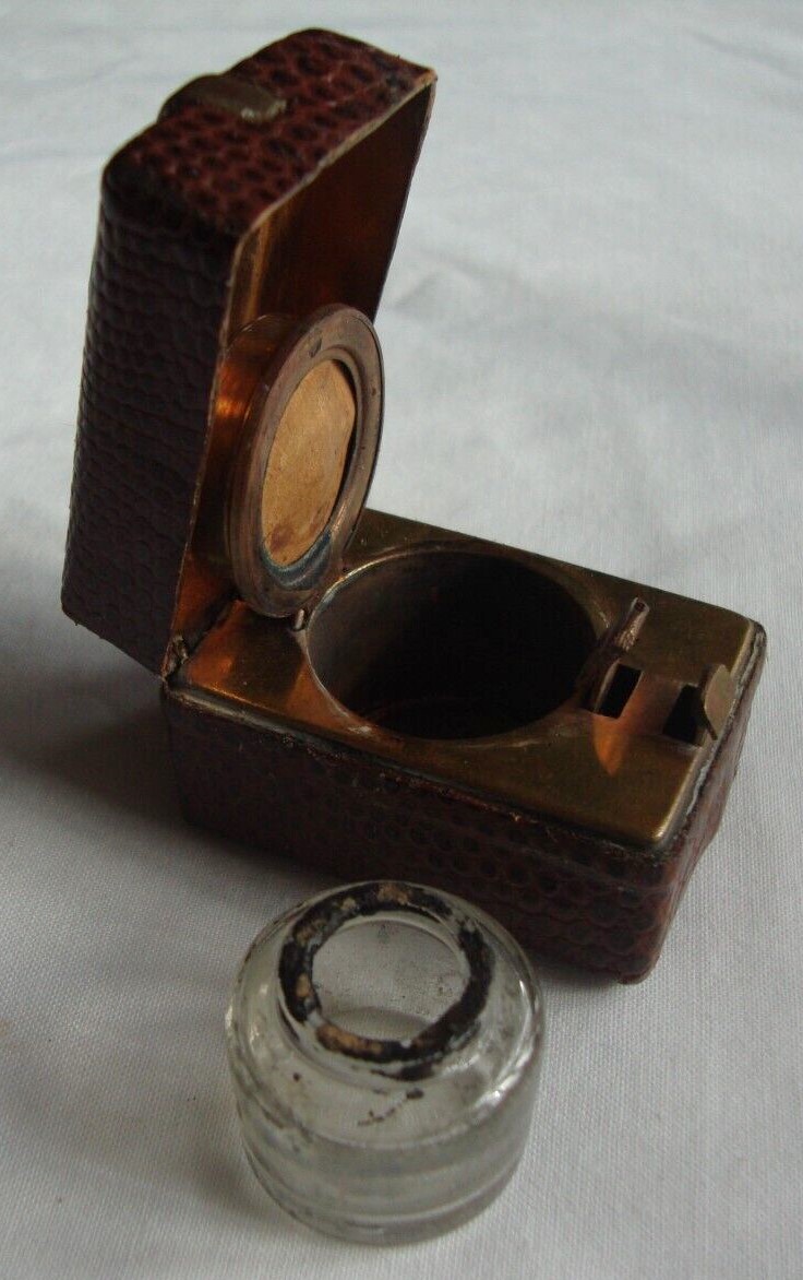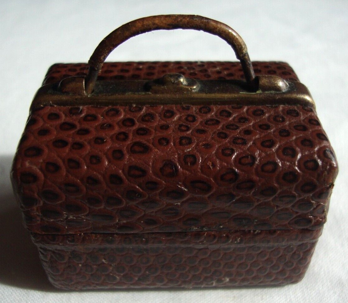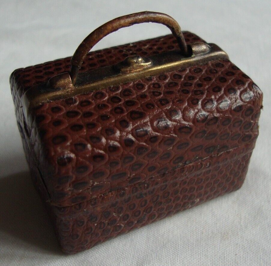 Miniature figural bag-shaped traveling inkwell. The button in front releases the lid with a spring action and the inner catch similarly releases the top which covers the glass ink bottle. Brown textured leather resembling crocodile skin covers the piece.