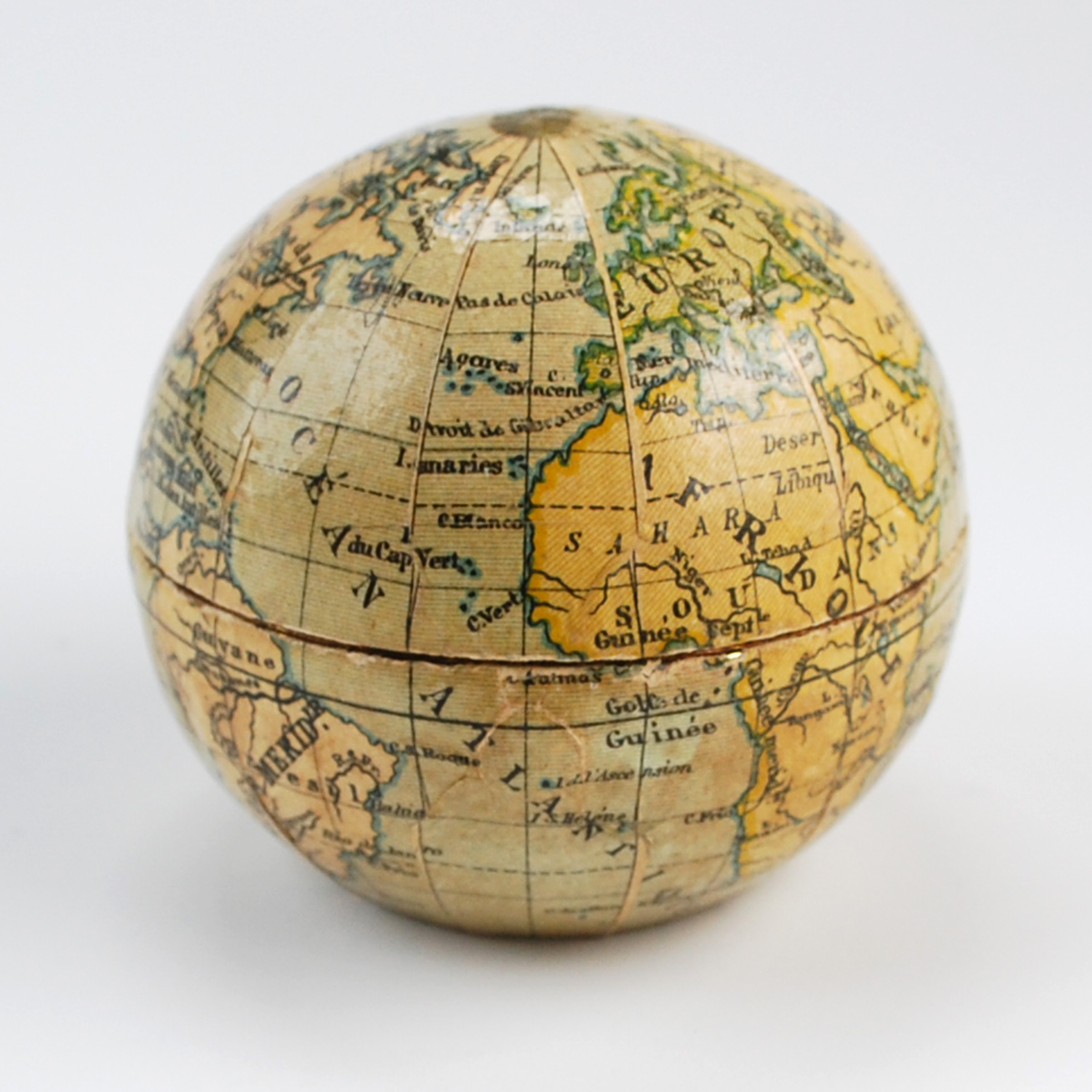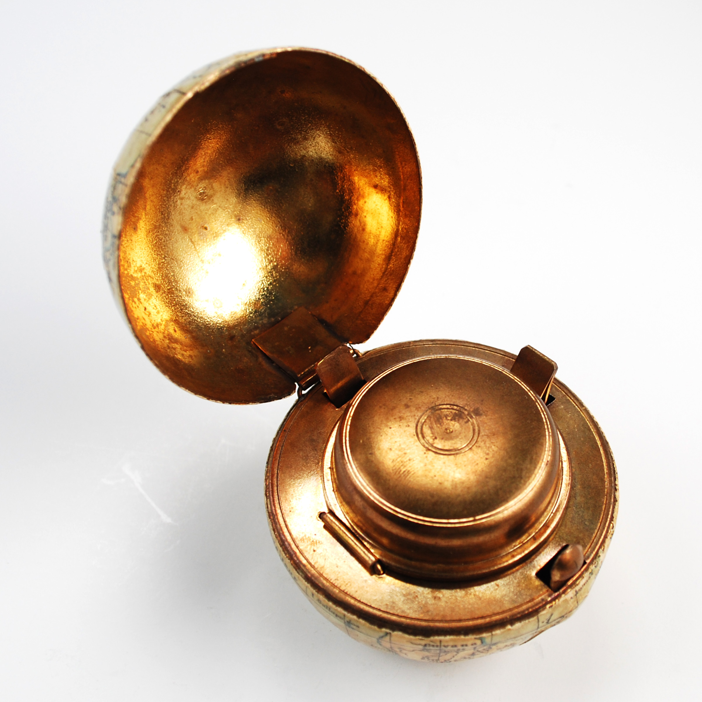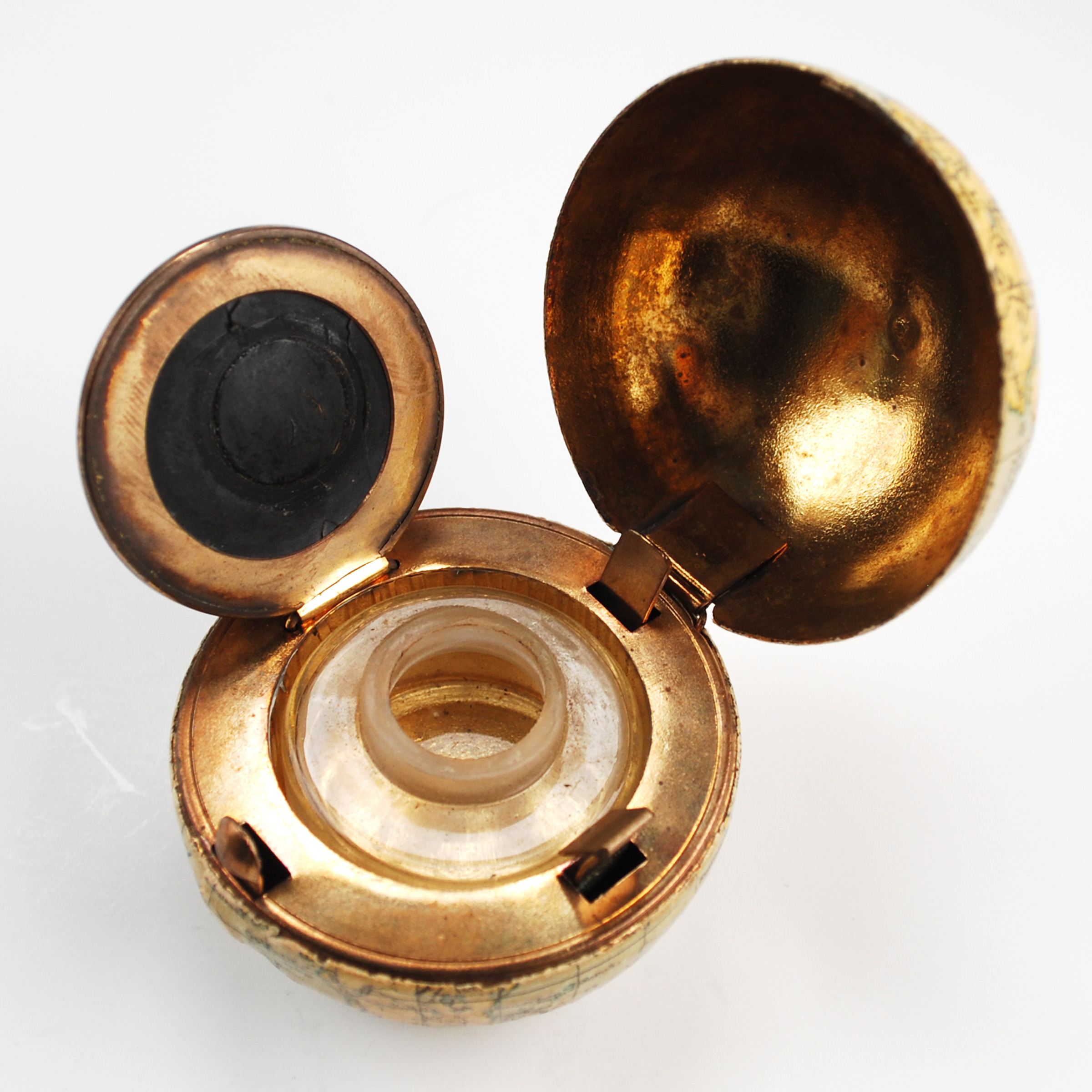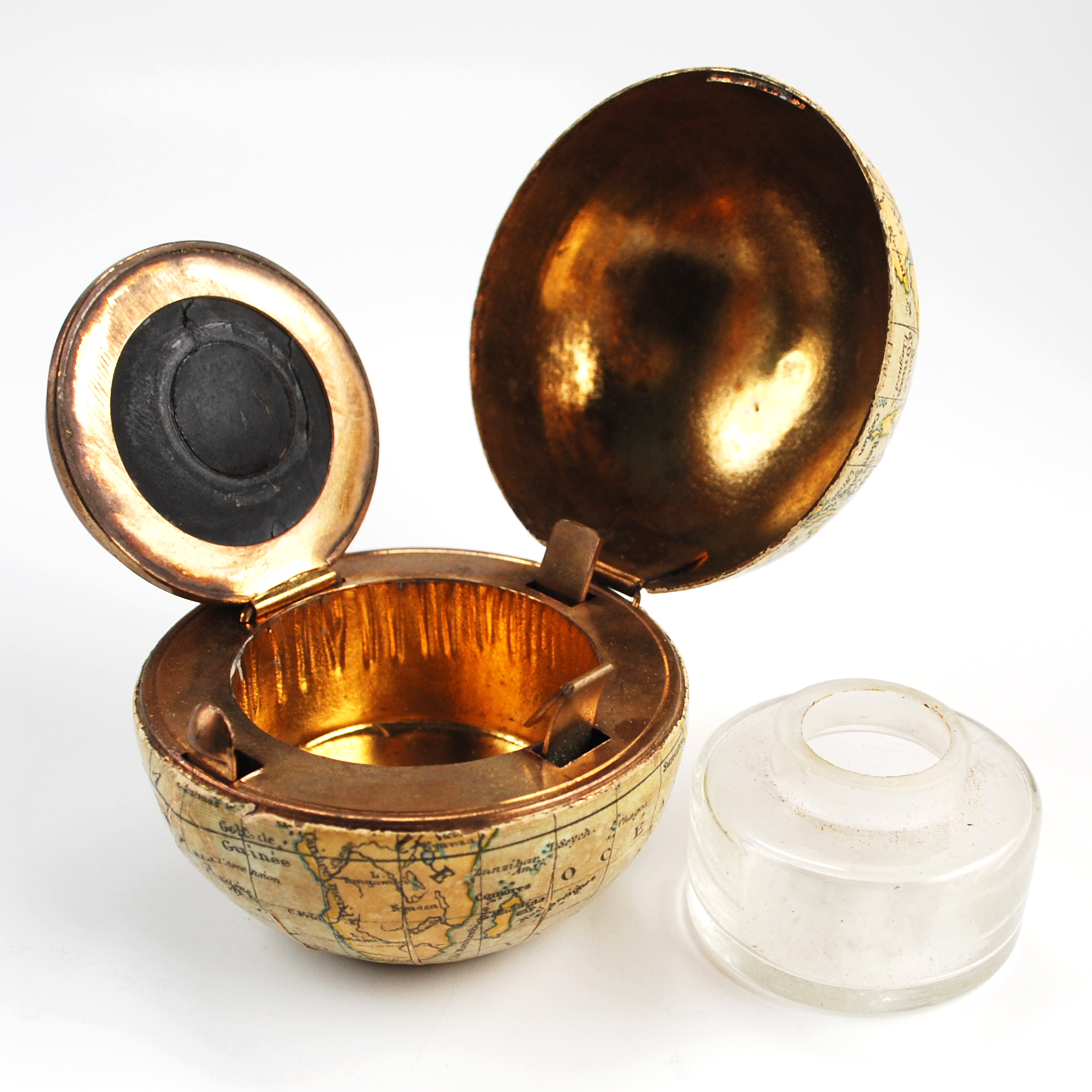 “Traveling” inkwells were made for people to use while riding on a train, ship or otherwise traveling. They were small and made in ways that kept the ink inside from spilling. And they were often made as novelty items, in fun and sometimes unusual shapes. This one is round, but it has had map panels glued to the outside to give it the appearance of a globe.