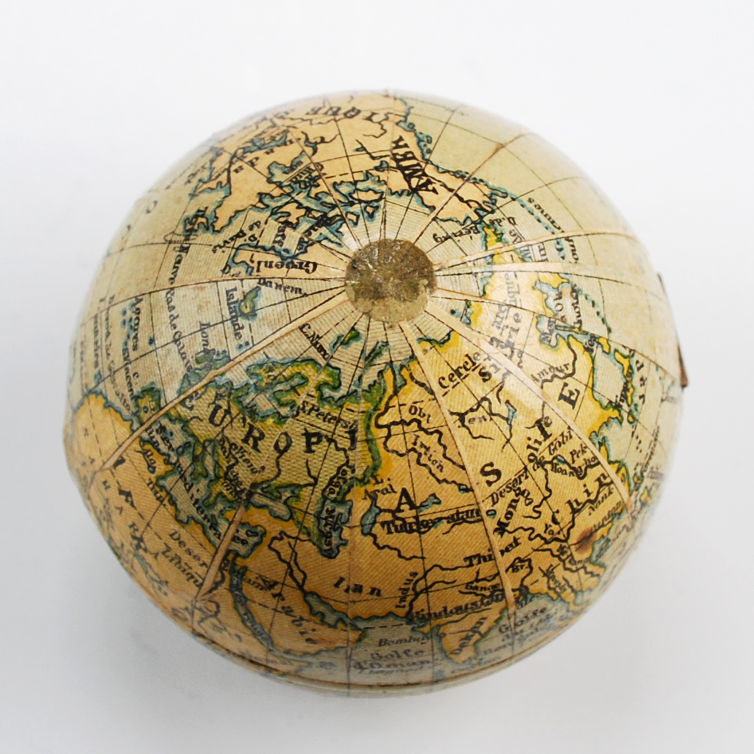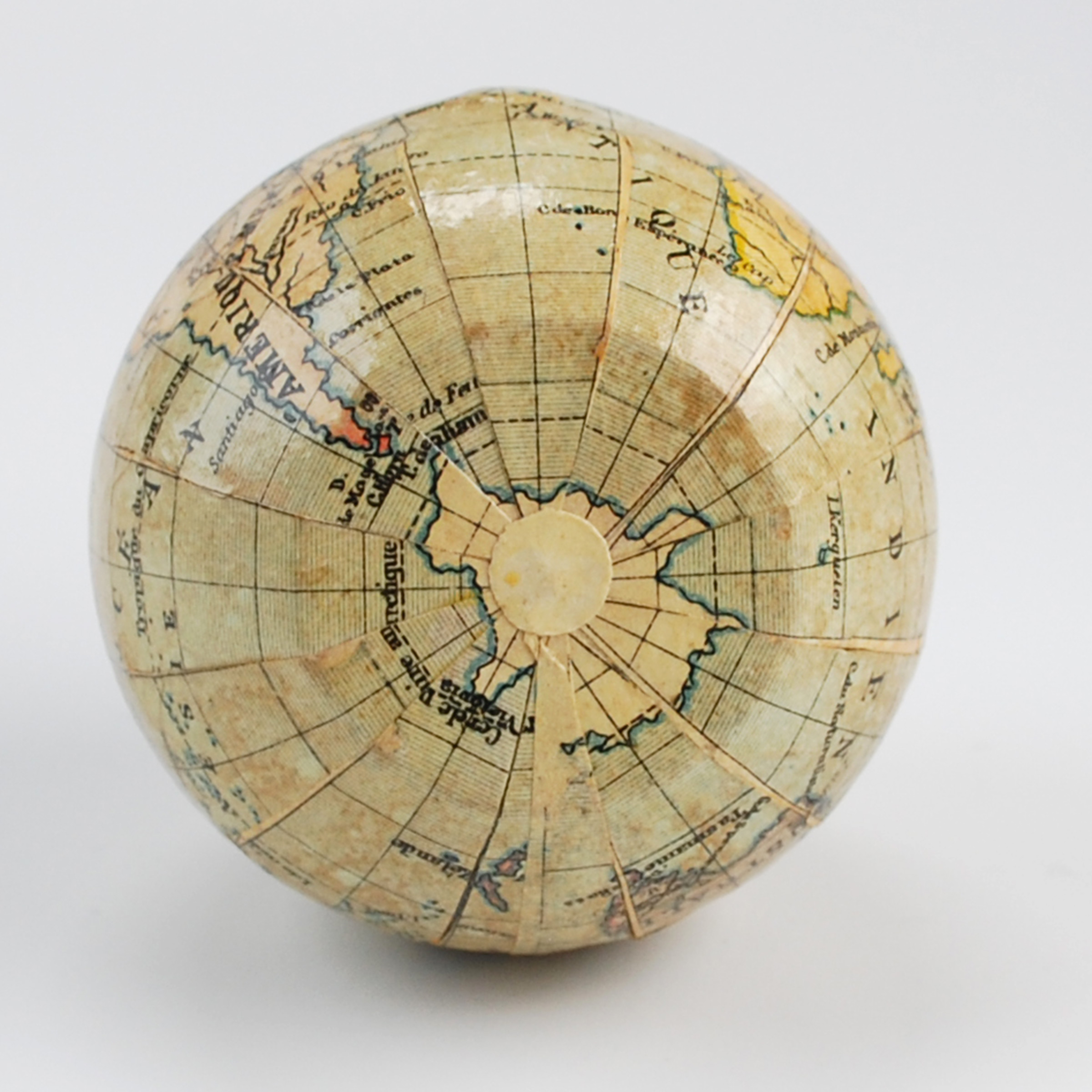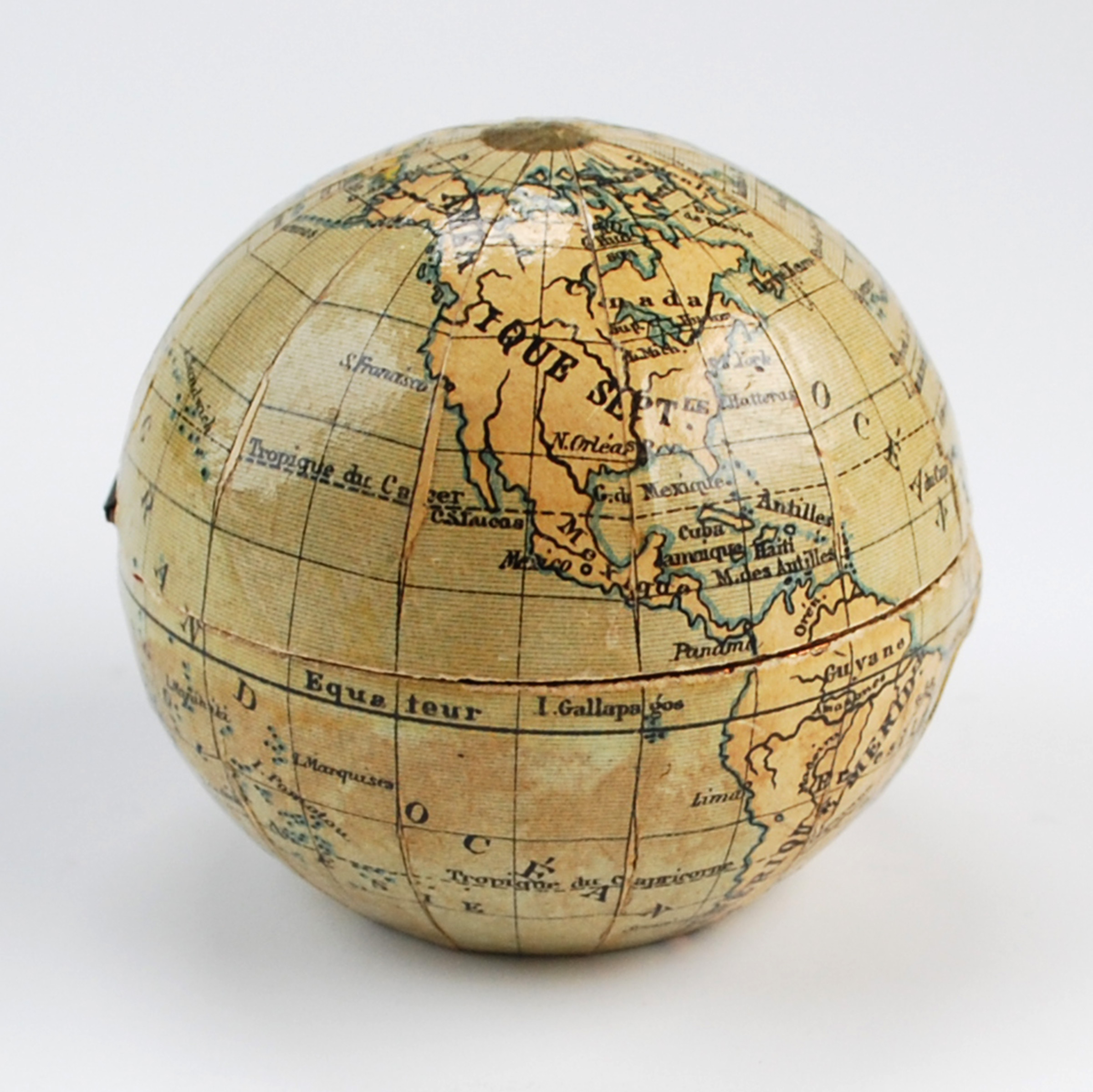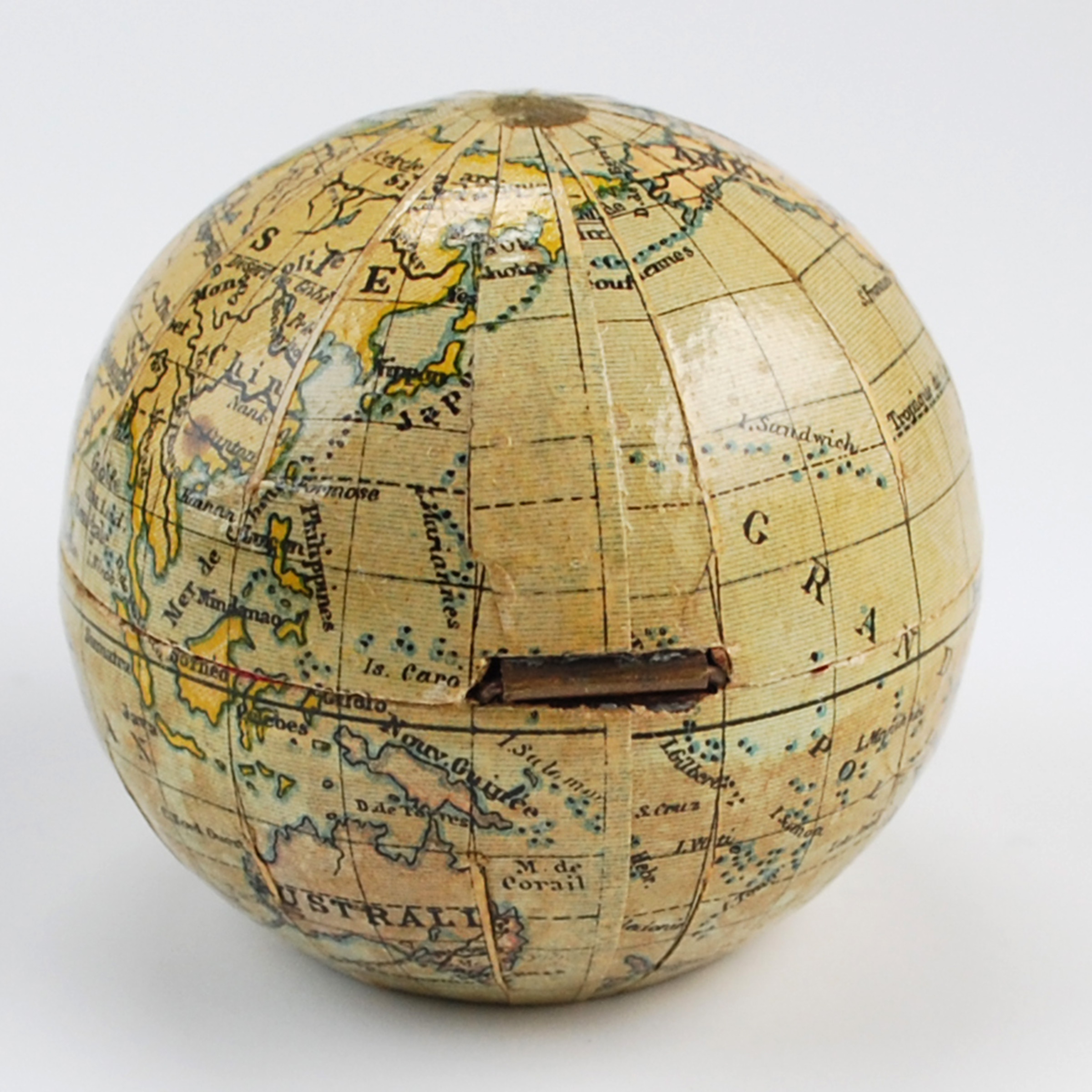“Traveling” inkwells were made for people to use while riding on a train, ship or otherwise traveling. They were small and made in ways that kept the ink inside from spilling. And they were often made as novelty items, in fun and sometimes unusual shapes. This one is round, but it has had map panels glued to the outside to give it the appearance of a globe.