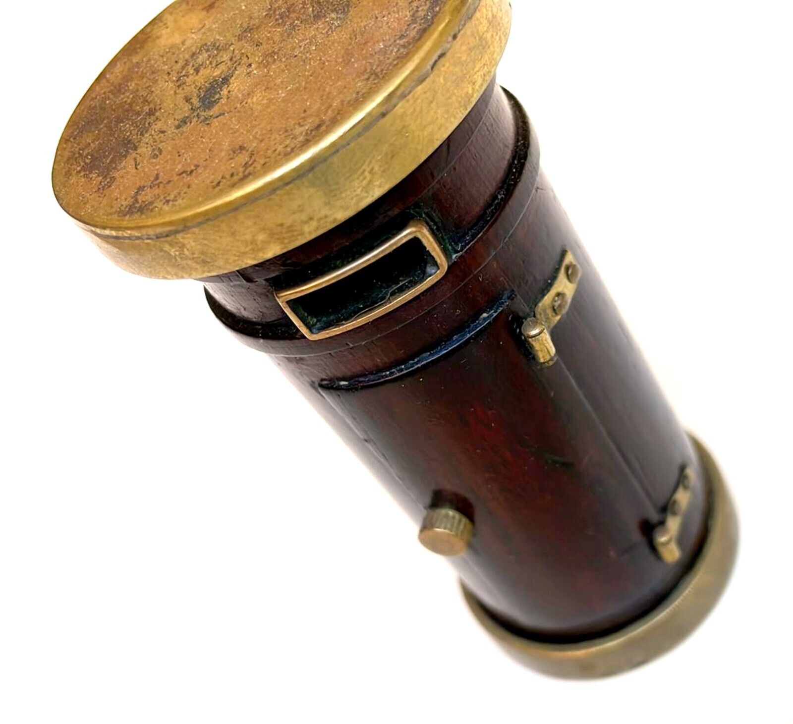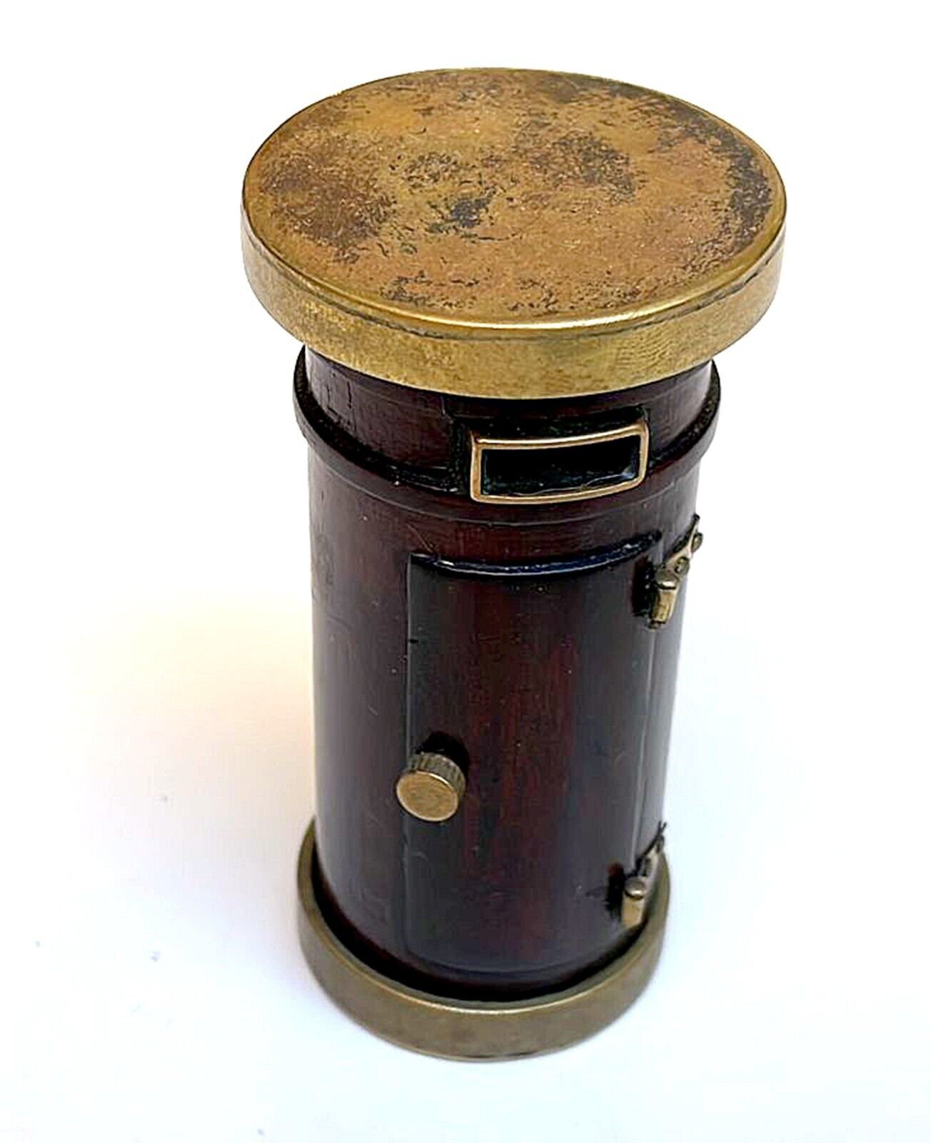 A traveling inkwell in the form of a postbox. Made in wood and brass, the inkwell inside is pressed glass. The cover fits by thread.