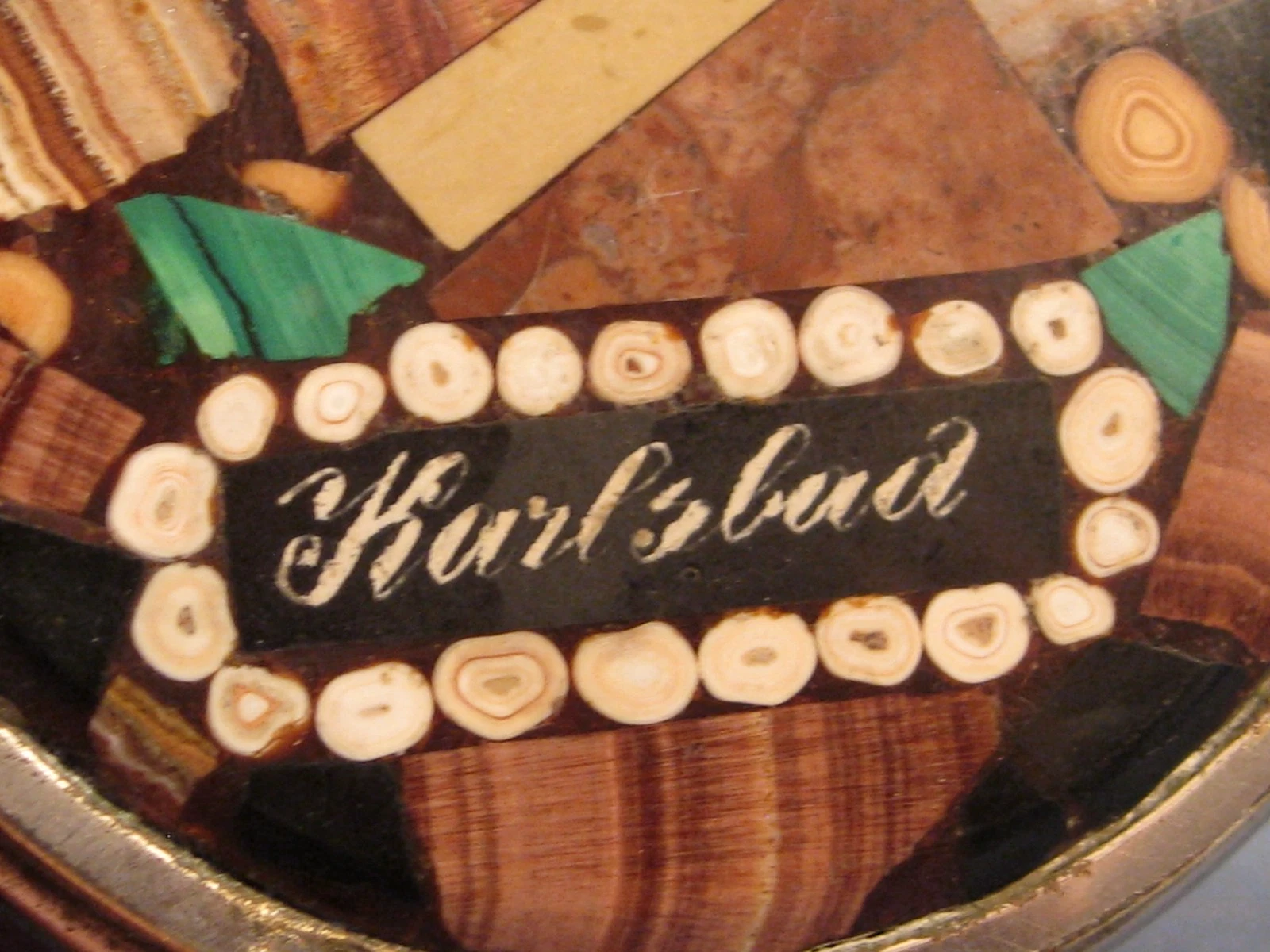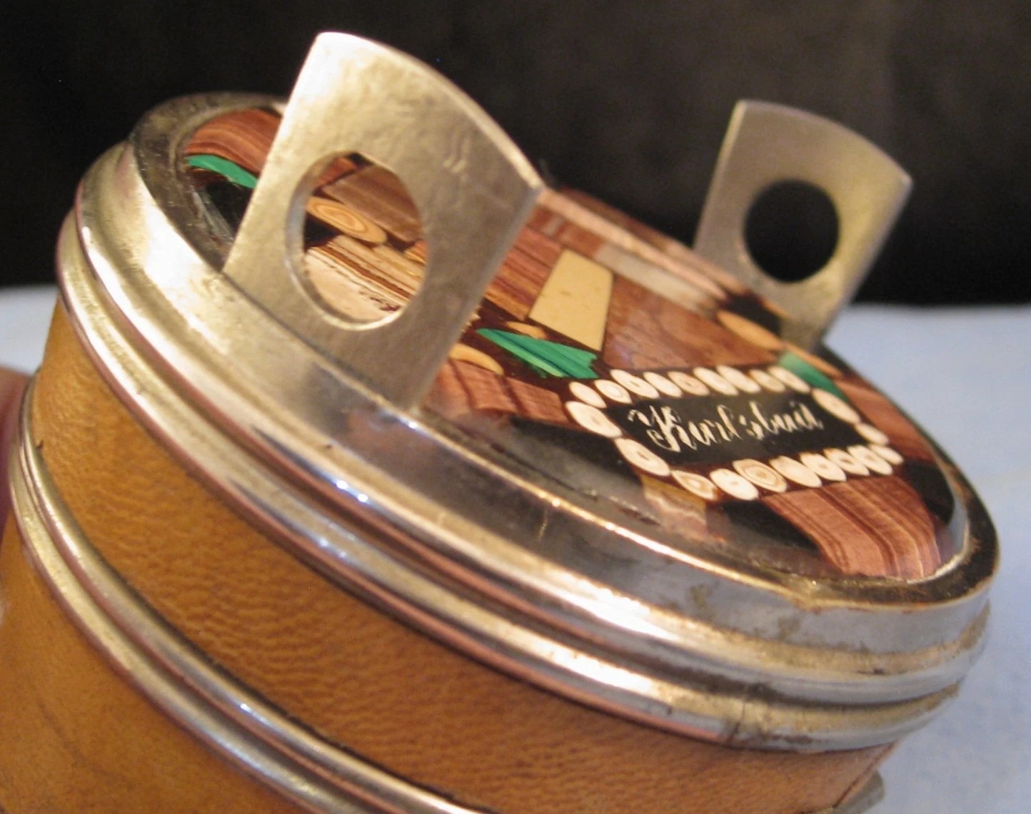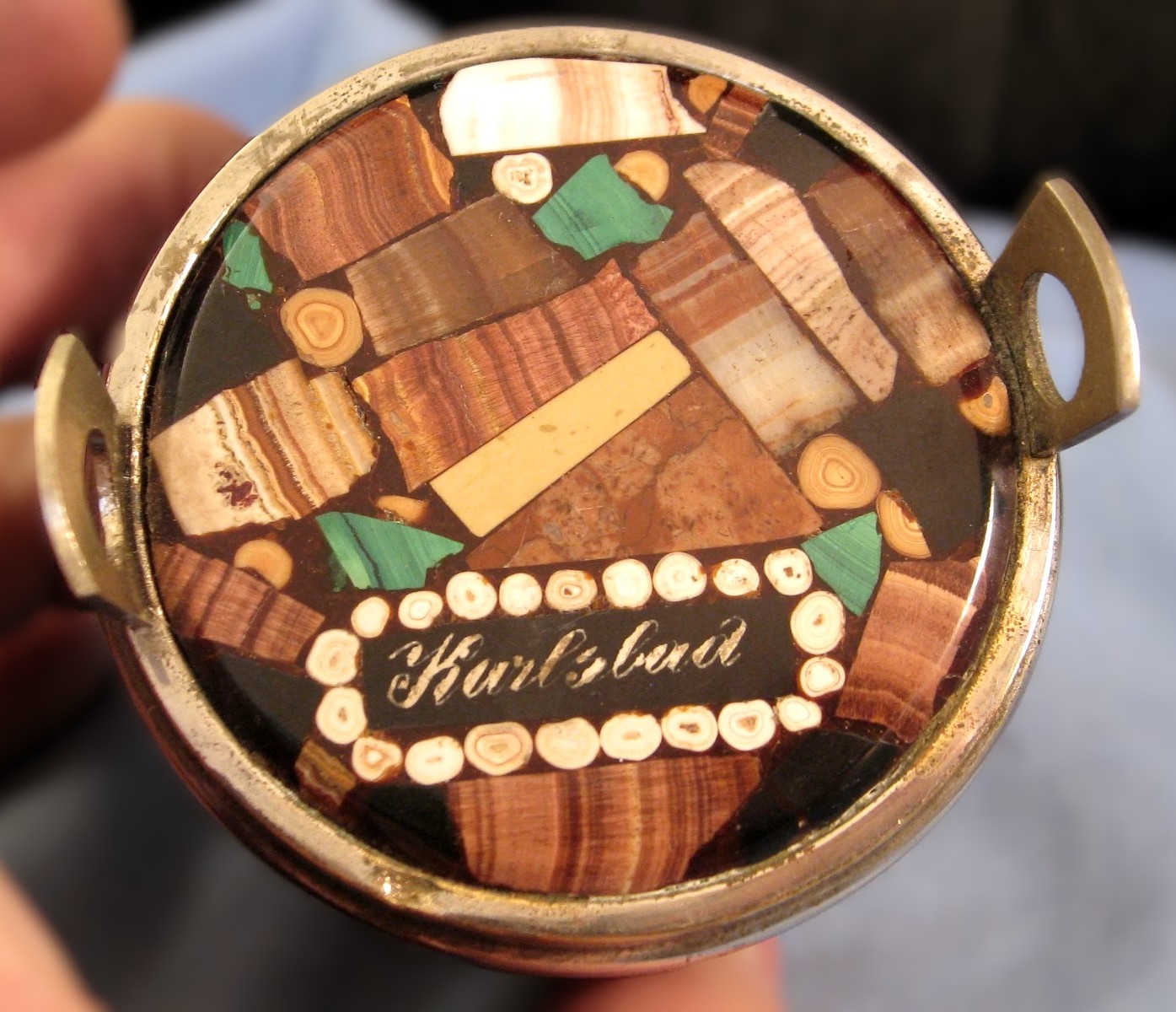 - The Lid (Stone Inlay): This is a specialized local craft known as “Karlsbad Mosaic.” The lid is made of Aragonite (specifically a variety called Sprudelstein or “thermal spring stone”), which is a mineral deposited by the town’s hot springs. The brown/tan banded sections are the Aragonite, while the vibrant green sections are Malachite. These were polished into a flat mosaic and often sealed with a clear resin or glass to protect the stones.