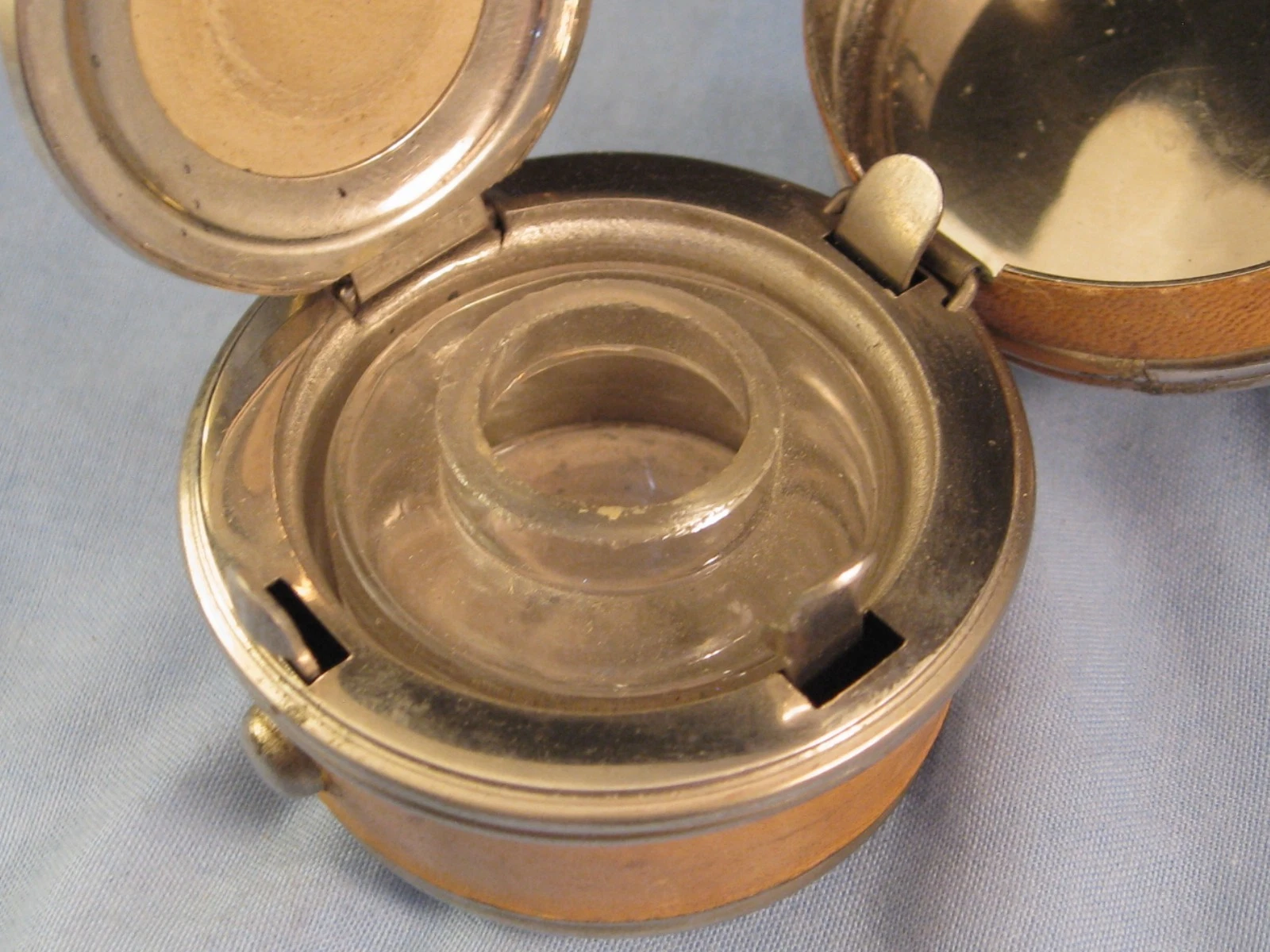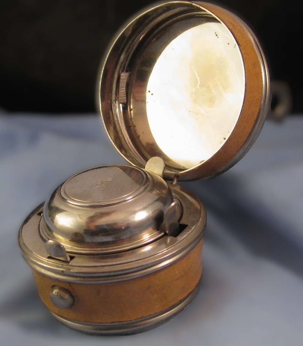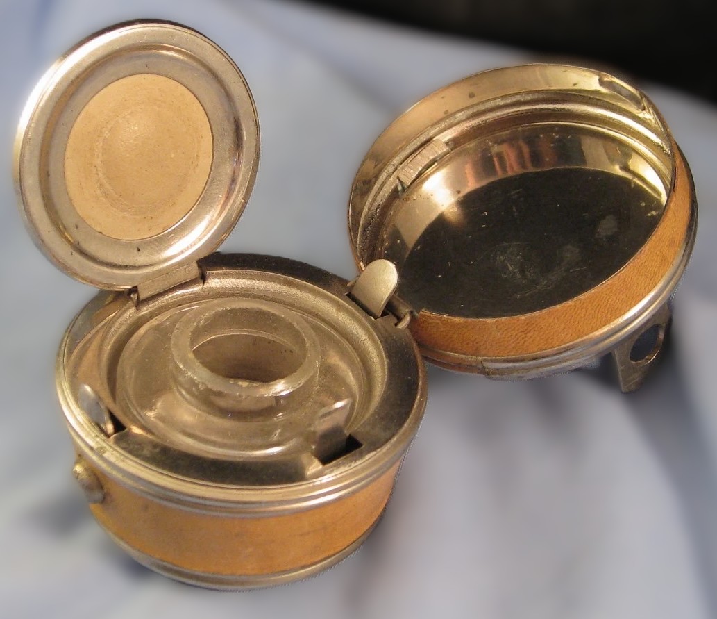 - The Mechanism: The button release and the inner lever-operated lid (with its leather “gasket” or stopper) identify this as a “Safety” inkwell. The leather seal was essential for travelers to prevent the ink from leaking out during the rough vibrations of carriage or rail travel.