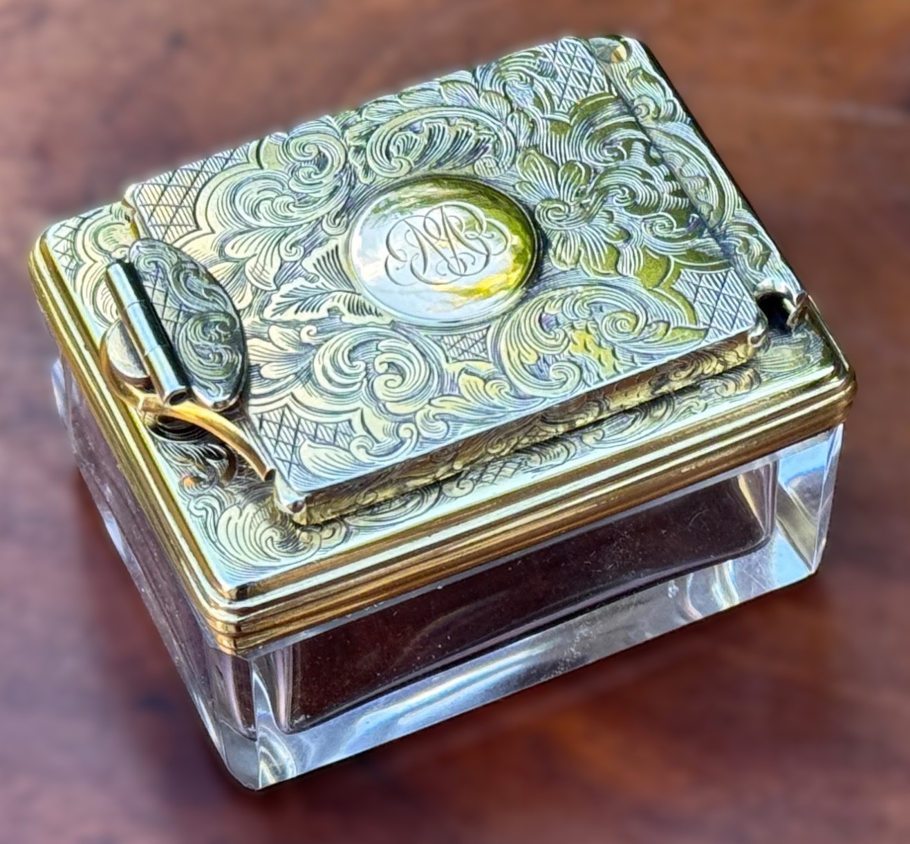 - Silver Top: A sterling silver collar is fitted tightly around the rim of the glass base. This collar holds the hinged lid and the locking mechanism.